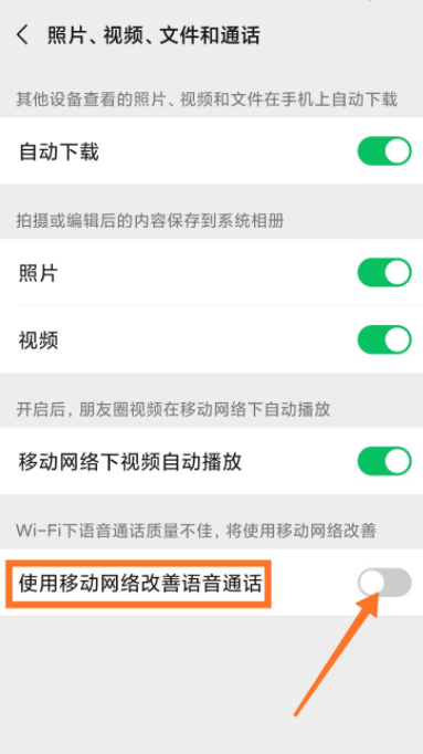 现如今,无线WiFi已经逐渐进入了我们的日常生活,无论是刷视频、追剧,还是视频语音通话,大家都习惯使用WiFi。当然了,如果你担心在WiFi环境下进行微信语音通话会出现信号弱的情况,小编建议设置使用移动网络改善语音通话,方法如下。 微信如何开启改善语音通话功能? 打开手机微信,进入界面,点击右下角的【我】,选择【设置】选项,  进入设置界面,如图,点击箭头指示的【通用】选项,  进入通用界面,点击【照片、视频、文件和通话】选项,找到【使用移动网络改善语音通话】功能,   软件默认关闭该功能,点击开启,如果WiFi环境下微信语音通话质量不佳,即可使用移动网络进行改善。  了解更多精彩教程资讯,关注wmzhe.com。 - 寸长尺技拼音:cùn cháng chǐ jì释义:犹言微才薄技。出处:《二刻拍案惊奇》卷三九孟尝君平时养了许多客,今脱秦难,却得此小人之力,可见天下寸长尺技,俱有用处。”示例:无