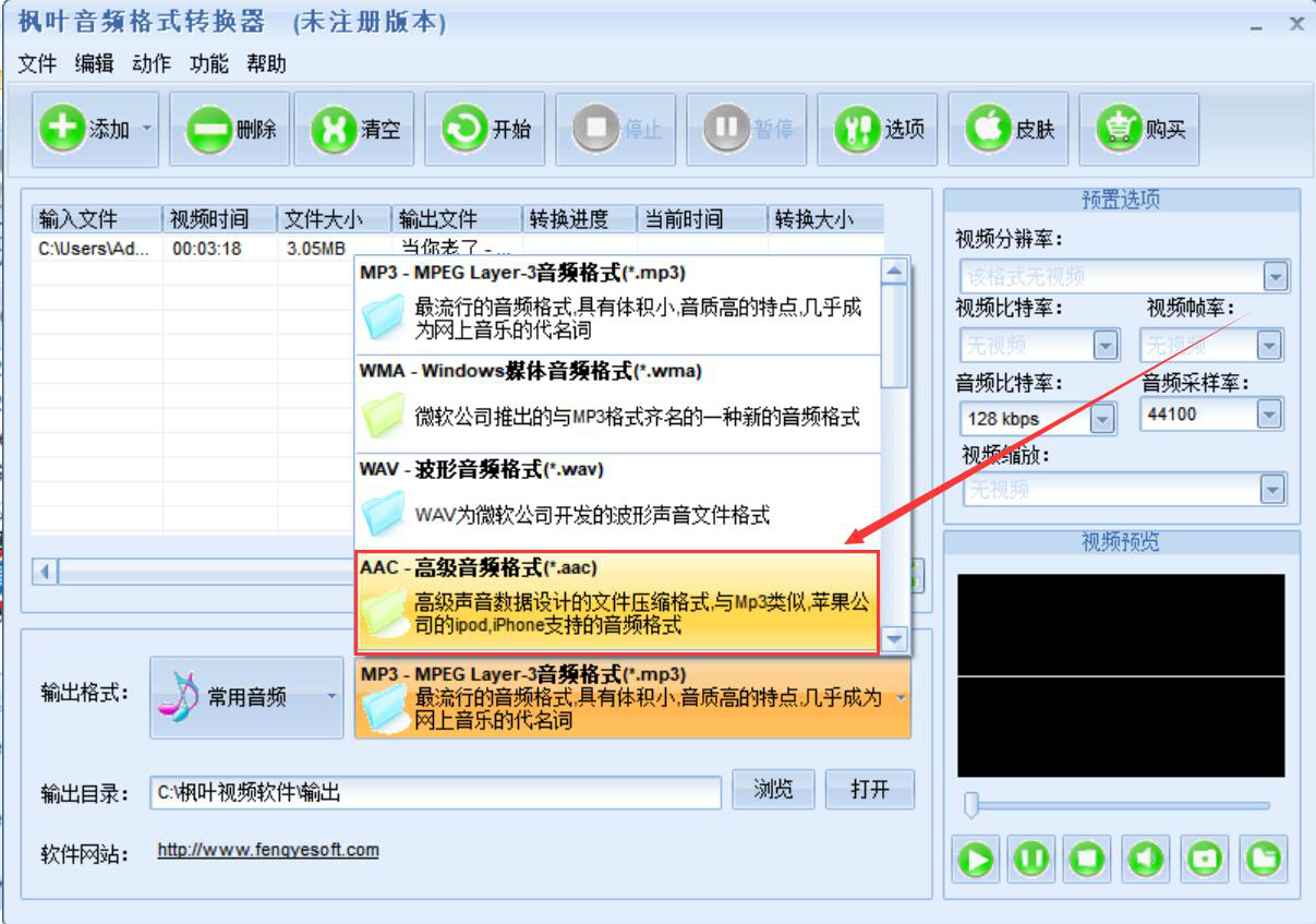 很多苹果手机用户,将电脑上的MP3音频拷贝到手机后,却发现文件打不开,出现这样问题的原因是音频的格式不支持。为了解决问题,我们可以用枫叶音频格式转换器将MP3转换成AAC,这样就能播放音频了。考虑到很多人不懂如何操作,下面就为大家讲解枫叶音频格式转换器如何将MP3转换成AAC。  枫叶音频格式转换器如何将MP3文件转换成AAC格式? 1、首先,我们打开枫叶音频格式转换器,点击界面左上方“添加”功能菜单中的“添加一个文件”选项。  2、然后,在弹出的窗口中,我们选择需要转换成AAC格式的MP3音频选中,并点击“Open”按钮,将其导入枫叶音频格式转换器。  3、接下来,我们在枫叶音频格式转换器的输出格式中,将原来的MP3格式更改为“AAC-高级音频格式”。  4、如果MP3转换为AAC的音频的输出目录需要更改,就点击枫叶音频格式转换器界面中的“浏览”按钮。  5、此时,枫叶音频格式转换器便会弹出输出目录窗口,我们选择MP3转换成AAC后的音频保存路径,再点击“OK”按钮。  6、最后,我们点击界面上方的“开始”按钮,枫叶音频格式转换器便开始将MP3转换为AAC。  如果用户使用的是ipod、iphone苹果设备,想要听MP3音频,那就得将MP3转换为AAC。而转换时,我们常常会用到枫叶音频格式转换器,它转换的速度快,而且转换后音质不受影响。 杯弓蛇影拼音:bēi gōng shé yǐng释义:将映在酒杯里的弓影误认为蛇。比喻因疑神疑鬼而引起恐惧。出处:汉·应劭《风俗通义·世间多有见怪》时北壁上有悬赤弩照于杯,形如蛇。宣畏恶之,然不敢不饮。”示例:金玦厖凉含隐痛,~负奇冤。★清·黄遵宪《感事》诗 -