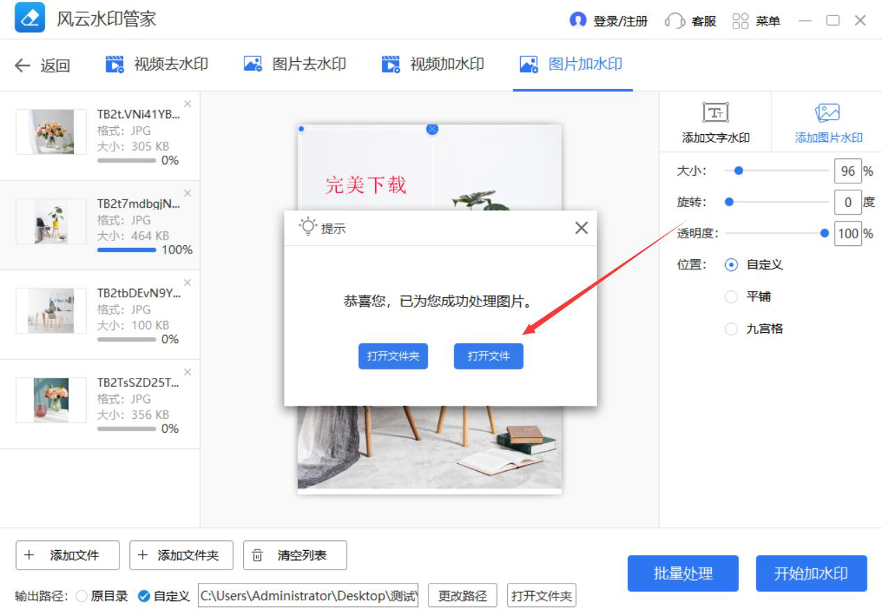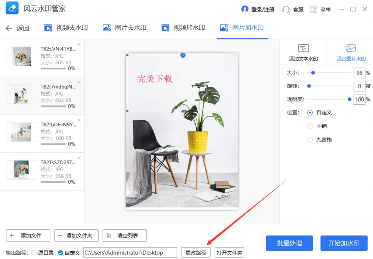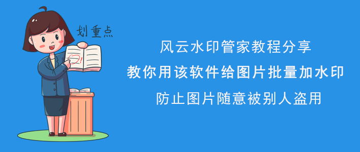 很多人拍完精美图片后,想将图片作品上传到热门网站,向更多人展示自己的作品。可是,又担心图片上传后被别人随意盗用,变成他人的作品。为了解决这一问题,我们可以用风云水印管家给图片批量加水印。考虑到很多人没接触过该软件,不懂操作,下面就为大家讲解如何使用风云水印管家给图片批量加水印。  风云水印管家如何给图片批量加水印? 1、首先,我们打开风云水印管家,在向导页面中点击“图片加水印”按钮。  2、进入风云水印管家的图片加水印操作界面后,我们点击“+添加文件”按钮。  3.然后,在弹出的窗口中,我们选择需要批量添加水印的图片,并点击“打开”按钮,将其导入风云水印管家。  4、接下来,我们回到风云水印管家操作界面,可以看到它有文字水印和图片水印两种方式可以选择,这里点击“添加图片水印”按钮。  5、在弹出的窗口中,我们选择想要为图片批量添加的图片水印,并点击“打开”按钮,将其导入风云水印管家。  6、回到风云水印管家操作界面,我们根据自己想要的效果,设置图片水印的大小、角度、透明度、位置。  7、如果批量添加了水印的图片的输出路径需要更改,就点击风云水印管家界面下方的“更改路径”按钮。  8、我们继续在弹出的窗口中,选择批量添加了水印后的图片的保存路径,再点击“选择文件夹”按钮。  9、接着,回到风云水印管家操作界面,点击“开始加水印”按钮,风云水印管家便开始为图片批量添加水印。  10、最后,弹出如下的小窗口提示,我们点击“打开文件”按钮,即可快速打开已经添加了水印的图片。  当图片的数量比较多,又需要添加水印的时候,就可以用风云水印管家为图片批量添加水印。它既可以添加文字水印,又可以添加图片水印,非常人性化。 15. 东西虽然丢了,就算它再珍贵又有何防,毕竟咱人是好好的,懂吗?这叫“留着青山在,不怕没柴烧”。希望这件事情不会再影响到你的心情。 -