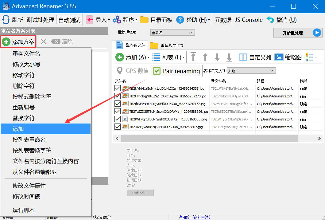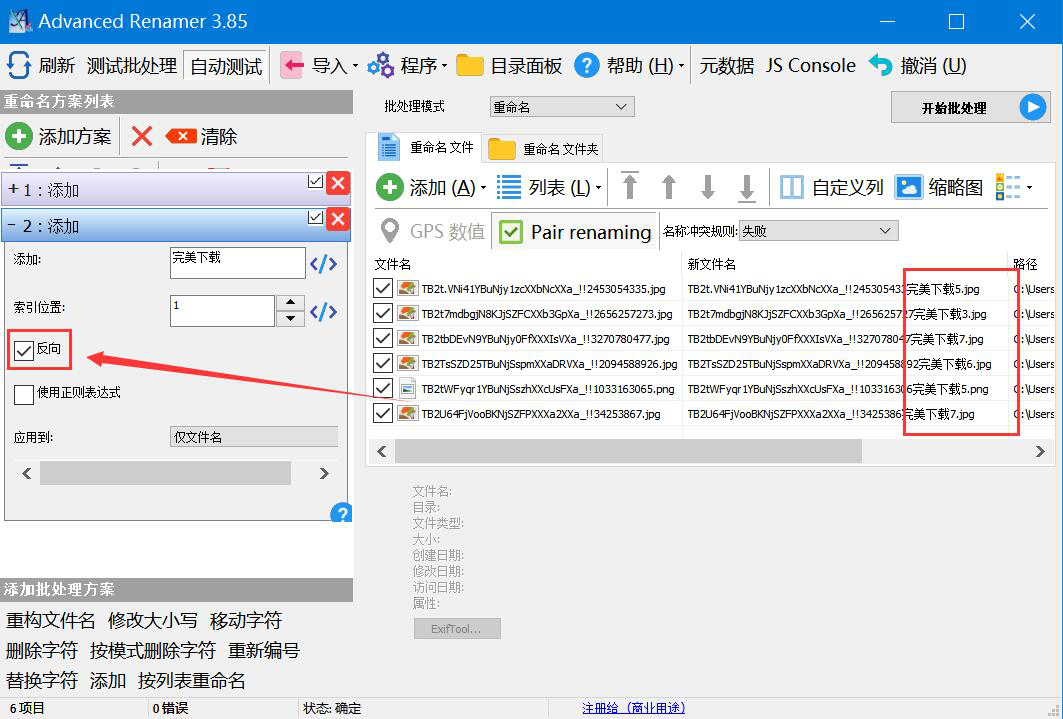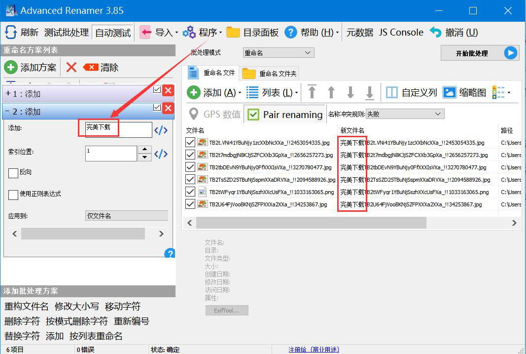 很多人拍完产品图后,会对产品图片进行分类。如果每个产品的图片比较多,那么一个个重命名就会非常浪费时间。为了解决这9. 当爱情不在的时候,请对他说声祝福,毕竟,曾经爱过。一问题,我们可以用Advanced Renamer Commercial批量重命名文件。考虑到很多人不懂如何操作,本文就为大家分享Advanced Renamer Commercial批量重命名文件教程,方便文件的后续查找。  Advanced Renamer Commercial如何批量重命名文件? 1、首先,我们打开Advanced Renamer Commercial软件,点击“添加”项目中的“文件”选项。  2、在弹出的窗口中,我们选择需要批量重命名的图片文件,并单击“打开”按钮,将其一并导入Advanced Renamer Commercial。  3、然后,我们回到Advanced Renamer Commercial操作界面,点击“+添加方案”项目中的“添加”选项。  4、此时,Advanced Renamer Commercial便会在界面左侧弹出“添加”的设置窗口。我们输入自己想要批量重命名文件的名称内容,在界面右侧会同步展示重命名的效果,所添加的文字内容会默认显示在原名称的前面,如下图。  5、Advanced Renamer Commercial批量重命名文件的时候,我们也可以勾选“反向”,这样一来,所添加的名称内容便会在原名称的后面,如下图所示。  6、最后,如果批量重命名文件的方式无需再修改,就点击界面右上方的“开始批处理”按钮,Advanced Renamer Commercial便开始批量重命名文件。  文件比较多,想要重命名文件,方便文件的后续查找和区分,无需一个个文件重命名,我们可以直接使用Advanced Renamer Commercial批量重命名文件。而且,Advanced Renamer Commercial有多种重命名方案可选。 Advanced Renamer Commercial如何批量重命名文件?图片批量更名方法三人行必有我师追目不暇接波逐浪22. 书在这个世界上是不可缺少的。书主宰了这个世界。书不仅传播知识,而且传承文化,它时刻影响人们的观念意识。一本书可能引发一场战争,也可掀起一种潮,它可以影响一代人甚至几代人。因而,书拥有独特的核心能力。51. Online voting becomes increasingly popular, and many competitions get people involved in it. (2016.江苏)129.盛名之下,其实难副。 笑捻粉香归洞户,更垂帘幕护窗纱,东风寒似夜来些。为我一挥手,如听万壑松。Advanced,Renamer,Commercial,重命名Substantiating this assumption requires examining the proper duty of government. |