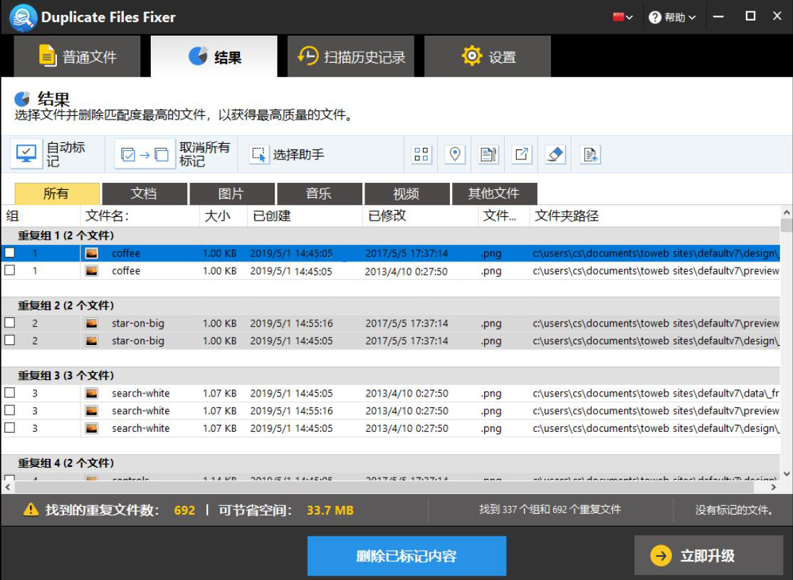 很多人在整理电脑文件的时候,才发现有很多视频、文档、图片是重复的,可是自己的文件平时都是随便放的,很难将重复文件一个个找出来。38. 你在我身边也好,在天边也罢,想到世界的角落有一个你,觉得整个世界也变得温柔安定了。为了解决这一问题,我们可以用Duplicate Files Fixer扫描删除重复文件。考虑到很多人没操作过,下面就为大家讲解如何使用Duplicate Files Fixer扫描删除重复文件,释放更多可用空间。  Duplicate Files Fixer如何扫描删除重复文件? 1、首先,我们打开Duplicate Files Fixer软件,点击界面左下方的“添加文件夹”按钮。  2、然后,在Duplicate Files Fixer弹出的窗口中,我们选择需要扫描重复文件的文件夹,并点击“选择文件夹”按钮。  3、接下来,我们点击界面下方的“扫描重复文件”按钮,Duplicate Files Fixer便开始扫描所选文件夹中的重复文件。  4、此时,我们可以在弹出的窗口中了解Duplicate Files Fixer扫描重复文件的进度,如果文件夹内容比较多,那么我们可以点击“最小化”,让它小窗口进行。  5、扫描完成,我们可以在Duplicate Files Fixer界面中看到所选文件夹中存在的所有重复文件。也可以选择只展示“文档”、“图片”、“音乐”、“视频”、“其他文件”中的某个类型文件。  6、最后,在扫描结果中,我们勾选自己想要删除的重复文件,再点击“删除已标记内容”按钮,Duplicate Files Fixer便会一键删除重复文件。  很多人在存放文件的时候,经常会同一个文件重复存放到不同的文件夹或者不同的磁盘,导致磁盘可用空间变少,也不利于文件的分类。为此,我们可以使用Duplicate Files Fixer扫描并删除重复文件,从而释放更多空间。 -