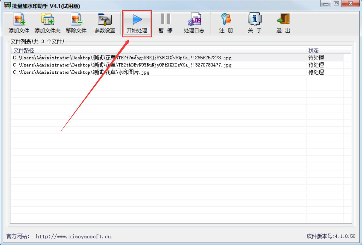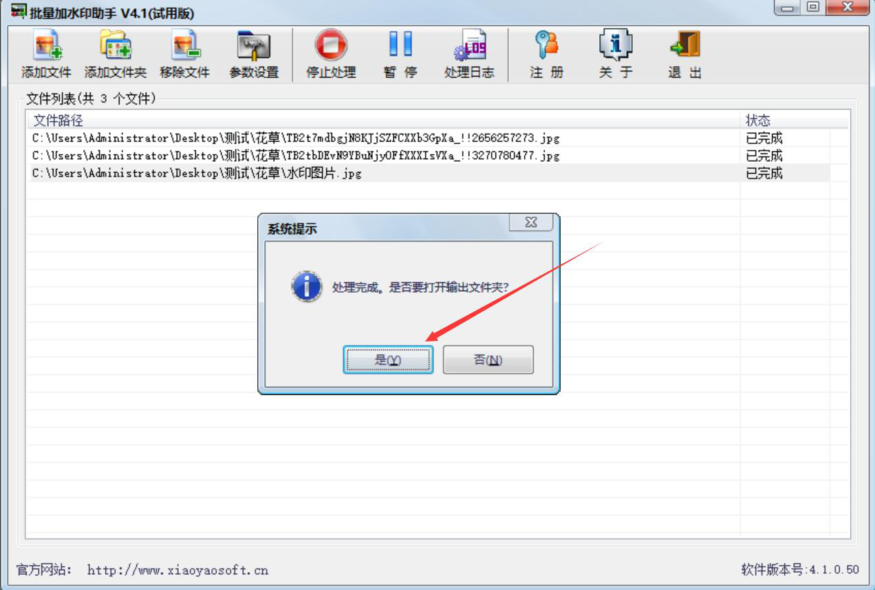 很多人拍完图片后,想要给图片添加水印,防止别人轻易盗用,可是自己又不知道该用什么软件来操作,而且要一张张添加水印,又会花费很多时间。其实,我们可以使用批量加水印助手给图片批量添加水印。考虑到很多人没操作过,下面就为大家分享批量加水印助手给图片批量添加水印的教程。  批量加水印助手如何给图片批量添加水印? 1、首先,我们打开批量加水印助手,点击界面左上方的“添加文件”按钮。  2、在弹出的窗口中,将需要批量添加水印的图片一并选中,并点击“打开”按钮,将其导入批量加水印助手。  3、然后,我们回到批量加水印助手操作界面,点击菜单栏中的“参数设置”选项。  4、进入批量加水印助手的参数设置界面,我们切换至“文字水印”选项卡,点击“+”按钮,便会弹出文字水印窗口,我们输入想要为图片批量添加的水印内容,再点击“确定43. 分手后你哭了那是你脆弱,分手后你笑了那是你的本事。”按钮。  5、接下来,我们单击选中批量加水印助手默认的文字水印,再点击“—”按钮,移除该文字水印。  6、此外,我们也可以在批量加水印助手的参数设置界面中,根据自己的需要来设置文字水印的样式。  7、接着,我们点击菜单栏中的“开始处理”按钮,批量加水印助手便开始给图片批量添加水印。  8、最后,弹出如下图的系统提示窗口,说明批量加水印助手成功地给图片批量添加了水印。我们直接点击“是”按钮即可打开处理好的图片。  不想自己做好的图片被别人随意盗用,就可以使用批量加水印助手给图片批量添加水印。而且,批量加水印助手不仅可以添加文字水印,还可以添加图片水印。 -