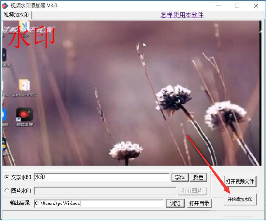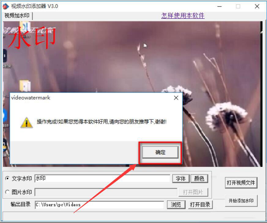 很多人拍了小视频后,想将它上传到相关网站,和更多的网友分享自己的作品,可是又担心自己辛苦弄的视频被别人盗用,成为他人的作品。为了解决这一问题,我们可以使用视频水印添加器给视频添加水印。考虑到很多人都没操作过该软件,下面就为大家讲解视频水印添加器怎么给视频添加水印。  视频水印添加器如何给视频添加水印? 1、首先,我们打开视频水印添加20. 现在每天醒来睁开眼见到的是墙上你那似阳光般的笑靥,好想哪天醒来时,第一眼所触及的是真正的你那似花般甜甜的睡容……器,点击界面右下方的“打开视频”按钮。  2、在弹出的窗口中,我们选择需要添加水印的视频,并点击“打开”按钮,将其导入视频水印添加器。  3、然后,我们回到视频水印添加器操作界面,点选“文字水印”,并在它旁边的编辑框中输入相应的文字水印内容。  4、如果想要更改默认的字体,我们就点击“字体”按钮,并在弹出的字体窗口中,选择自己喜欢的字体类型、字体颜色、字体大小等等,设置好了,就点击“确定”按钮。  5、接下来,如果添加了水印的视频的输出路径需要更改,就点击视频水印添加器界面下方的“浏览”按钮。  6、在视频水印添加器弹出的浏览文件夹窗口中,我们选择添加了水印后的视频的保存路径,再点击“确定”按钮。  7、文字水印的内容、格式、输出路径都设置好了后,我们点击界面右下方的“开始添加水印”按钮,视频水印添加器便开始为视频添加水印。  8、最后,当弹出如下图的窗口提示时,则说明视频水印添加器成功地为视频添加了水印。我们直接点击“确定”按钮即可。  担心自己做的视频被别人轻易盗用,变成他人的作品,就可以使用视频水印添加器为视频添加水印。在添加水印时,除了可以添加文字水印,也可以添加图片水印,还可以设置水印的格式,非常人性化。 -