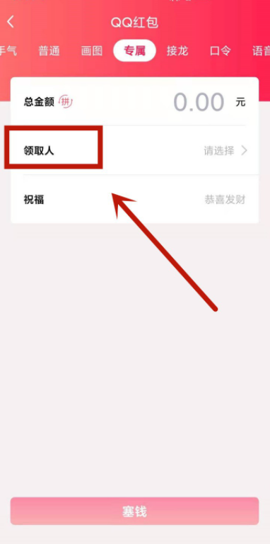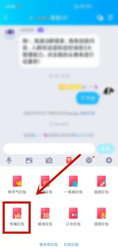 为了活跃气氛,我们在QQ群组聊天的时候可以发几个小红包,升级新版QQ,软件设计了一项新的红包玩法,即专属红包,只有指定人员才有领取权限,其他人只能看着干瞪眼。如何在QQ群发送专属红包?详情请看文章说明。 如何给QQ群指定成员发红包? 打开手机QQ,进入界面,选择一个群组,在群聊窗口点击红包图标,   出现弹框,选择红包类型,如图,点击【专属红包】,  打开QQ红包,点击【领取人】,选择QQ群成员,   然后设置红包金额,点击【塞钱】,即可发送红包,只有指定人才能拆开红包。  了解更多精彩教程资讯,关注wmzhe.com。 -