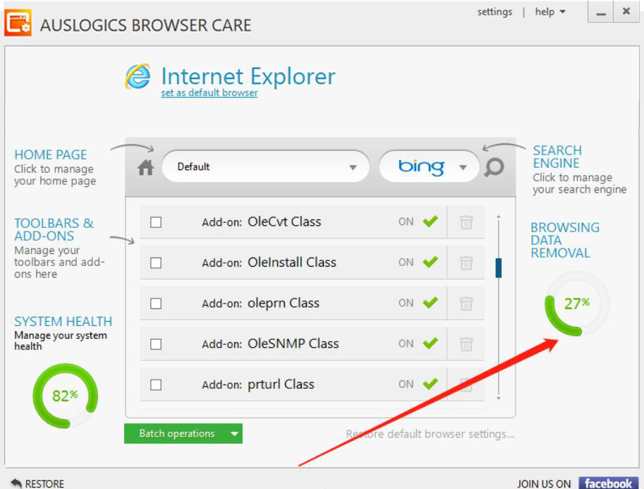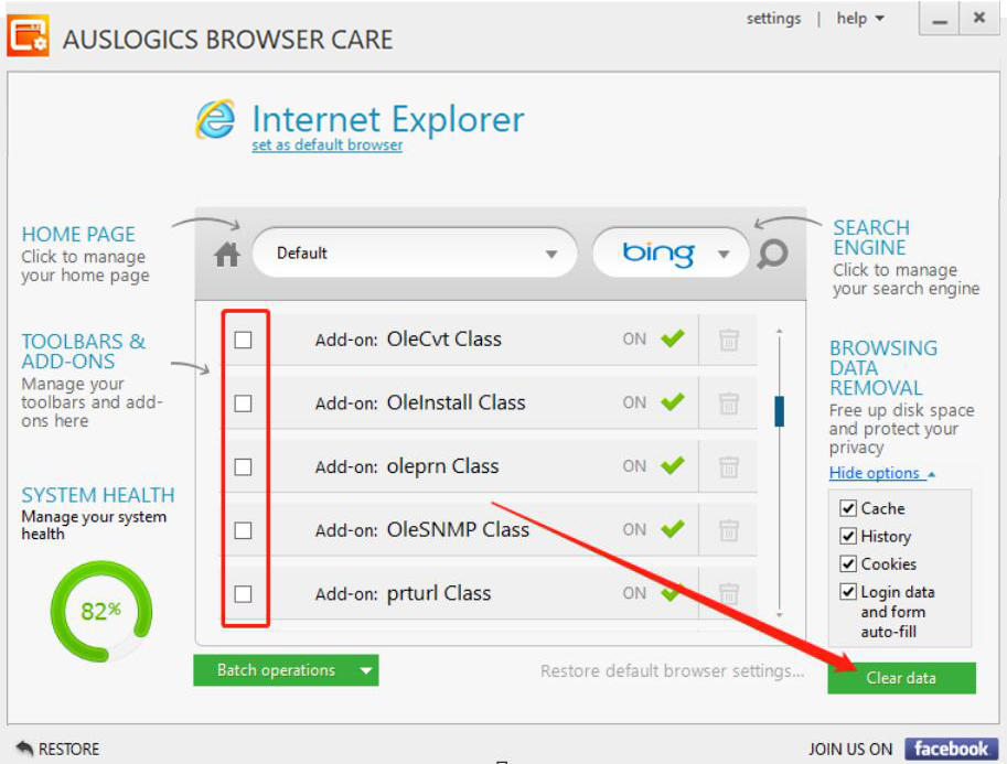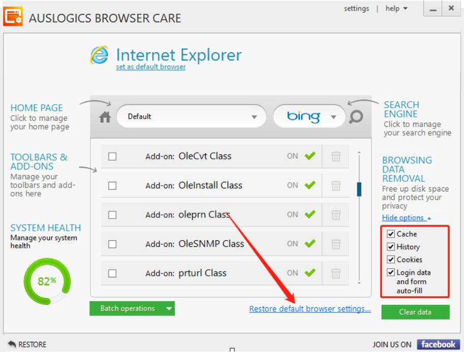 如果浏览器经常用来浏览不同的网站或者加载网页、视频的话,就会有很多缓存文件。可是这些缓存文件,有一些是没有用的,会影响浏览器访问的网页的速度。为了解决这一问题,我们可以用Auslogics Browser Care清理浏览器缓存。考虑到很多人没接触过该软件,下面就为大家讲解怎么用Auslogics Browser Care清理浏览器缓存。  Auslogics Browser Care如何清理浏览器缓存? 1、首先,我们打开Auslogics Browser Care软件。Auslogics Browser Care会自动识别浏览器并自动扫描浏览器的缓存,可以在界面中部看到它具体的扫描进度。  2、然后,当浏览器的缓存扫描完成了,我们可以在Auslogics Browser Care界面中了解到具体的缓存信息,点击界面右侧的“Show options”显示选项。  3、接下来,我们勾选“Hide options”隐藏选项中的几个选项,再点击界面中的“Restore default browser settings”蓝色字,Auslogics Browser Care便会重新扫描浏览器的缓存。  4、当浏览器的缓存再次扫描完成后,我们勾选自己想要清毁方瓦合拼音:huǐ fāng wǎ hé释义:毁去棱角,与瓦砾相合。比喻屈己从众,君子为道不远离于人◇指毁弃自己的原则,迎合世俗。出处:语出《礼记·儒行》慕贤而容众,毁方而瓦合,其宽裕有如此者。”郑玄注去己之大圭角,下与众人小合也。”示例:故《儒行》欲~,《老子》欲和光同尘。★宋·俞文豹《吹剑录》理的浏览器缓存,再点击界面右下方的“Clear data”按钮,Auslogics Browser Care便开始清理浏览器缓存。  5、最后,我们在界面右侧可以看到Auslogics Browser Care清理浏览器缓存的具体进度,耐心等待清理完成即可。  电脑浏览器访问的网页多的话,时间长了,会存在一些无用的缓存,从而影响浏览器访问的速度。我们可以每隔一段时间就用Auslogics Browser Care清理浏览器缓存。 -