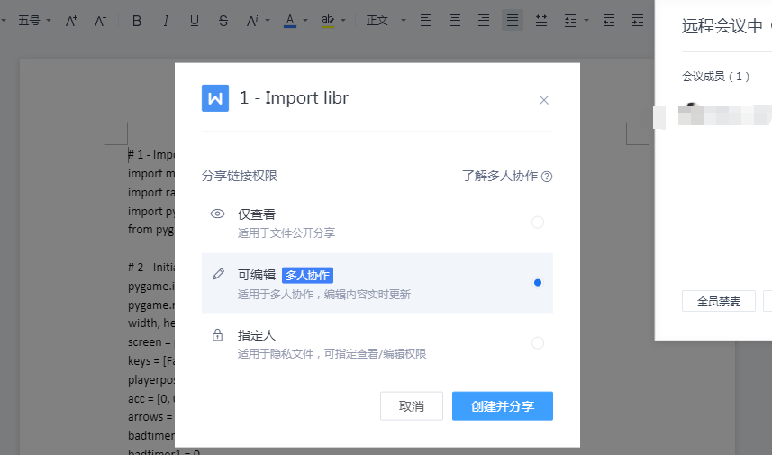 WPS Office是大家常用的一款办公软件,随着版本更新,WPS设计了会议功能,可以满足用户召开远程会议的需求。WPS Office如何创建远程会议?详情请看文章说明。 WPS Office如何发起远程会议? 电脑端 在电脑中打开WPS Office 2019,进入软件界面,在左侧栏点击【会议】功能,如果没有找到,可以点击【应用】进行查找,  弹出会议窗口,如图,点击【发起会议】,  现在选择文件,如图,选择需要发起会议的文档,点击确定,  设置文档权限,点击【可编辑】,进行相关设置,  如图,桌面显示了远程会议窗口,点击头像,可以邀请参会成员,你还可以设置【全员禁麦】、【锁定会议】,  点击麦克风图标,可以打开语音进行交流,当然了,会议过程中还可以切换文档。  手机端 在手机中打开WPS软件,进入首页,点击底部的【应用】,调整新页面,选择【第三方服务】,  如图,点击【演示播放】——【会议】功能,  进入金山会议窗口,点击【发起会议】,  成功创建远程会议,如图,窗口上方显示了加入码,你可以邀请其他人参与会议;在底部还有工具栏,可以设置语音通话。  了解更多精彩教程资讯,关注wmzhe.com。 -