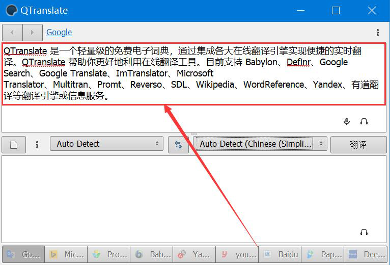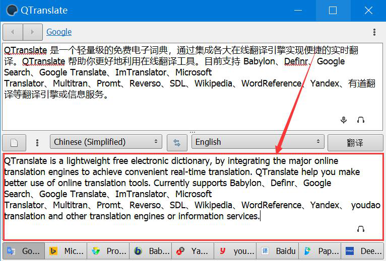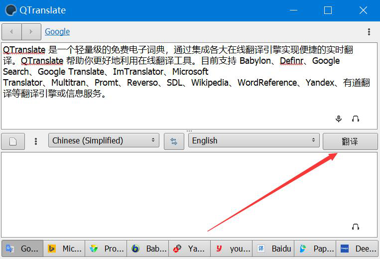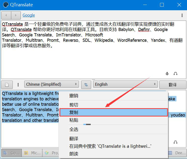 无论是工作还是学习,我们经常会需要将一段甚至整篇中文文档翻译成英文。如果翻译能力差,那么翻译起来会非常困难,而且出错率也高。为了解决这一问题,我们可以用QTranslate将中文翻译成英文,翻译后再将结果复制使用即可。考虑到很多人不懂如何操作,下面就为大家讲解QTranslate怎么将中文翻译成英文。  QTranslate如何将中文翻译成英文? 1、首先,我们打开QTranslate软件,通过组合键“Ctrl+A”将它默认的中文内容全选,再按一下键盘“Delete”键将其删除。  2、然后,我们将需要翻译成英文的中文内容复制粘贴到QTranslate的文本框中,如下图。  3、接下来,我们在翻译语言设置中,设置“Chinese(Simplified)”中文简体翻译成“English”英文,如下图。  4、中文翻译成英文的语言设置好了,我们点击QTranslate界面右侧的“翻译”按钮。  5、此时,我们便可以看到QTranslate将中文翻译成英文了。  6、最后,我们将翻译结果全部选中,并右键单击,在右键菜单中可以试听QTranslate将中文翻译成英文的结果,也可以点击“复制”选项,将结果粘贴到其他文档,满足后续编辑的需要。  想要将中文翻译成英文,可是翻译能力差?没关系,我们可以用QTranslate将中文翻译成英文,它不仅翻译的速度非常快,而且准确率很高。 -