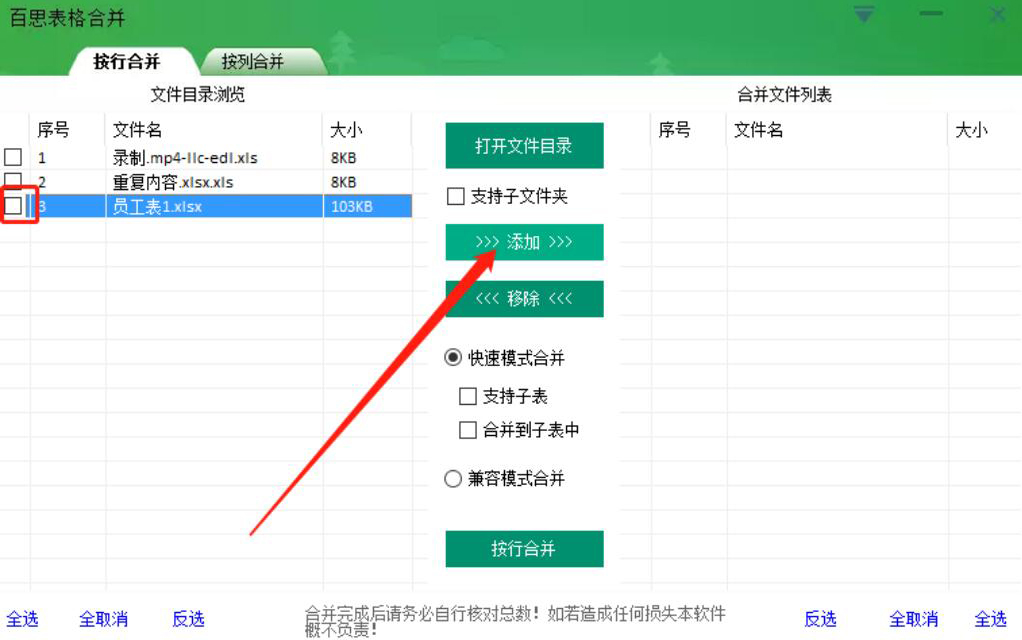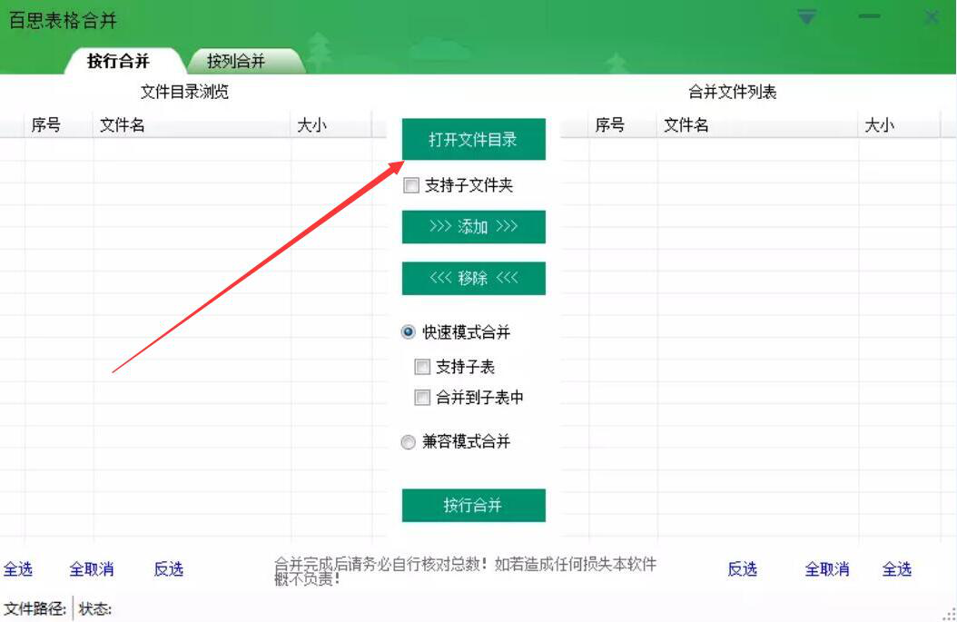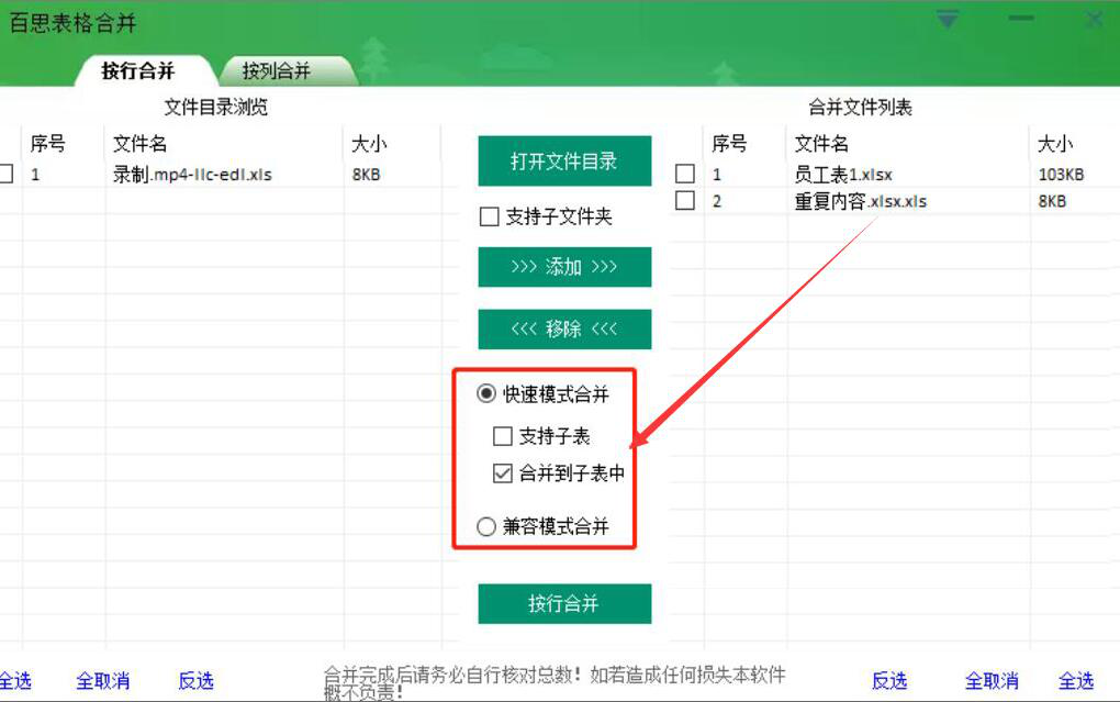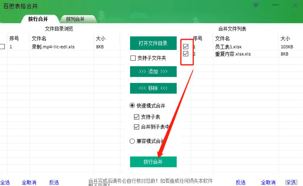 工作中,我们常常需要整合多个不同的Excel文件。很多人都是采用一行行或者一列列复制粘贴的方式来整合,可结果往往会漏掉某些数据,而且效率也低。为了解决这一问题,我们可以用百思表格合并软件合并Excel文件。考虑到很多人没操作过该软件,下面就为大家讲解如何使用百思表格合并软件合并Excel文件。  百思表格合并如何合并Excel文件? 1、首先,我们打开百思表格合并软件,点击界面中部上方的“打开文件目录”按钮。  2、然后,在弹出的窗口中,我们选择需要合并的Excel文件,并点击“确定”按钮,将其一并导入百思表格合并软件。  3、接下来,我们在百思表格合并软件的文件目录中,勾选自己想要合并的Excel文件,再点击“添加”按钮。  4、此时,我们便可以看到需要合并的Excel文件被添加至合并文件列表中了,根据自己的需要选择Excel文件合并的模式。  5、最后,我们在合并文件列表中勾选要合并的Excel文件,再点击“按行合并”按钮,百思表格合并软件便开始合并Excel文件。  想要整合Excel文件,没有必要一行行或者一列列复制粘贴,我们可以直接使用百思表格合并软件合并Excel文件。而且在合并前,还可以自行选择合并的模式,合29. 人生难免要遭遇挫折与失败,与其用泪水洗刷悔恨,不如用微笑去迎接新的挑战。并后的Excel文件数据不会出现错乱的情况。 百思表格合并如何整合Excel文件?Excel快速合并方法似月出东山懂东方欲晓非懂12. 人生路上,你我都是过客,来去皆是缘分。也许,某年某月的某一天,某条街上,一个熟悉的背影出此刻我的视线,也正好蓦然回首,却不是你的脸,只是恰似你的温柔。62. The city is located on the banks of the Long River.105.韩信将兵,多多益善。 别馆寒砧,孤城画角,一派秋声入寥廓。东归燕从海上去,南来雁向沙头落。楚台风,庚楼月,宛如昨。嘈嘈切切错杂弹,大珠小珠落玉盘。百思表格合并,Excel,表格To assume (suggest) that … is far from being proved (to miss the point). |