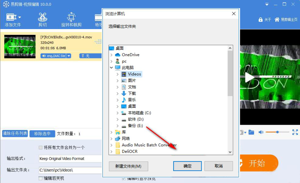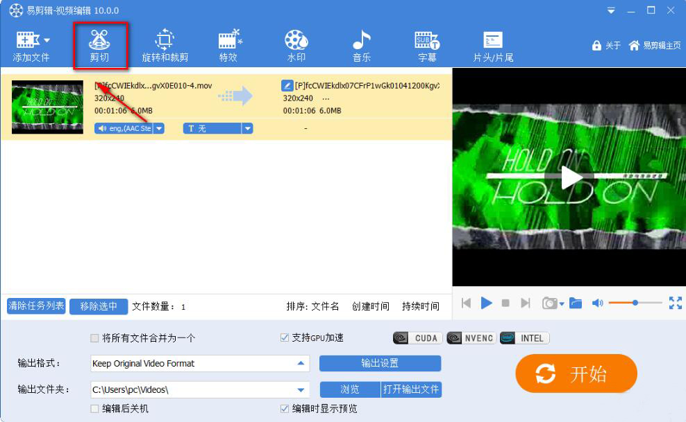 很多人在处理视频的时候,才发现视频中真正能为自己所用的,可能就只有某个片段。如果要将视频重拍,就需要多方人力、物力的配合,还要耗费很多时间。其实,我们可以用易剪辑软件剪切视频,将可用的片段剪切保留。考虑到很多人不懂操作,下面就为大家分享易剪辑软件剪切视频的教程。  易剪辑软件如何剪切视频? 1、首先,我们打开易剪辑软件,在其功能向导页面中,点击“视频编辑工具”选项。  2、进入易剪辑的视频编辑操作界面,我们点击界面左上方的“添加文件”按钮。  3、然后,在弹出的窗口中,我们选择需要剪切的视频,并点击“打开”按钮,将其导入易剪辑。  4、回到易剪辑的操作界面,我们点击功能栏中的“剪切”按钮。  5、接下来,进入易剪辑的视频剪切窗口。我们拉动时间轴上的滑块来选取需要剪切保留的视频片段,再点击“好”按钮。  6、回到易剪辑的视频编辑器操作界面,如果输出文件夹需要更改,就点击“浏览”按钮。  7、在易剪辑弹出的浏览计算机窗口中,选择视频被剪切后的保存路径,再点击“确定”按钮。  8、最后,我们点击界面右下方的“开始”按钮,易剪辑便会将剪切好的视频保存到指定的路径。  不想要整个视频,只想要视频中的某个片段,就可以用易剪辑来剪切视频。而且,易剪辑在剪切视频前,还可以根据自己的需要调节视频播放的速3. 那些终将过下去的日子,叫做余生。而与你有关的日子,才是未来。度。 -