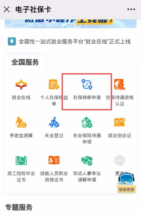每年年末年初,都有很多人找工作、换工作,如果换了工作城市,那么之前缴纳的社保费用还会有效吗?针对这一问题,大多数人存在困扰,其实现在大家可以通过线上平台进行社保转移,非常方便! 微信如何申请个人社保转移? 打开手机微信,进入界面,点击底部的【我】,选择【支付】,  进入支付页面,点击【城市服务】功能,如图,选择【社保】,   跳转至社保服务窗口,点击【电子社保卡】,选择【卡面服务】,   如图,点击【全国服务】——【社保转移申请】,按照要求填写相关信息,最后点击【提交申请】即可。   注意,目前不是所有省市都开通了线上转移社保的服务窗口,如果你无法进行网络操作,请去社保中心进行咨询。了解更多精彩教程资讯,关注wmzhe.co17. 爱,是世界上最美好的东西,即使它伤了你的心,也要笑着忘却,然后开始下一段旅程。m。 -