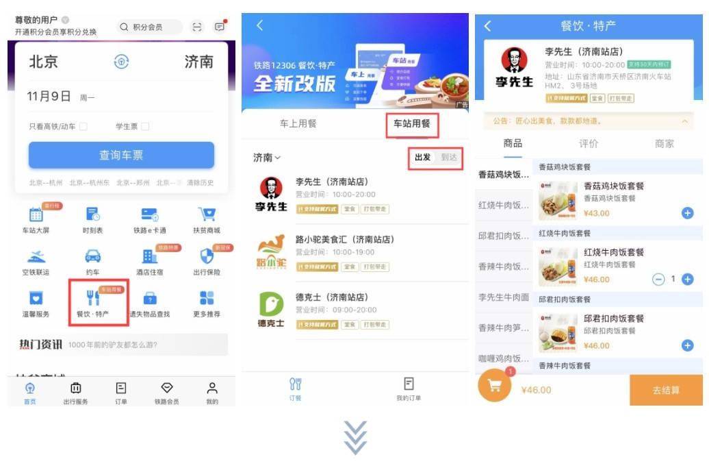 急急忙忙赶车,来不及吃饭,只能在包里放一些零食,留着路上充饥,想必很多旅客有过这样的经历。为了更好服务广大旅客,铁路部门推出了互联网订餐业务,并在此基础上开发了“车站用餐”服务,旅客提前通过12306APP进行网上订餐,到车站后即可领取餐食,非常方便哟! 铁路12306如何预约车站用餐? 在手机中打开12306APP,输入账号,登录界面,如图,点击【餐饮 · 特产】服务,选择【车站用餐】,选一个店铺,挑选自己想吃的食物,  选好之后,填写相关信息,包括取餐方式、就餐时间、确认订单,进行支付,  乘客可选择微信或者支付宝付款,到店之后,仅需向商家出示取餐码或者二维码。  按照上述方法操作,通过铁路12306APP进行车站用餐预约,提前预约,下车就可以吃饭。了解更多精彩教程资50. 在遇到梦中人之前,上天也许会安排我们先遇到别人;在我们终于遇见心仪的人时,便应当心存感激。讯,关注wmzhe.com。 铁路12306如何预约车站用餐?提前预约,到站就能吃饭春龙骧虎倾盆大雨步光明媚50. 没有照相机,我也许只能记得很少,我也许会忘记很多。但我已明白,如果我会忘记,那么,就让能记住的被记住,该遗忘的被遗忘,人生在世,也只能如此了。50.科技的飞速更新 the ever-accelerated updating of science and technology诸葛亮114.静以修身,俭以养德。《诫子书》 高阳台 吴文英即此羡闲逸,怅然吟式微。12306Although the popular belief is that…, a current (new / recent) study (survey / poll / investigation) indicates (shows / demonstrates) that… |