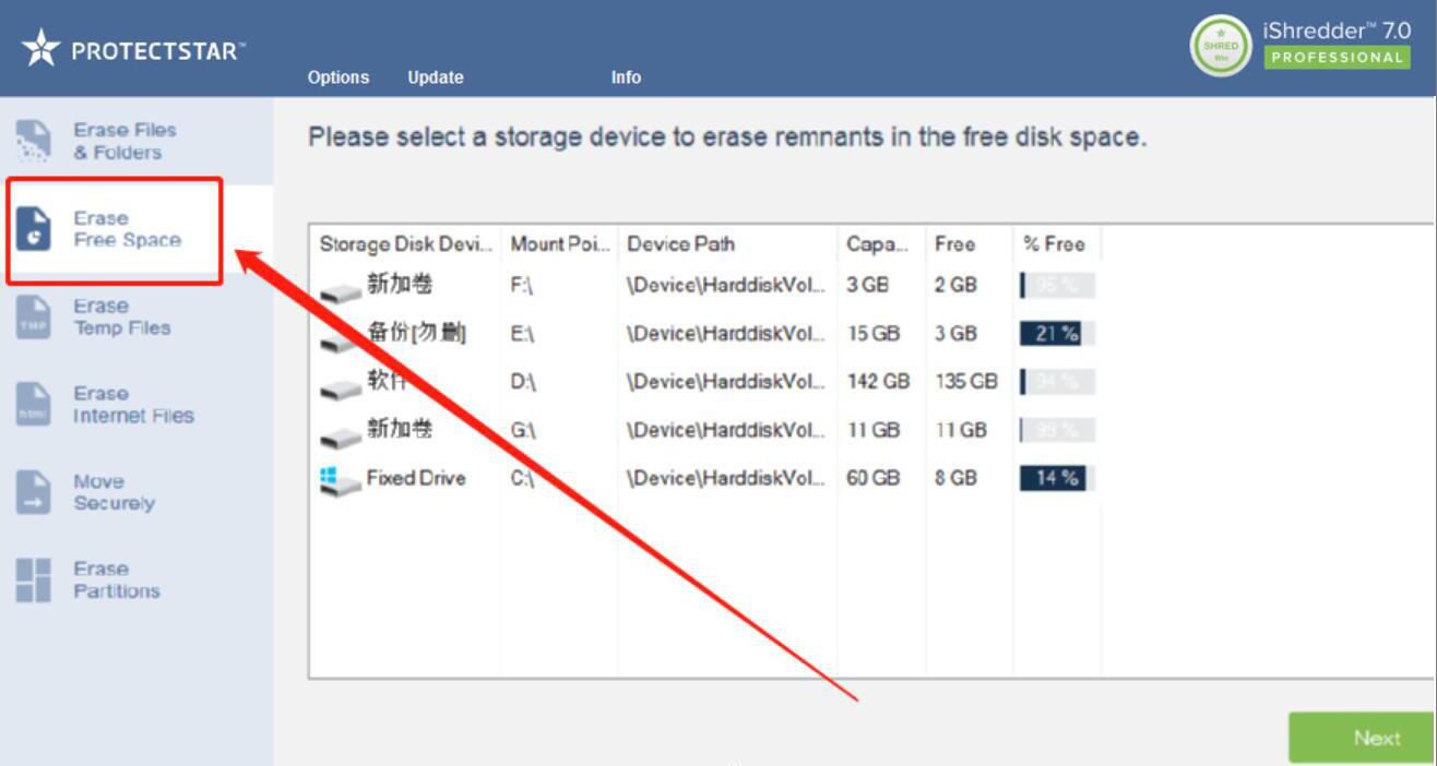 很多人说感觉自己的电脑运行速度越来越慢了,特别是运行一些比较大的程序,电脑会经常卡机,就算是重启也无济于事。其实,这主要是因为磁盘空间不足导致的,我们可以用iShredder释放磁盘空间。考虑到很多人都没操作过,下面就为大家讲解如何使用iShredder释放磁盘空间。  如何使用iShredder释放磁盘空间? 1、首先,我们打开iShredder软件,切换至“Erase Free Space”清除可用惠然之顾拼音:huì rán zhī gù释义:用作欢迎客人来临的客气话。同惠然肯来”。出处:晋·袁宏《后汉纪·灵帝纪下》弥秋历冬,经迈二载,深拒以疾,无惠然之顾。”示例:无空间操作界面。  2、然后,我们单击选择想要iShredder释放的磁盘空间,再点击界面右下方的“Next”按钮。  3、此时,iShredder会在界面中显示扫描并释放该磁盘空间的相关信息,我们直接点击“Next”按钮。  4、接下来,在iShredder界面中,我们可以实时了解扫描磁盘空间的具体进度,以及关于释放磁盘空间的一些信息,如下图所示。  5、最后,当进度都显示100%的时候,则说明iShredder完成了磁盘空间的释放。  想要释放电脑磁盘空间,提高磁盘读写速度和系统运行速度,我们可以用iShredder扫描并释放磁盘空间。操作上非常简单,仅需几步就能让电脑减负运行。 -
