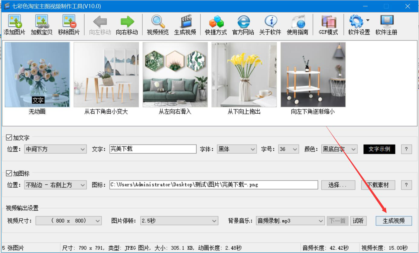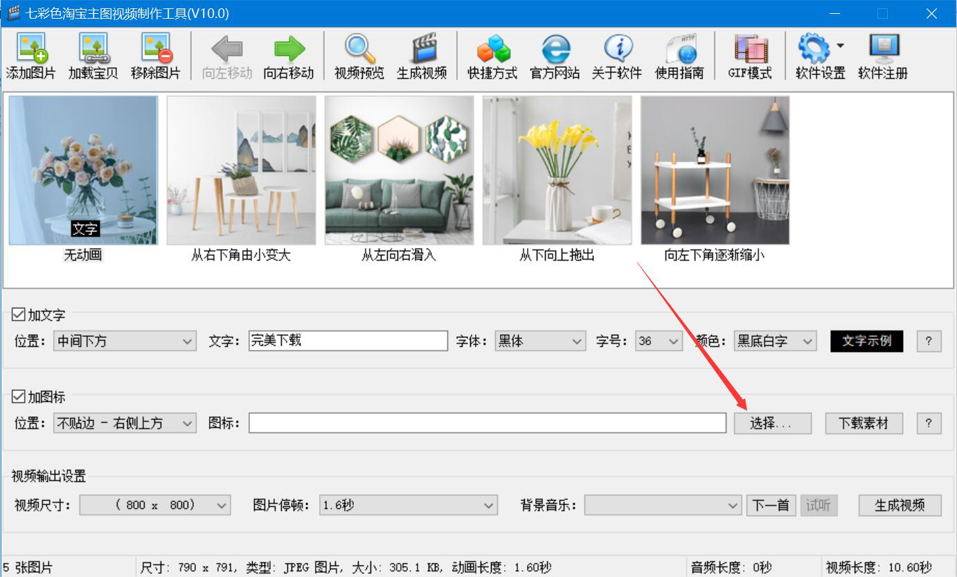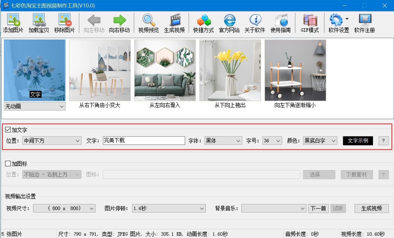 很多人说看到其他店铺所做的商品主图视频很吸引人,自己也想根据自己的商品来制作图片视频,从而提高转化率,可不懂该如何制作。其实,我们可以用七彩色淘宝主图视频制作工具来制作图片视频。考虑到很多人没接触过该软件,下面就为大家讲解如何使用七彩色淘宝主图视频制作工具制作图片视频。  七彩色淘宝主图视频制作工具如何制作图片视频? 1、首先,我们打开七彩色淘宝主图视频制作工具,点击界面左上方的“添加图片”按钮。  2、在弹出的窗口中,我们选择用来制作视频的图片,并点击“打开”按钮,将其一并导入七彩色淘宝主图视频制作工具。  3、然后,回到七彩色淘宝主毁方投圆拼音:huǐ fāng tóu yuán释义:比喻抛弃立身行事准则,曲意投合别人。出处:无示例:无图视频制作工具操作界面,如果想要为图片添加文字,就可以勾选“加文字”,并且输入文字内容,设置文字格式、属性。  4、如果还想为图片添加图标或者图片水印,就可以在七彩色淘宝主图视频制作工具中勾选“加图标”,设置图标的位置,点击“选择”按钮。  5、此时,在弹出的选择图片窗口中,我们将制作图片视频时要用的图标文件选中,并点击“打开”按钮,将其导入七彩色淘宝主图视频制作工具。  6、接下来,我们还可以在七彩色淘宝主图视频制作工具中设置视频尺寸、图片停顿时间、选择背景音乐。  7、制作图片视频的相关参数都设置好了后,我们点击界面右下方的“生成视频”按钮。  8、七彩色淘宝主图视频制作工具便会弹出保存路径窗口,我们选择制作好的图片视频的保存路径,再点击“保存”按钮。  9、最后,当弹出如下图的小窗口提示时,则说明七彩色淘宝主图视频制作工具已经将图片视频生成并保存到指定的路径中了。我们点击“是”按钮,即可观看图片视频效果了。  想要制作淘宝商品主图视频,我们可以用七彩色淘宝主图视频制作工具来制作。制作的时候,不仅可以添加文字还可以添加图标,起到直观的宣传效果。 七彩色淘宝主图视频制作工具如何制作图片视频?制作高质量的商品宣传视频浩浩长盲人瞎马千古绝唱空爱网无关爱不缠,金田有种种金丹,禅心要在尘中净,功行终须世上全,烦恼脱于烦恼际,死生超出死生间,不能火里生枝叶,安得花开火里莲。I’m determined to…120.国以民为本,民以食为天。 从别后,忆相逢,几回魂梦与君同。今宵剩把银釭照,犹恐相逢是梦中。尽寒食雨草萋萋,著麦苗风柳映堤。七彩色淘宝主图视频制作工具,淘宝,视频制作8.Experience is the mother of wisdom. 实践出真知。 |