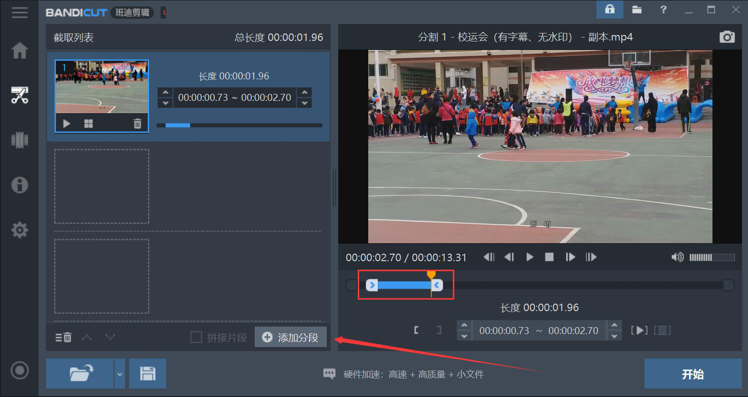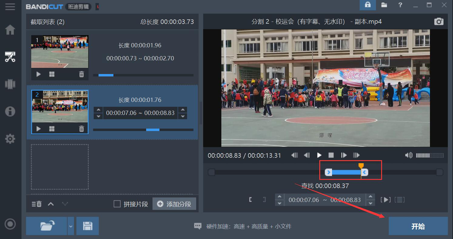 很多人拍完视频之后,才发现视频中有些片段是多余的或者拍的比较差的,就想将其他拍得好的片段重新合并,可是又不知道该怎么办,条件又不允许重拍视频。为了解决这一问题,我们可以用Bandicut合并视频中想要的部分。考虑到很多人不懂如何操作,下面为大家讲解Bandicut如何合并视频中想要的部分。  Bandicut如何合并视频指定片段? 1、首先,我们打开Bandicut操作界面,点击功能项目中的“截取”选项。  2、在弹出的窗口中,我们选择需要截取并且合并视频中想要的部分的文件,再点击“打开”按钮,将其导入Bandicut。  3、然后,在Bandicut的截取界面中,我们移动视频预览窗口下方的滑块来选取自己想要合并的第一个部分,再点击“添加分段”按钮。  4、同样的,在视频预览窗口下方移动滑块选取想要合并的其他部分片段,再点击&l39. 曾经以为过不去的,终究会过去。痛苦有时候是一种提升,否则,我们流的眼泪也就毫无意义。dquo;开始”按钮。  5、接下来,在Bandicut弹出的视频导出设置窗口中,我们重命名文件名。如果输出的路径需要更改,就点击如下图的“…”按钮。  6、我们继续在Bandicut弹出的窗口中,选择合并了想要的部分的视频的保存路径,再点击“选择文件夹”按钮。  7、接着,我们勾选“拼接片段”选项,再点击“开始”按钮,Bandicut便开始合并视频中想要的部分。  8、最后,在进程中可以看到“完成”的提示,则说明Bandicut合并了视频中想要的部分,我们直接点击“关闭”按钮即可。  我们拍视频的时候难免会拍了一些无用的部分,在编辑视频时,就想将自己想要的视频部分合并,就会用到Bandicut。Bandicut能合并多个想要的视频部分片段,让视频作品更优秀。 -