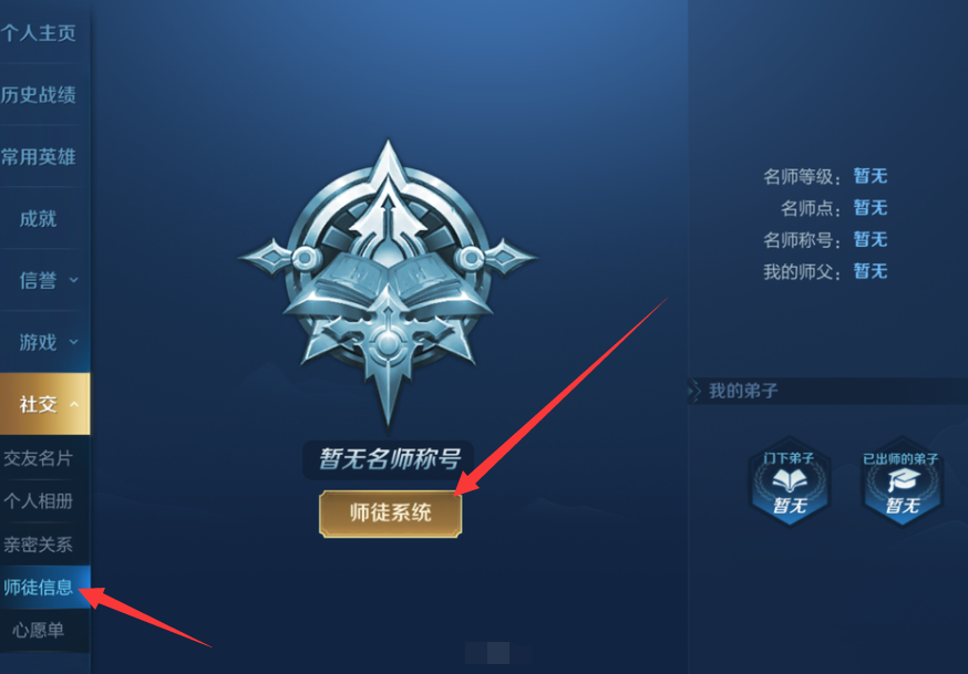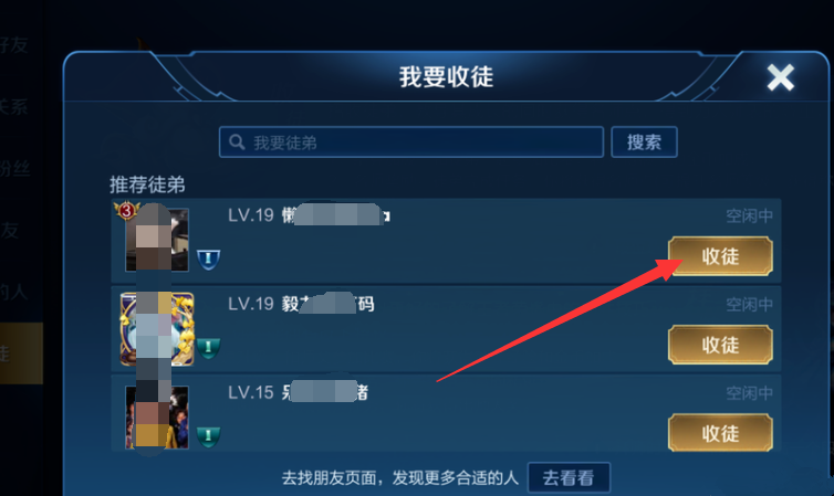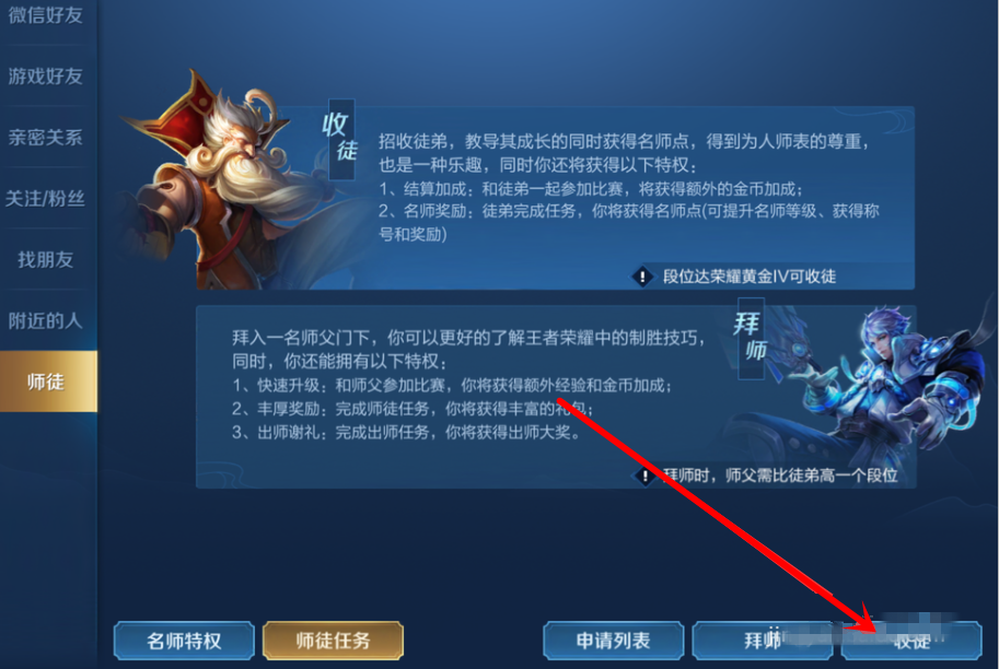 王者荣耀是很多人喜欢的一款国民手游,如果你是刚刚接触游戏,没有经验,可以选择“拜师”,跟着高级玩家学习游戏制胜技巧。王者荣耀怎么拜24. 简单安静的生活其实不幸福,所以我只拥抱刹那,绵延持久的感觉根本不快乐,所以我只信仰瞬间。师?王者荣耀怎么收徒?详情请看文章说明。 王者荣耀如何收徒做任务? 在手机中打开王者荣耀,输入账号,登录游戏,如图,点击左上角的头像,  进入个人主页,如图,在左侧栏点击【社交】,展开列表,选择【师徒信息】,然后点击【师徒系统】,   跳转至以下页面,如图,在师徒系统中查看收徒和拜师的相关说明,点击右下角的【收徒】,  出现弹窗,如图,搜索或者选择相关用户,点击【收徒】,  最后输入收徒验证信息,点击确定,对方收到信息之后就会作出决定。  同理,在师徒系统中点击【拜师】,可以选择高级别玩家进行拜师,成为师徒,双方可以结伴做任务,赢取奖励。  了解更多精彩教程资讯,关注wmzhe.com。 王者荣耀怎么拜师?王者荣耀怎么收徒?目百花齐放瞪口龙争虎斗呆9. 和蜂鸟相比,啄木鸟的个头就大多了,啄木鸟不但在体型上比蜂鸟占据优势,在养儿育女方面也比蜂鸟得到的益处多蜂鸟每天不辞辛苦,四处采蜜,也最多只能喂抱2只雏鸟,而啄木鸟只需要在自己的鸟窝前用它那斧锯般的嘴在树木之间桌来桌去,就可以轻而易举的得到食物了。20.…也不例外 …be no exception[NextPage]81.民为贵,社稷次之,君为轻。 声声慢 李清照105杜甫:月夜王者荣耀44、Strike while the iron is hot. |