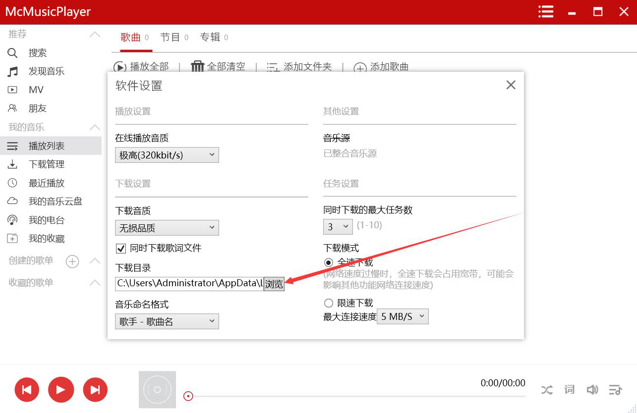 很多人在下载歌曲的时候,都是一首一首分别下载的,浪费了很多时间,而且想要下载无损音乐又需要付费。其实,为了解决这一问题,我们可以使用McMusicPlayer播放器批量下载歌曲,其中还能免费下载付费歌曲。考虑到很多人没操作过,下面就为大家讲解如何使用McMusicPlayer批量下载歌曲。  如何使用McMusicPlayer批量下载歌曲? 1、首先,我们打开McMusicPlayer播放器,点击界面右上方的折叠按钮,打开软件设置窗口。  2、25. 在坚强的世界里,我有活力;在坚强的世界里,有我那最真挚的心;在坚强的世界里,我可以冲破风浪迎接一个新的世界!然后,在软件设置窗口中,我们可以看到歌曲被批量下载后的输出目录。如果需要更改,就点击“浏览”按钮,同时还可以设置歌曲批量下载的最大任务数、速度。  3、McMusicPlayer弹出浏览文件夹窗口,我们选择歌曲批量下载后的保存路径,再点击“确定”按钮。  4、接下来,切换至McMusicPlayer的搜索界面。在搜索栏中输入自己想要批量下载的音乐的关键词,再点击搜索按钮。  5、我们切换至McMusicPlayer的歌单界面,在列表中,点击自己想要批量下载的歌曲。  6、进入McMusicPlayer的歌单下载界面,我们点击“下载全部”按钮,McMusicPlayer便开始批量下载歌曲。  7、最后,切换至McMusicPlayer的下载管理的“正在下载”界面,可以实时了解到McMusicPlayer批量下载歌曲的具体进度。  想要免费下载多首歌曲,包括无损音乐,都可以使用McMusicPlayer来批量下载歌曲。它不仅歌单丰富,而且下载的速度也很快。 -
