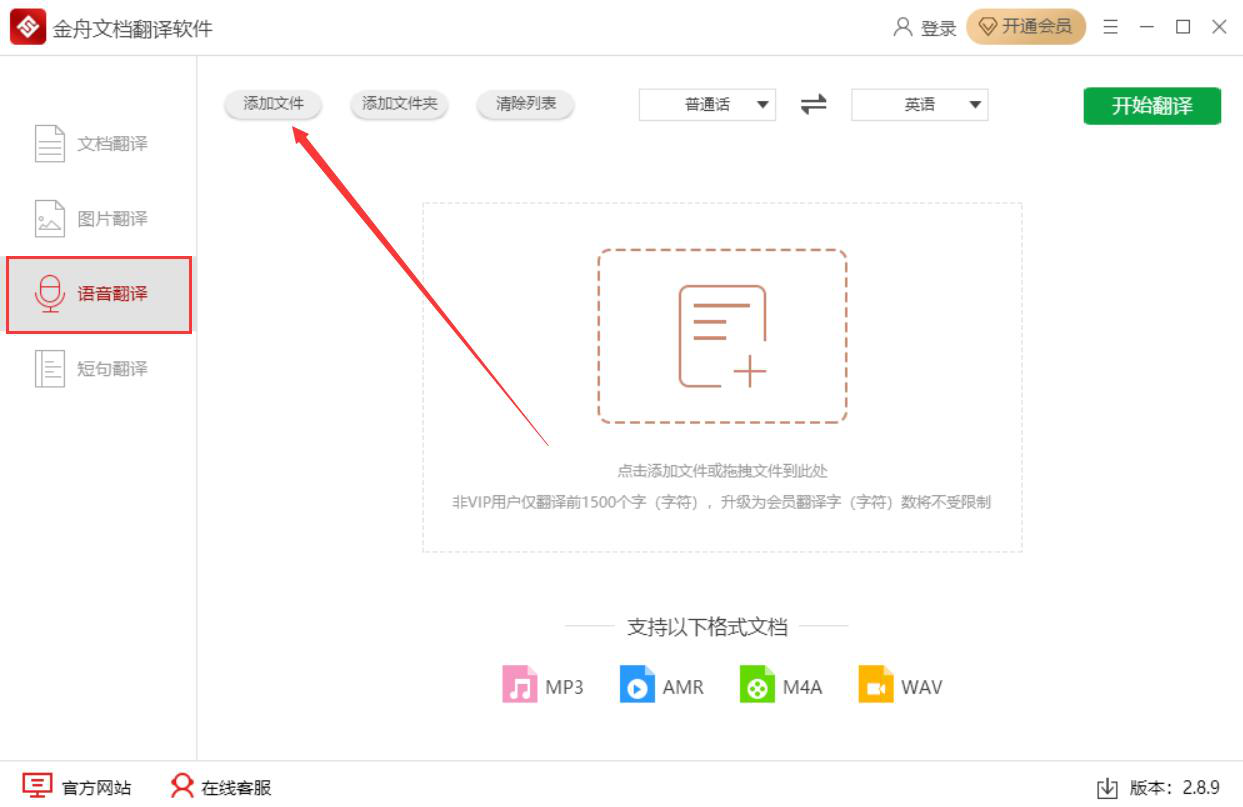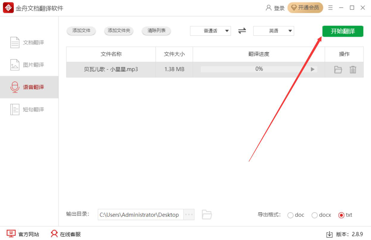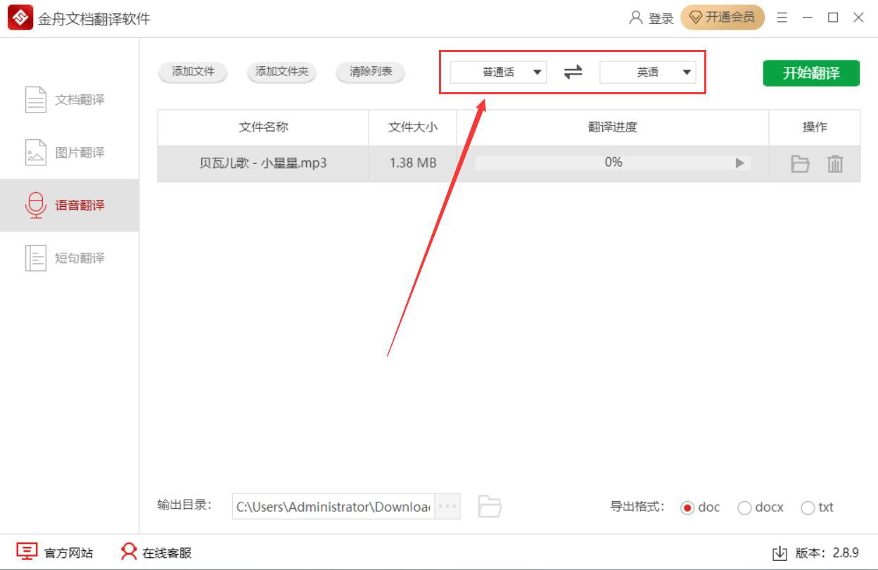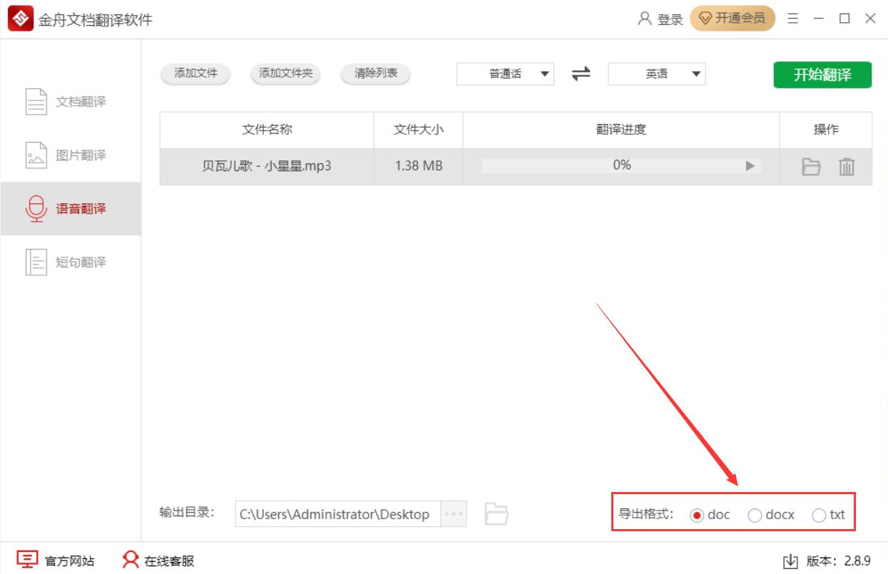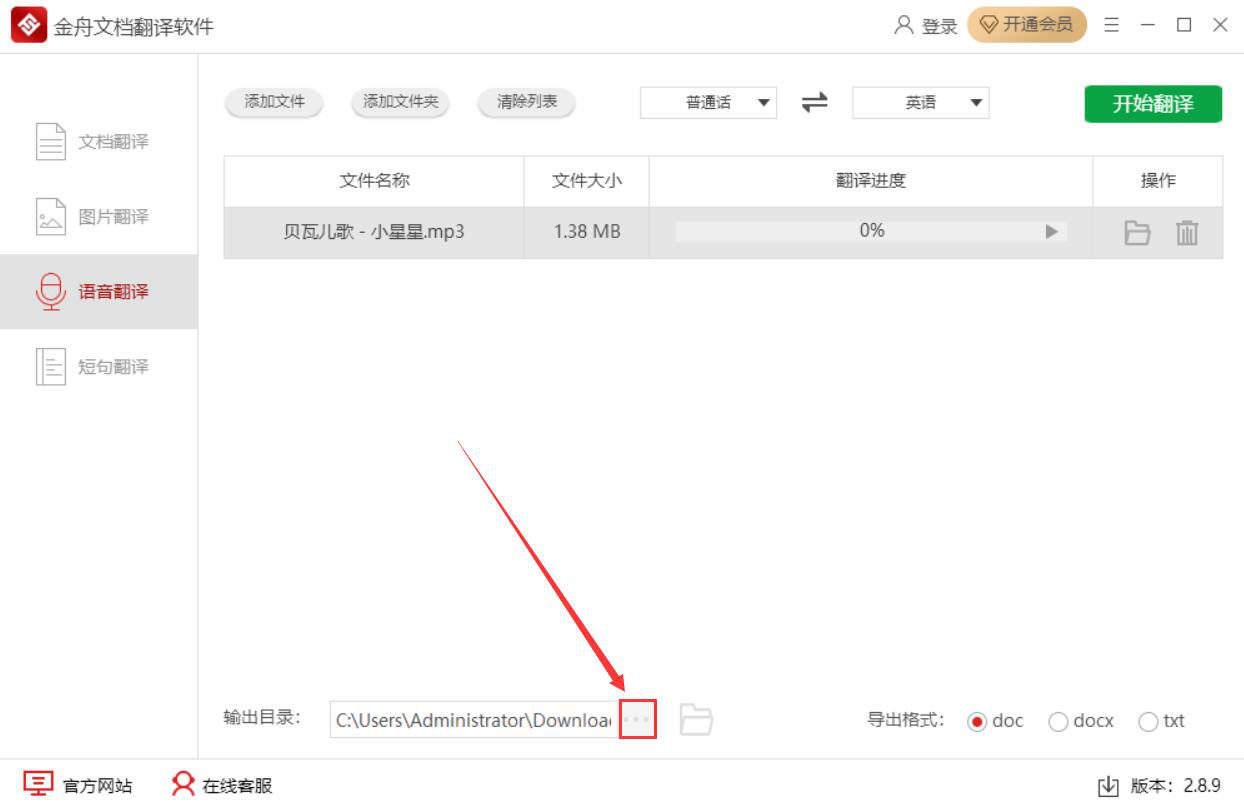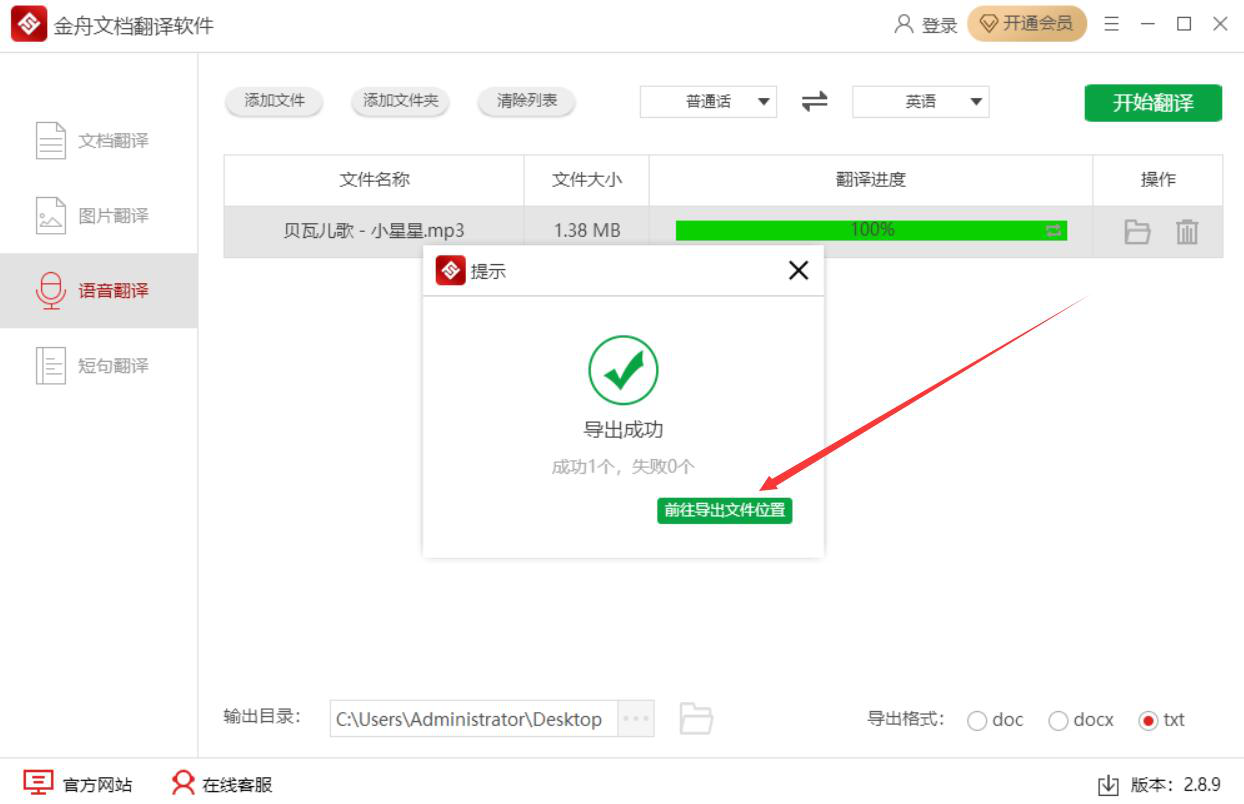 从事外贸工作的人,经常会收到外国客户发的语音文件,有些人翻译能力差,可能会一遍又一遍地去听语音,试图了解语音讲解的内容。可是,这样会耗费很多时间,而且翻译出来的结果也不一定正确。为了解决这问题,我们可以用金舟文档翻译软件翻译语音,考虑到很多人没操作过,本文就为大家分享金舟文档翻译软件翻译语音的教程。  金舟文档翻译软件如何翻译语音内容? 1、首先,我们打开金舟文档翻译软件,先切换至它的“语音翻译”操作界面,并点击界面左上方的“添加文件”按钮。  2、在弹出的窗口中,我们选择需要金舟文档翻译软件翻译的语音文件,并点击“打开”按钮。  3、然后,回到金舟文档翻译软件的语音翻译界面,我们根据自己的需要设置翻译的语言。要注意,被翻译的语言一定要和语音文件的语言一致。  4、如果语音翻译后的结果输出目录需要更改,就点击金舟文档翻译软件界面下方的“…”按钮。  5、接下来,在金舟文档翻译软件弹出的窗口中,我们选择语音翻译后的保存路径,再点击“选择文件夹”按钮。  6、语音翻译的语言、输出目录都设置完成后,我们还可以设置翻译后的结果导出格式。  7、接着,我们点击界面右上方的“开始翻译”按钮,金舟文档翻译软件便开始翻译语言文件。  8、最后,弹出如下图的小窗口提示,则说明金舟文档翻译软件成功地翻译了语音。我们点击“前往导出文件位置”按钮,便可以快速找到翻译后的结果文件。  如果你的翻译基础差,觉得翻译语言文件比较困难,可以使用金舟文档翻译软件来翻译语言,软件支持多国语言的互译,翻译速度快,而且准确率高。 -