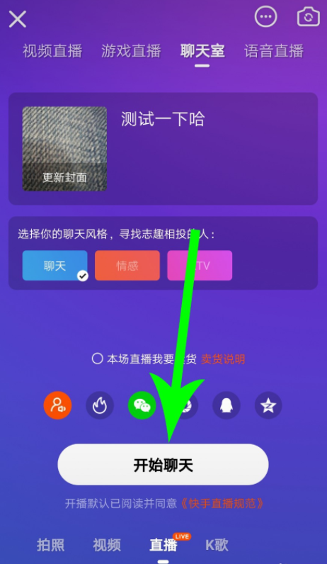 快手APP是现下非常热门的一款短视频直播软件,如果想和众多粉丝互动,用户可以自行创建聊天室,邀请大家进行线上聊天。当然了,你还可以在聊天室切换视频直播,操作很简单,详情请看文章说明。 快手聊天室如何切换成视频直播? 如图,这是快手直播设置界面,在上方功能栏选择【聊天室】37. 世界说大很大,说小很小。大到走了那么久,还没跟对的人相遇,小到围着喜欢的人绕一圈,就看到了全世界。,点击【开始聊天】,  成功创建快手聊天室,界面如图,然后点击右上角的【开启画面】,  快手会为主播打开视频功能,如图,点击箭头指示的图标,即可切换至前置摄像头,现在就可以进行视频直播,   点击【关闭画面】,快手关闭视频功能,并重新打开语音聊天室。  另外,在快手聊天室可以使用闭麦功能,主播可以闭麦,也可以对粉丝闭麦,当然了,粉丝自己也可以闭麦,具体操作如下: 主播关闭自己麦克风 打开快手聊天室,如图,主播点击底部的话筒图标,主播头像上出现“闭麦”文字提示,主播就不能说话了,   主播关闭粉丝麦克风 打开快手聊天室,点击上麦粉丝的头像,底部出现弹框,选择【闭麦】,   粉丝的头像上出现“闭麦”文字提示,他就不能在聊天室说话了。  粉丝自己关闭麦克风 粉丝打开聊天室,点击底部的麦克风图标,然后点击后头像上出现“闭麦”提示,就不能在聊天室说话了。  了解更多精彩教程资讯,关注wmzhe.com。 -