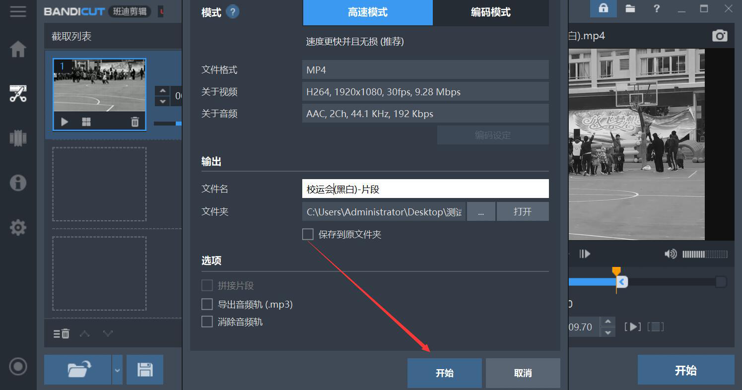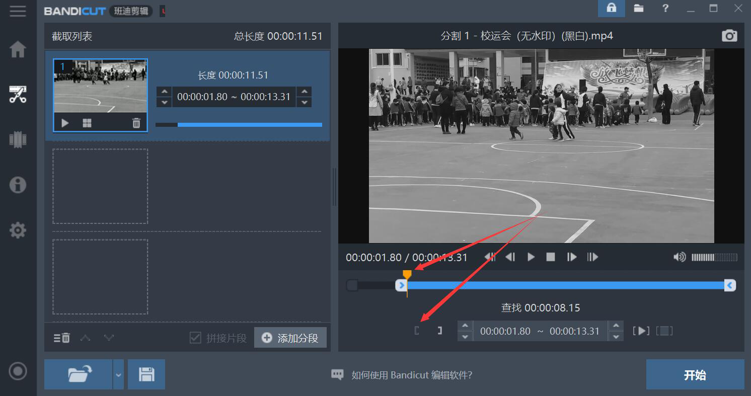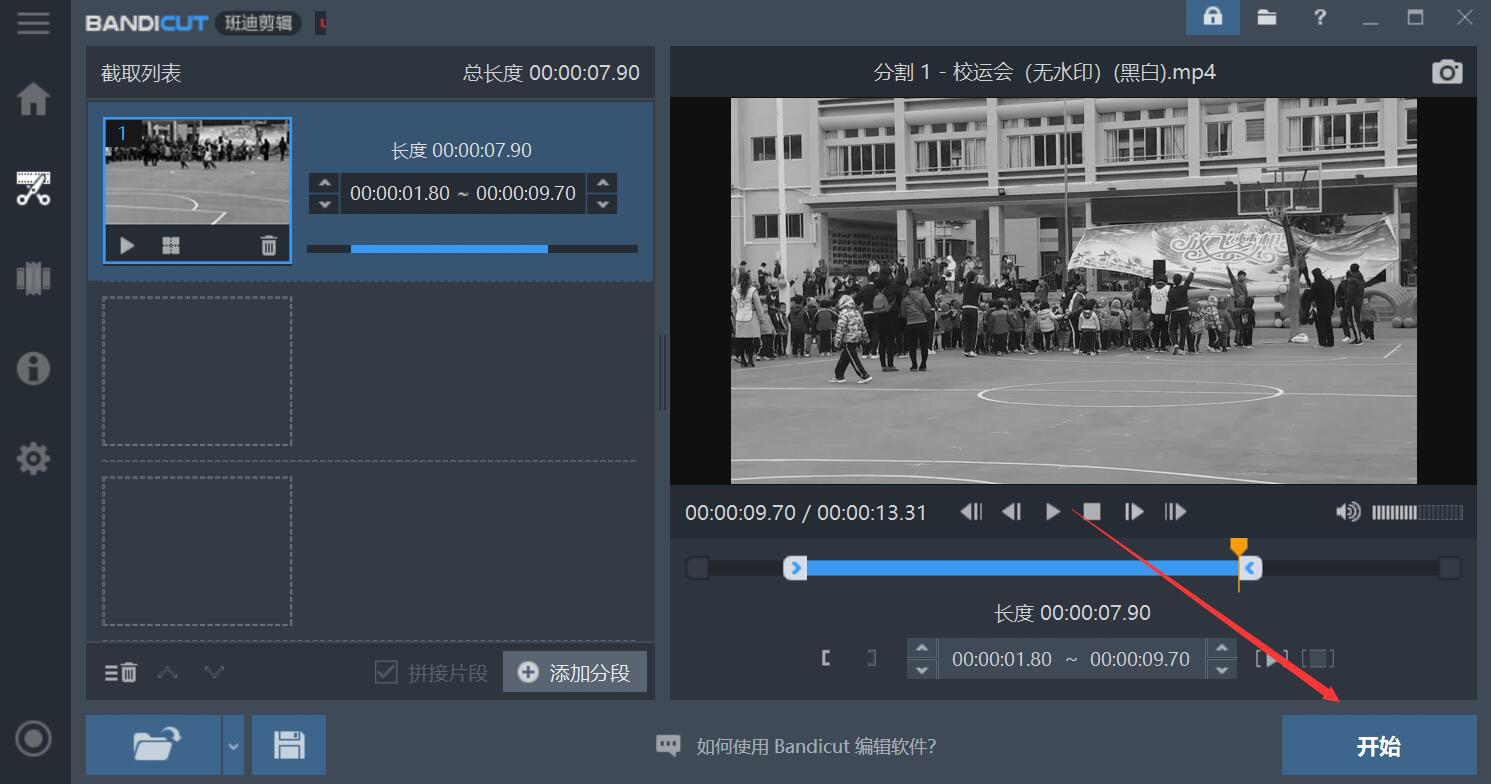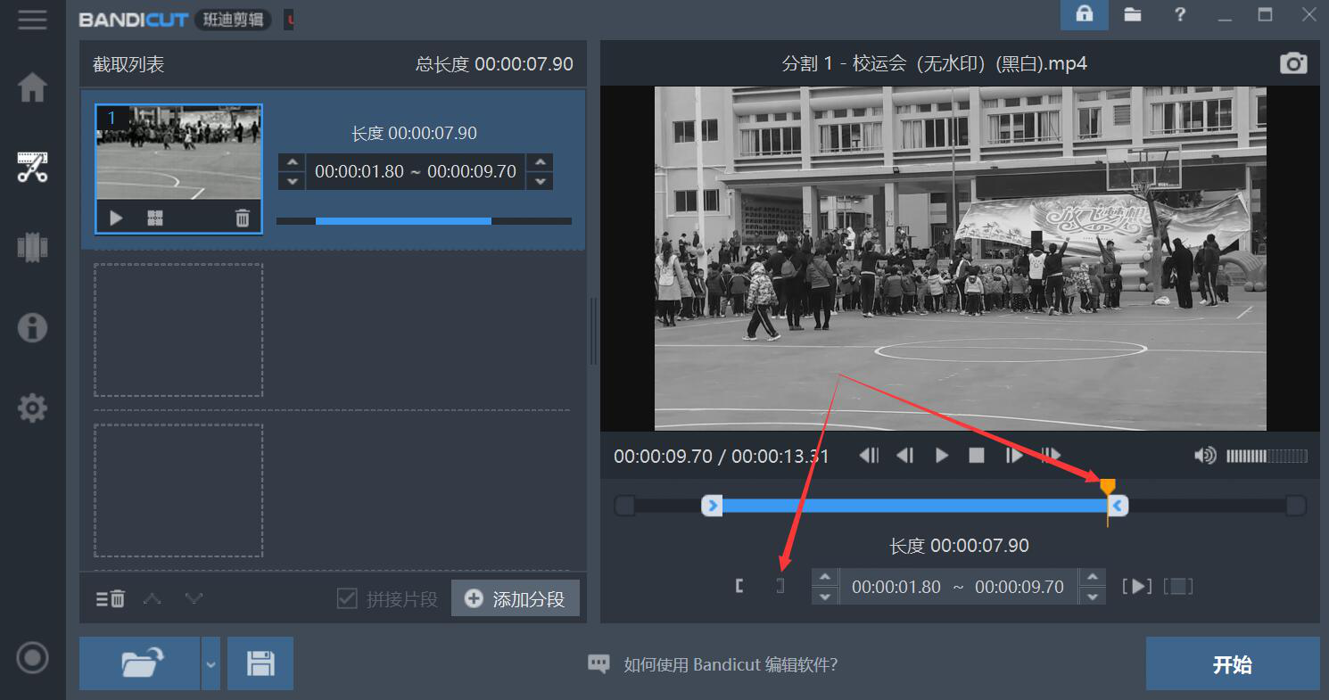 很多人会因为喜欢某个视频片段而将整个视频下载下来,可是,后续想要重新看该片段的话,还得将整个视频都看一遍,从而带来了不愉快的观影体验。为了解决这问题,我们可以使用Bandicut截取视频片段。考虑到很多人都没接触过该软件,不懂如何操作,下面就为大家讲解如何使用Bandicut截取视频片段。  如何使用Bandicut截取视频片段? 1、首先,我们打开Bandicut,在界面中点击“截取”功能选项。  2、在弹出的窗口中,我们选择需要Bandicut截取片段的视频,并点击“打开”按钮。  3、然后,回到Bandicut操作界面。在视频预览窗口下方,将时间轴上的黄色指针定位在视频截取的开始位置,并点击“[”按钮。  4、同样的,我们将时间轴上的黄色指针定位在视频截取的结束位置,并点击“]”按钮。  5、需要Bandicut截取的视频片段确定后,我们点击界面右下方的“开始”按钮。  6、接下来,Bandicut便会弹出参数设置窗口。我们为了视频文件的区分,可以在文件名的输入框中输入截取的视频片段的名称。如果输出的路径需要更改,就点击“…”按钮。  7、在Bandicut弹出的窗口中,我们选择截取的视频片段的保存路径,再点击“选择文件夹”按钮。  8、接着,回到Bandicut的参数设置窗口,我们点击“开始”按钮,Bandicut便开始截取该视频片段。  9、最后,当窗口中的进程一栏显示“完成&40. 抱怨是一种致命的消极心态,一旦自己的抱怨成为恶习,那么人生就会暗无天日,不仅自己好心境全无,而且别人跟着也倒霉。抱怨没有好处,乐观才最重要。rdquo;,如下图,则说明Bandicut成功地将视频片段截取了,并且将它保存到指定的路径中了。我们直接点击“关闭”按钮即可。  不想要整个视频,只想要视频中的某个精彩片段,就可以用Bandicut截取视频片段。此外,Bandicut截取后的视频片段画质是与源视频画质相同的。 -