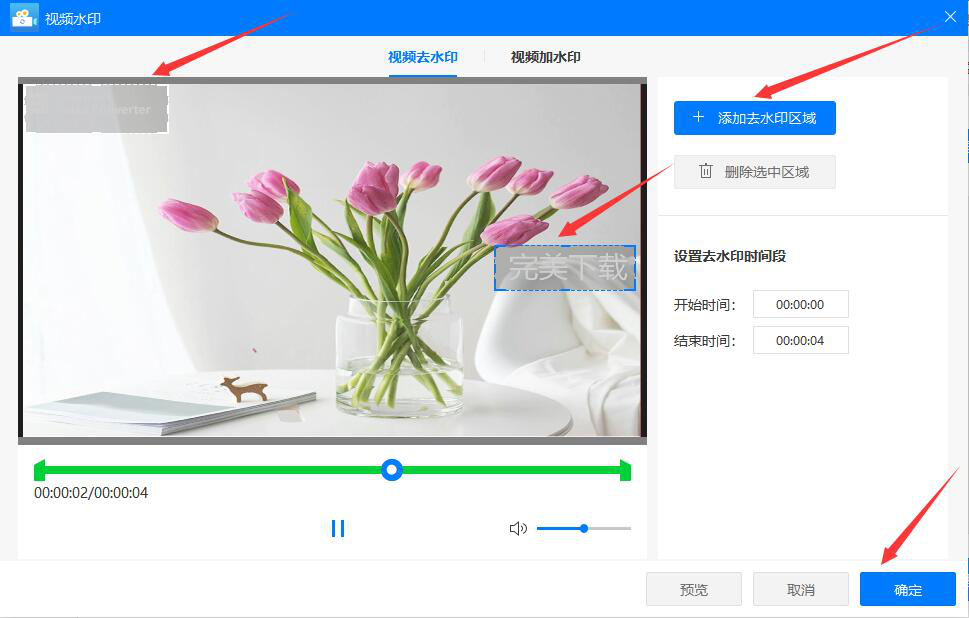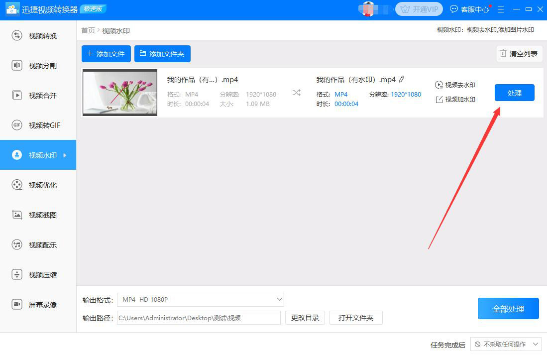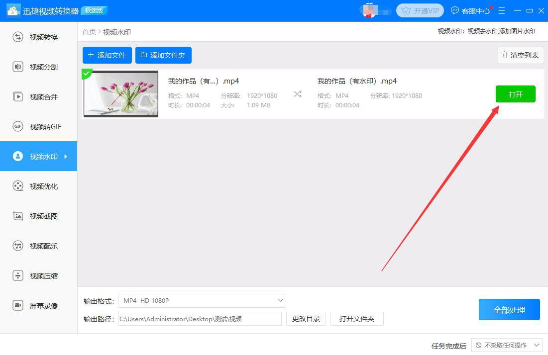 很多时候,我们从网上下载的视频是带有水印的。我们想要用的话,就得先将水印去除,不然起不了自己想要的宣传效果。可是,很多人都不知道该怎么处理。其实,我们可以用迅捷视频转换器去除视频水印,操作上也不复杂,下面就为大家讲解如何使用迅捷视频转换器来去除视频水印。  迅捷视频转换器如何去除视频水印? 1、首先,我们打开迅捷视频转换器,在其向导页面中,点击“视频水印”功能选项。  2、进入迅捷视频转换器的视频水印操作界面,我们点击“+添加文件”按钮。  3、然后,在弹出的窗口中,我们选择需要去除水印的视频,并点击“打开”按钮,将其导入迅捷视频转换器。  4、回到迅捷视频转换器的操作界面,我们在所导入的视频中点击“视频去水印”功能按钮。  5、接下来,在弹出的视频水印编辑窗口中,我们先点击“添加去水印区域”按钮。此时,视频预览窗口中便会同步出现去水印区域选框,我们将选框完全覆盖视频上的水印,如下图,再点击“确定”按钮。  6、回到迅捷视频转换器的操作界面,如果视频去除水印后的输出路径需要更改,我们就点击“更改目录”按钮。  7、在迅捷视频转换器弹出的窗口中,我们选择去除了水印的视频的保存路径,再点击“选择文件夹”按钮。  8、视频去除水印后的输出格式和输出路径都设置完成后,我们点击视频中的“处理”按钮,迅捷视频转换器便开始去除视频的水印。  9、最后,当视频中显示如下图32. 失恋后不要放弃对爱情的追求,失恋后就想独身一辈子,这是不现实的。没有爱情的人生是不完美的,应该继续去叩响爱情的大门。的绿色打钩标志,则说明迅捷视频转换器成功地去除了视频中的水印。我们点击“打开”按钮,就可以看到处理后的视频文件了。  下载的视频有水印,没关系,我们可以用迅捷视频转换器来去除视频的水印,无论是文字水印,还是图片水印,软件都能快速去除。 -