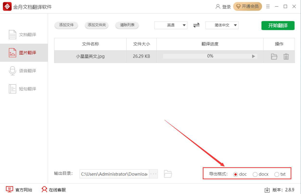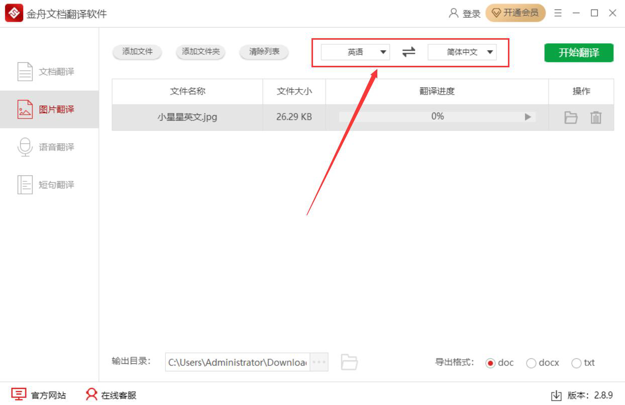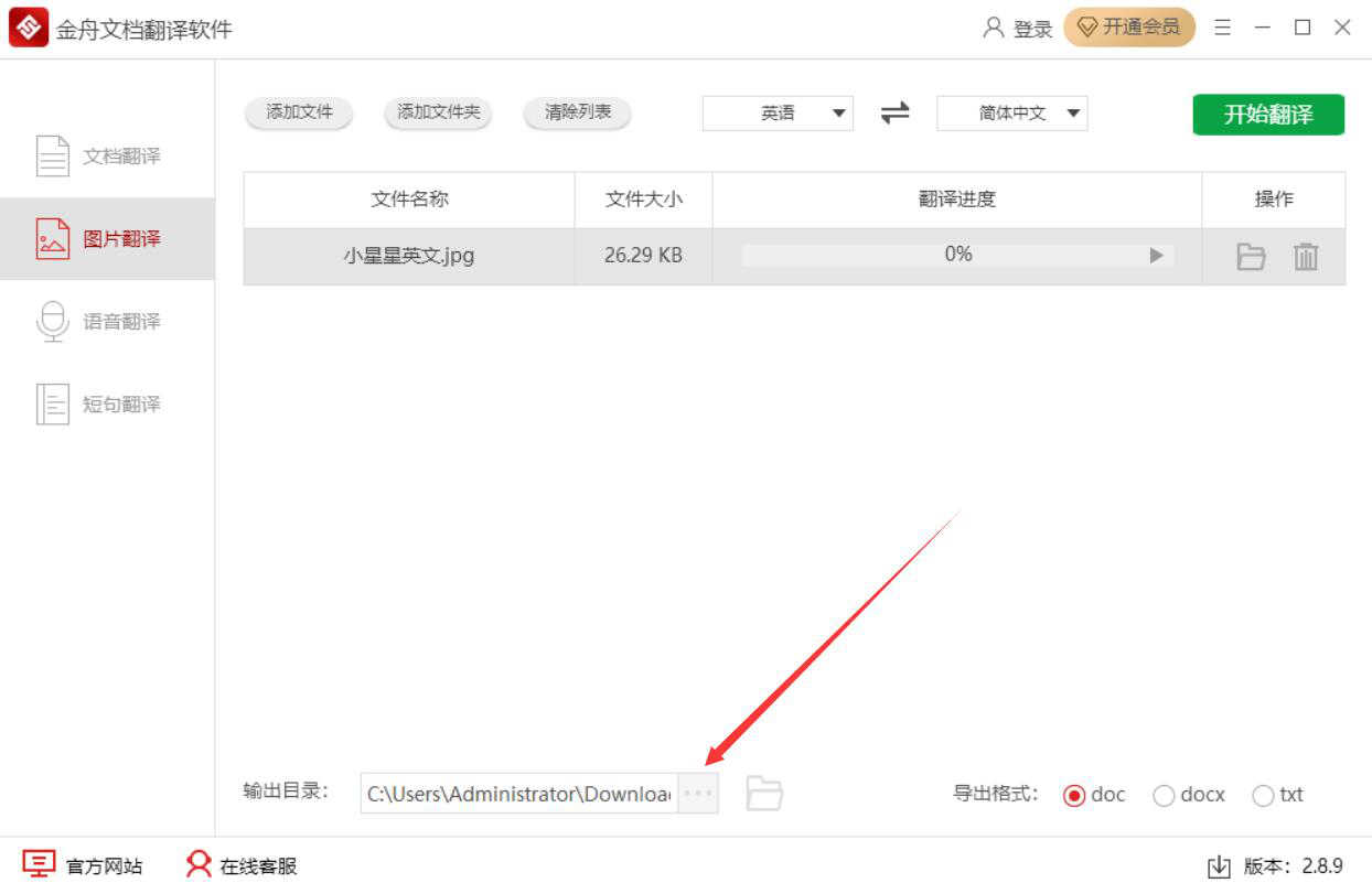 在工作中,我们有时候会收到别人发过来的图片,图片上都是英文。可是,自己的英文水平比较差,不能明白图片上英文都说了什么,而耽误了工作。为了解决这一问题,我们可以用金舟文档翻译软件来翻译图片英文内容。考虑到很多人不懂操作,下面为大家讲解金舟文档翻译软件如何翻译图片英文内容。  金舟文档翻译软件如何翻译图片中的英文内容? 1、首先,我们打开金舟文档翻译软件,切换至“图片翻译”操作界面,并点击“添加文件”按钮。  2、在弹出的窗口中,我们选择需要翻译英文内容的图片,并点击“打开”按钮,将其导入金舟文档翻译软件。  3、然后,我们回到金舟文档翻译软件的图片翻译操作界面,将翻译的语言设置为“英语”,翻译为“简体中文”,如下图。  4、设置好翻译语言,再在金舟文档翻译软件界面的右下方选择导出格式,这里选择的是翻译图片上的英文内容后,将结果导出为doc格式文档。  5、如果翻译图片英文内容杯酒戈矛拼音:bēi jiǔ gē máo释义:比喻在宴会上引起的仇恨。出处:《负曝闲谈》第二十五回就是有天在吴侍郎席上他请教我我没有理他那个人,这真是杯酒戈矛了!示例:三日倾轧性,彼此相阋,各欲得而甘心,~,顷刻倚伏也。★梁启超《新民说·论私德》后的输出目录需要更改,就点击如下图的“…”按钮。  6、接下来,在金舟文档翻译软件弹出的窗口中,我们选择翻译图片英文内容后的结果的保存路径,再点击“选择文件夹”按钮。  7、翻译语言、导出格式、输出目录都设置好了后,我们点击界面右上方的“开始翻译”按钮,金舟文档翻译软件便开始翻译图片上的英文内容。  8、最后,如果软件弹出如下图的窗口提示,就说明金舟文档翻译软件成功地将翻译了图片英文内容的结果导出到指定的路径中了。我们直接点击“前往导出文件位置”按钮即可。  图片上的英文内容看不懂?没关系,我们可以用金舟文档翻译软件将英文内容翻译成中文,并且导出为word文档或者txt记事本,满足后续编辑文档的需要。 -