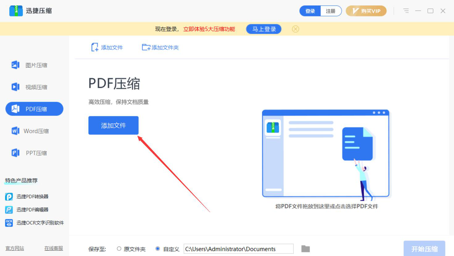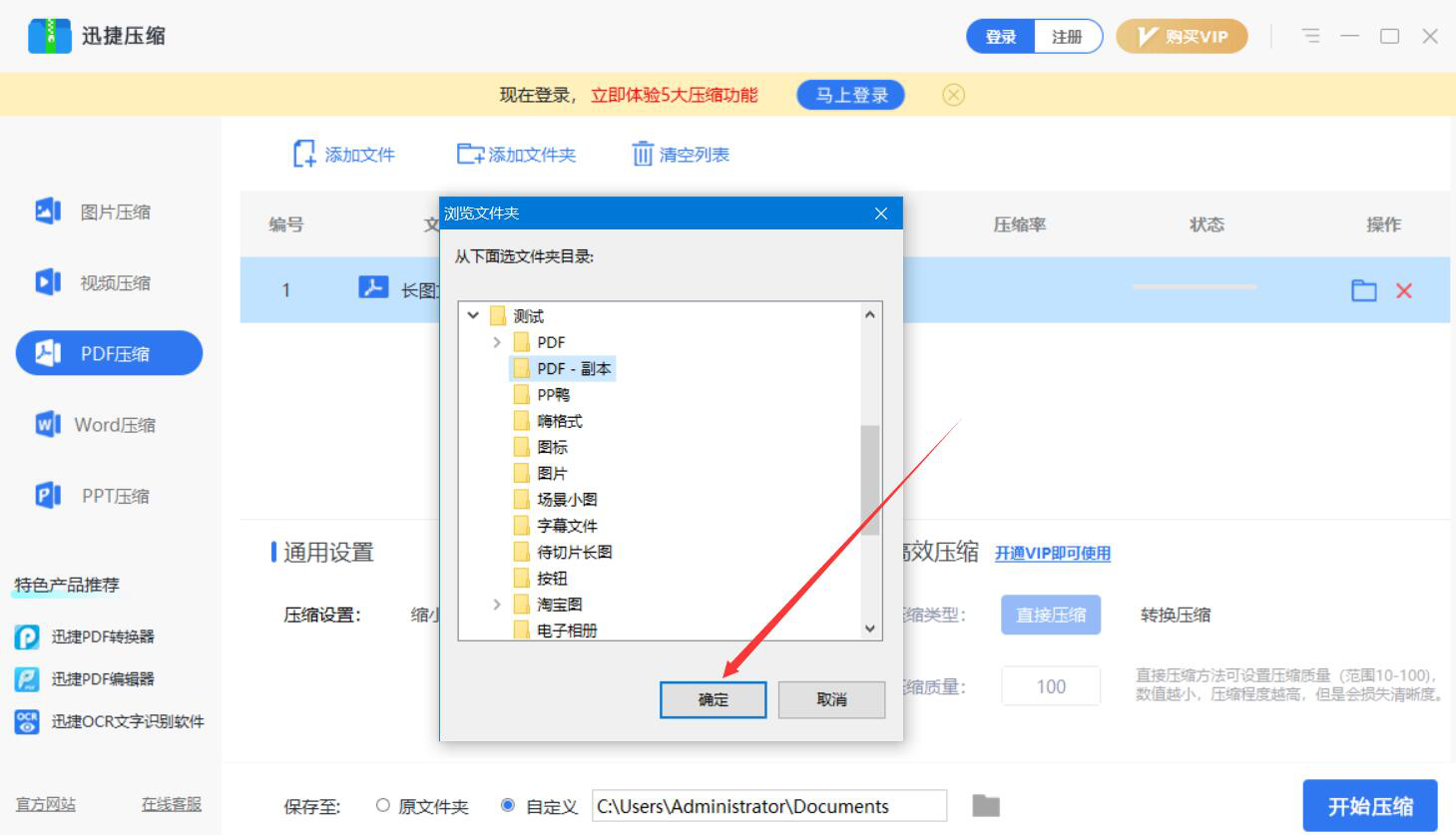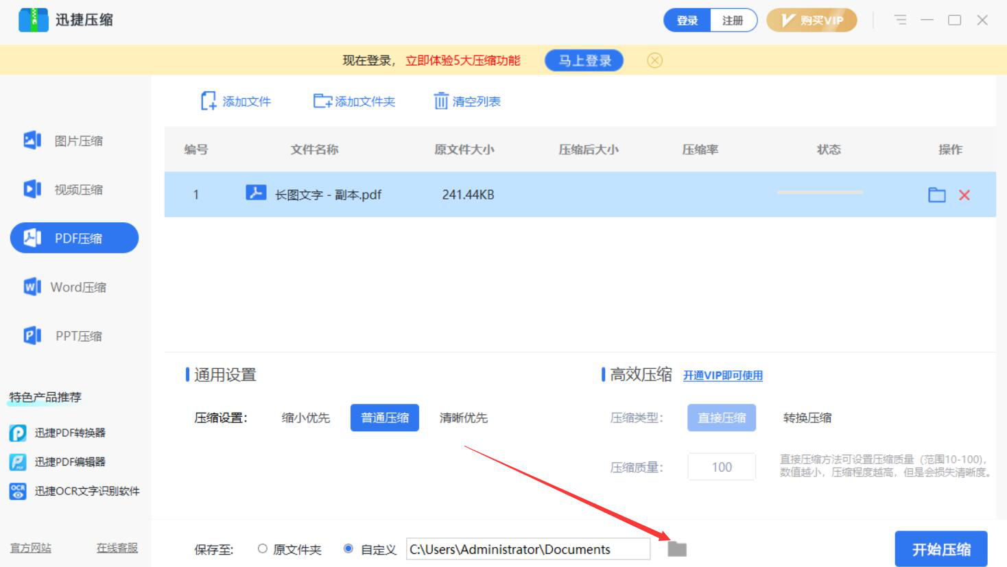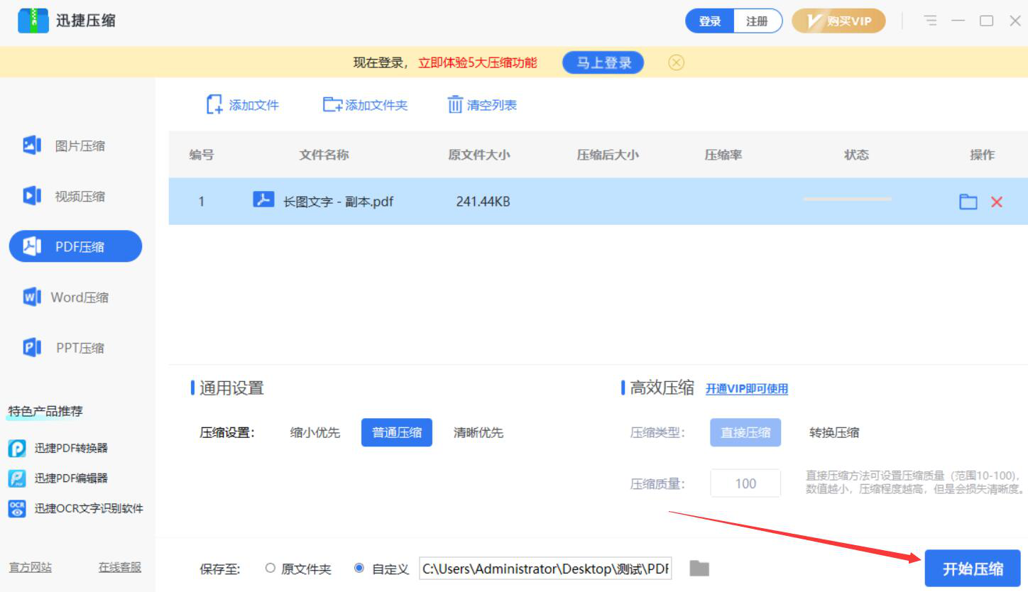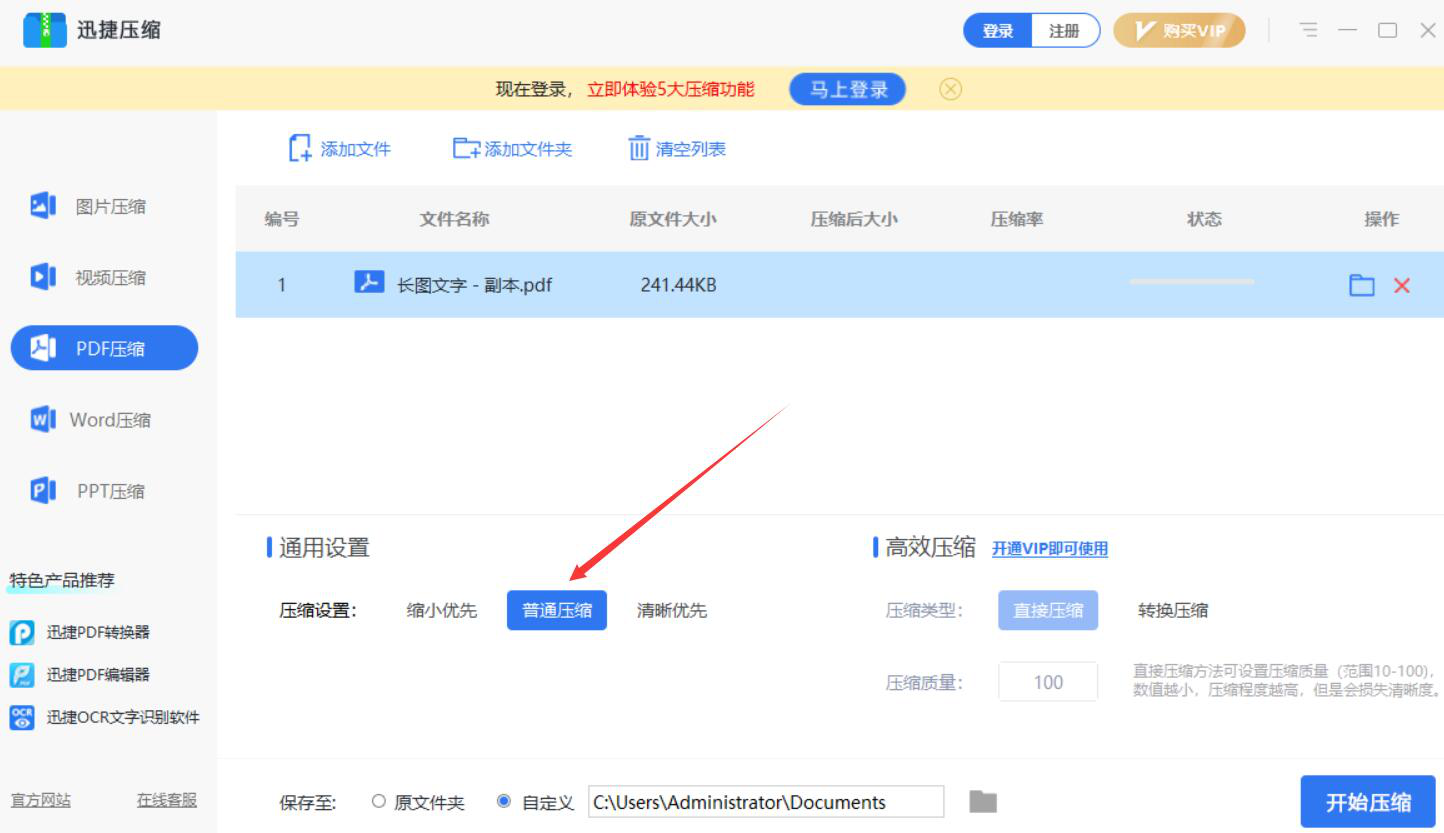很多人在做PDF文件的时候,由于页数太多,整个文件的体积大,搞得都无法上传到某些网站,或者发送给在线好友时发送受到限制。为了解决这一问题,我们可以用迅捷压缩软件来压缩PDF文件。考虑到很多人可能不懂如何操作,所以,下面为大家讲解迅捷压缩如何压缩PDF文件。  迅捷压缩如何压缩PDF文件? 1、首先,我们打开迅捷压缩软件,在其功能向导页面中,点击“PDF压缩”选项。  2、进入迅捷压缩的PDF压缩操作界面,点击界面中的“添加文件”按钮。  3、然后,在弹出的窗口中,选择需要迅捷压缩软件压缩的PDF文件,并点击“打开”按钮。  4、接下来,我们根据自己的需要选择迅捷压缩软件压缩PDF文件的方式,这里选的是“普通压缩”方式。  5、如果默认的路径需要修改,就点击“保存至”一栏中的文件夹图标按钮。  6、在迅捷压缩弹出的窗口中,我们选择压缩了的PDF文件的保存路径,再点击“确定”按钮。  7、PDF文件压缩的方式、路径都设置好了,我们点击界面右下方的“开始压缩”按钮,迅捷压缩便开始压缩PDF文件。  8、最后,当状态显示“输出完成”,则说明迅捷压缩成功地压缩了PDF文件,并将其保存到指定的路径了。我们可以看到PDF文件压缩后的大小和压缩寸步千里拼音:cùn bù qiān lǐ释义:寸步指距离非常短。虽然相距只有寸步,却如同千里之隔。比喻相见非常困难。出处:唐·卢照邻《狱中学骚体》寸步千里兮相闻,思公子兮日将曛。”示例:无率,如下图所示。  PDF文件太大,不仅会影响上传、发送,还会过分占用磁盘空间。为此,我们可以用迅捷压缩软件来压缩文件。此外,迅捷压缩软件还可以一次性压缩多个PDF文件,要注意的是,压缩的强度越高,PDF文件的清晰度就会越低。 -