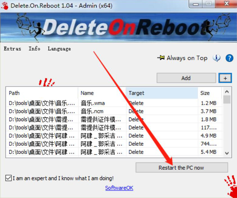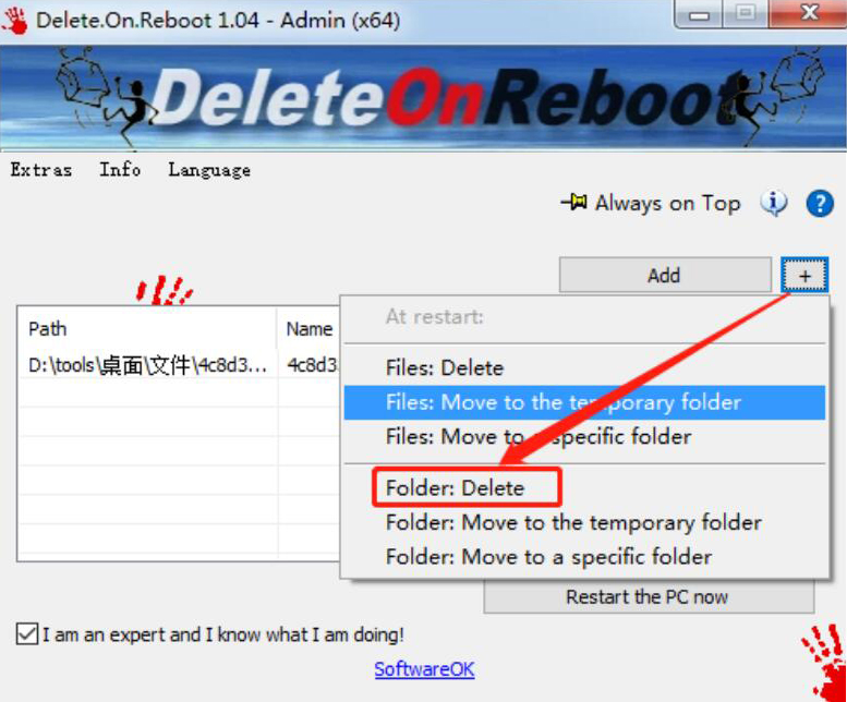 很多人在整理电脑文件的时候才发现有很多文件都是无用的,采用常规的办法来删除却删除不了,不仅占用磁盘空间,还不方便归类文件。为了解决这一问题,我们可以用Delete.On.Reboot重启时删除无用文件。而考虑到很多人不懂如何操作,所以,下面为大家讲解如何用Delete.On.Reboot重启时删除无用文件。  Delete.On.Reboot重启时如何删除电脑无用文件? 1、首先,我们打开Delete.On.Reboot软件。在操作界面中,点击如垂死挣扎拼音:chuí sǐ zhēng zhá释义:垂将近。临死前的挣扎,妄想延长生命。比喻行将灭亡之时的孤注一掷。出处:冯德英《迎春花》第十七章不料,炸成重伤的蒋子金,垂死挣扎地用手里的小剜刀去刺好的腿。”示例:无下图的“+”按钮。  2、此时,Delete.On.Reboot便会展开功能菜单列表,我们点击“Files:Delete”这个文件删除选项。  3、然后,在弹出的窗口中,我们选择需要Delete.On.Reboot重启时删除的文件,并点击“打开”按钮。  4、要删除的文件成功导入后,我们在从“+”菜单列表中点击“Folder:Delete”这个文件夹删除选项。  5、接下来,在Delete.On.Reboot弹出的窗口中,我们选择刚才导入的需要重启时删除的文件所存放的路径文件夹,再点击“确定”按钮。  6、最后,我们回到Delete.On.Reboot操作界面,点击界面右下方的“Restart the PC now”重启电脑按钮,Delete.On.Reboot便会在重启后自动删除该文件。  在整理文件的时候,遇到那些顽固的无法删除的文件,都可以尝试使用Delete.On.Reboot重启时删除这些文件。操作简单,而且删除的成功率高。 -