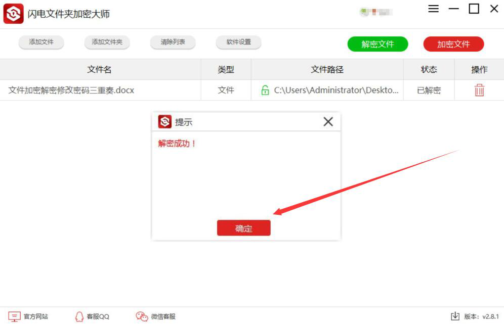 很多人为了防止别人随意阅读文件,会给文件设置密码。如果需要频繁打开文件,那每次都要正确输入密码才能访问,感觉有点麻烦。为了解决这问题,我们可以用闪电文件夹加密大师解密文件。考虑到很多人都不会操作,所以,下面为大家讲解闪电文件夹加密大师如何解密文件。  闪电文件夹加密大师如何解密文件? 1、首先,我们打开闪电文件夹加密大师,点击界面右上方的头像按钮进行登录。  2、登录后,在闪电文件夹加密大师的操作界面中,我们点击左上方的“添加文件”按钮。  3、然后,我们将需要闪电文件夹加密大师解密的文件选中,并点击“打开”按钮。  4、接下来,我们回到闪电文件夹加密大师的操作界面,点击右上方的“解密文件”按钮。  5、此时,闪电文件夹加密大师便会弹出输入密码窗口。我们在文本框中输入之前为文件加密的密码,再点击“确定”按钮。  6、接着,在加密解密进度窗口中,我们可以实时了解到闪电文件夹加密大师解密文件的具体进度,如下图所示。  7、最后,如果弹出如下图的提示窗口,就说明闪电文件夹加密大师成功地解密文件了,直接点击“确定”按钮即可。  给文件设置了访问密码后,觉得每次访问25. 不要再执著于过去的失恋了。执著于过去的失恋,你还将品尝新的失恋或单恋的滋味。都要输入密码,很麻烦,就可以用闪电文件夹加密大师解密文件。它支持解除多种格式的文件密码。 -