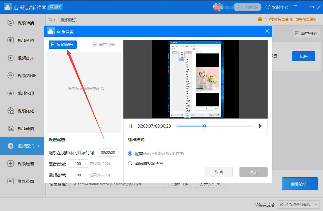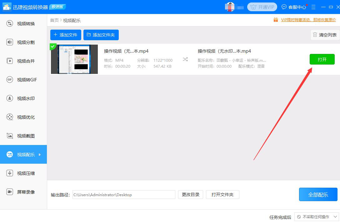 很多人在处理视频的时候,发现视频有画面有人物声音,还添加了字幕,可在观影的时候,觉得还是比较单调,不太能调动人的情绪引发共鸣。为了解决这问题,我们可以用迅捷视频转换器给视频添加配乐。考虑到很多人都没操作过该软件,所以,下面为大家讲解迅捷视频转换器怎么给视频添加配乐。  迅捷视频转换器如何给视频添加配乐? 1、首先,我们打开迅捷视频转换器,在其功能向导页面中,点击“视频配乐”选项。  2、进入迅捷视频转换器的视频配乐操作界面,我们点击左上方的“添加文件”按钮。  3、然后,在弹出的窗口中,将需要迅捷视频转换器添加配乐的视频文件选中,并点击“打开”按钮。  4、我们回到迅捷视频转换器的视频配乐操作界面,点击刚才导入的视频中的“配乐设置”按钮。  5、此时,迅捷视频转换器便会弹出配乐设置的窗口,我们点击窗口左上方的“添加配乐”按钮。  6、接下来,我们选择需要为视频添加的配乐文件,并点击“打开”按钮,将其也导入迅捷视频转换器。  7、在配乐设置窗口中,我们根据自己的实际需要,设置配乐的开始时间、音量,再点击窗口右下方的“确定”按钮。  8、如果添加了配乐后的视频文件的输出路径需要更改,就点击迅捷视频转换器界面下方的“更改目录”按钮。  9、在迅捷视频转换器弹出的窗口中,我们选择视频添加了配乐后的保存路径,再点击“选择文件夹”按钮。  10、回到操作界面,我们点击视频中的“配乐”按钮,迅捷视频转换器便开始为视频添加配乐。  11、最后,当视频中显示如下图的绿色打钩标志,说明迅捷视频转换器成功地给视频添加了配乐,并将其保存到指定的路径中了。我们点击“打开”按钮,即可快速找到处理后的视频。  视频有画面、有声音、有字幕,还觉得感觉上有点欠缺,就可以用迅捷视频转换器给视频添加配乐。而寸长片善拼音:cùn cháng piàn shàn释义:寸长一点儿长处。片零碎的。形容微小的长处和优点。出处:宋·欧阳修《乞补馆职札子》稍有寸长片善为人所称者,皆已擢用之矣。”示例:无且它可以自由设置配乐的开始时间,非常的人性化。 -