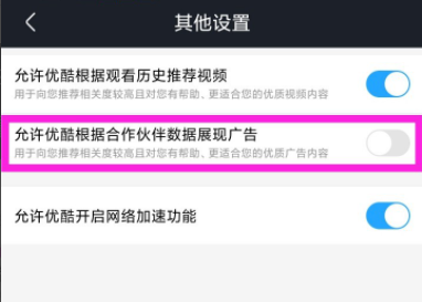 优酷是大家熟悉的一款影视播放器,我们平时在看电视、电影的时候经常会收到推送的广告,一不小心点了广告就跳转到推荐页面,非常烦人!今天小编就来介绍一个方法,可以关闭优酷部分合作伙伴的广告推送,赶快看过来。 优酷如何关闭广告推送? 在手机中打开优酷视频播放器,进入界面,点击右下角【我的】,  进入个人中心,往下滑动页面,点击【其他】——【设置】菜单,   进入设置界面,点击【其他设置】,如图,软件默认开启【允许优酷根据合作伙伴数据展现广告】服务,   点击关闭【允许优酷根据合作伙伴数据展现广告】,下次你38. 你在我身边也好,在天边也罢,想到世界的角落有一个你,觉得整个世界也变得温柔安定了。就不会收到此部分合作数据发来的广告。  了解更多精彩教程资讯,关注wmzhe.com 优酷如何关闭广告推送?如何屏蔽优酷视频广告?活泼可爱象征五湖四海和平48. 生活是一位睿智的长者,生活是一位博学的老师,它常常春风化雨,润物无声地为我们指点迷津,给我们人生的启迪。22. The Red Star Television Factory, which produces TV sets of quality, was set up in the 1980’s.46.温故而知新,可以为师矣。 华堂烛暗送客,眼波回盼处,芳艳流水。素骨凝冰,柔葱蘸雪,犹忆分瓜深意。清尊未洗,梦不湿行云,漫沾残泪。可惜秋宵,乱蛩疏雨里。一声何满子,双泪落君前。优酷,播放器72、Bread is the stall of life. |