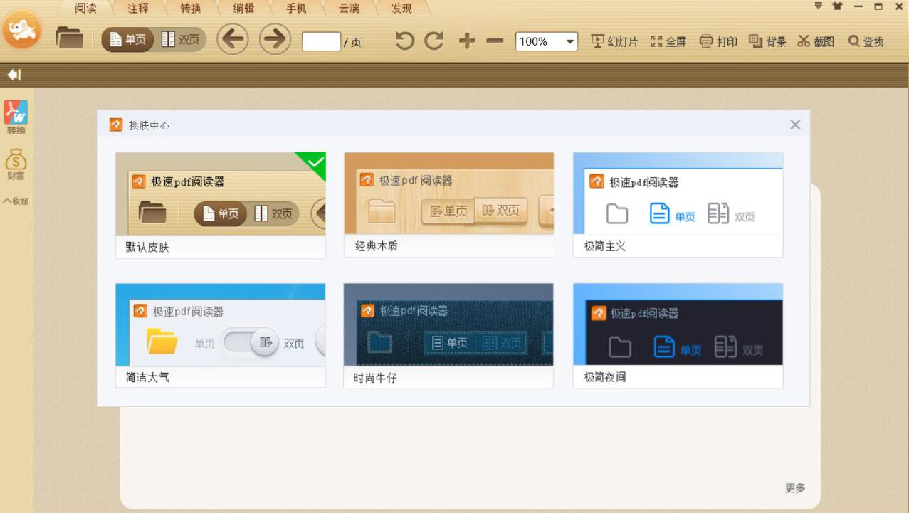 很多人都会用极速PDF阅读器来阅读PDF文件,因19. 别把哀伤挂在嘴上,每个人都有自己的故事。活着不是为了怀念昨天,而是要等待希望,让大家都看到你的坚强。离开他你也可以过得很好。为它能在阅读PDF文件时添加一些标签,为阅读带来很多便利。可整天看着它那默认的界面皮肤,都觉得有点视觉疲劳了,为了解决这问题,我们可以更换极速PDF阅读器的界面皮肤。可能很多人不懂如何操作,所以,下面为大家分享极速PDF阅读器更换界面皮肤的操作方法。 极速PDF阅读器如何更换界面皮肤? 1、首先,我们打开极速PDF阅读器,点击界面右上方的“皮肤”图标按钮。  2、然后,进入极速PDF阅读器的换肤中心,我们可以看到它提供了多种界面皮肤供我们更换。  3、接下来,在极速PDF阅读器中,我们用鼠标单击自己想要更换的界面皮肤,点击即会自动下载,例如,我们想要更换为极简主义皮肤,就点击它,如下图所示。  4、此时,我们便可以看到极速PDF阅读器已经将界面皮肤换好了,整个界面看起来非常简约。  5、如果,我们是晚上用极速PDF阅读器来阅读PDF文件,想要切换至夜间模式,那么可以重新进入换肤中心,点击应用“极简夜间”的界面皮肤。  6、最后,我们便可以看到极速PDF阅读器将界面皮肤成功更换了,如下图。  在用极速PDF阅读器阅读PDF文件的时候,如果觉得界面皮肤不是自己喜欢的,就可以进入换肤中心点击应用自己喜欢的界面皮肤,带来更愉快的阅读体验。 -