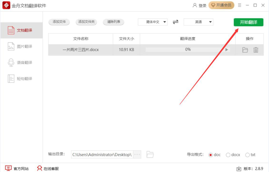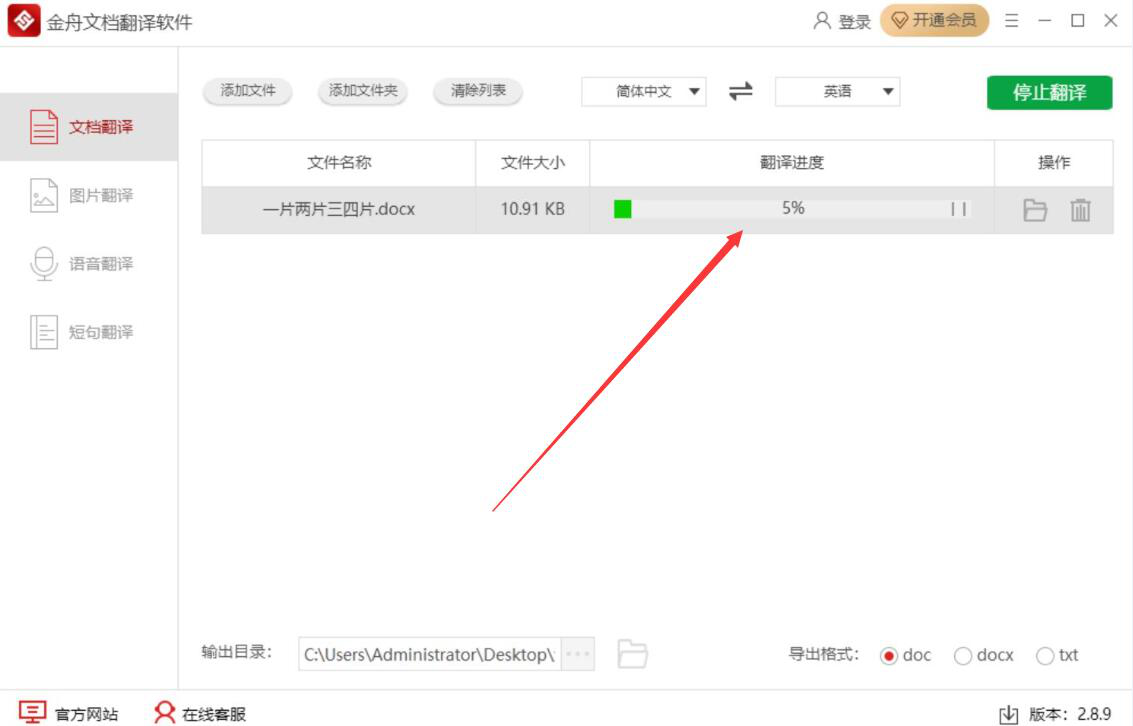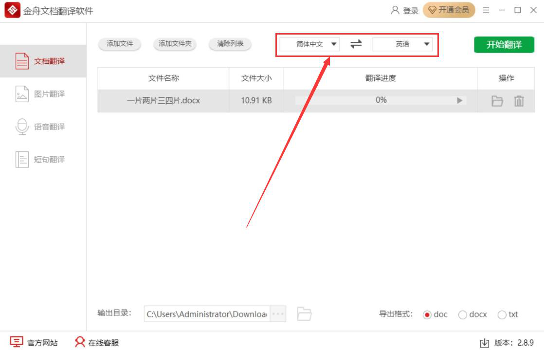 在工作中,很多人都需要将自己做好的中文文档翻译成英文,发送给外国客户。可是,如果英语水平不高、翻译能力差的话,那就会觉得有种束手无策的感觉了。为了解决这问题,我们可以用金舟文档翻译软件将文档翻译成英文。而考虑到很多人不懂如何操作,下面就为大家讲解如何用金舟文档翻译软件将文档翻译成英文。  金舟文档翻译软件如何将文档翻译成英文? 1、首先,我们打开金舟文档翻译软件,在左侧功能栏中切换至“文档翻译”操作界面,并点击界面中部的“+”按钮。  2、在弹出的窗口中,我们选择需要金舟文档翻译软件翻译成英文的文档,并点击“打开”按钮。  3、然后,回到金舟文档翻译软件的文档翻译操作界面,从界面顶部可以看到翻译的语种,我们设置为简体中文翻译成英语,如下图所示。  4、如果文档翻译成英文后的输出目录需要更改,就点击金舟文档翻译软件界面下方的“…”按钮。  5、接下来,在金舟文档翻译软件弹出的窗口中,选择文档翻译成英文后的保存路径,再点击“选择文件夹”按钮。  6、回到金舟文档翻译软件的文档翻译操作界面,点击界面右上方的“开始翻译”按钮。  7、此时,我们在界面中,可以实时了解金舟文档翻译软件将文档翻译成英文的具体进度。  8、最后,如果弹出如下图的窗口提示,则说明金舟文档翻译软件成功地将文档翻译成英文了。我们点击“前往导出文件位置”按钮,即可快速查看翻译好的英文文档了。  英语翻译能力差,觉得要将整个中文文档翻译成英文,实在是太难了?没关系,我们可以用金舟文档翻译软件将文档翻译成英文。它翻译的速度非常快,而且准确率高。 -