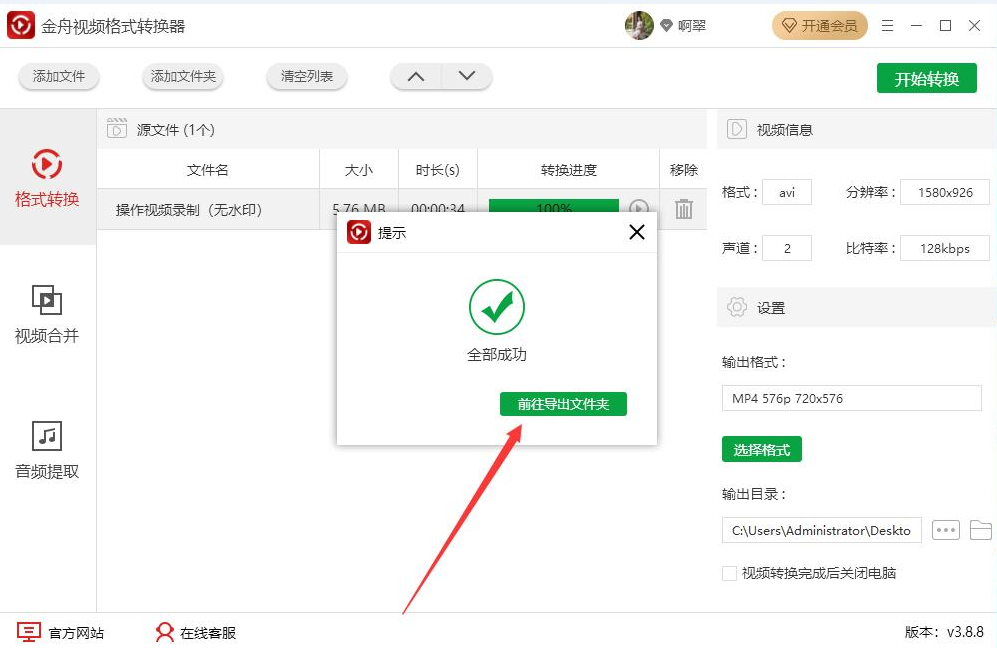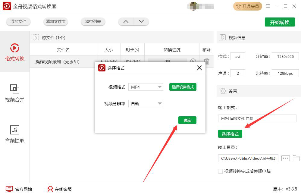 很多人说自己从网上下载了一个AVI格式的视频,想用自己电脑中的播放器来播放,却播放不了。为了解决这问题,我们可以用金舟视频格式转换器将AVI转换成MP4。因为MP4是通用的格式,基本所有的播放器都支持播放。考虑到有些人可能不懂如何操作,所以,下面为大家讲解如何用金舟视频格式转换器将AVI转换成MP4。  金舟视频格式转换器将AVI转换成MP4? 1、首先,我们打开金舟视频格式转换器,先切换至“格式转换”操作界面,并点击界面中部的“+”按钮。  2、在弹出的窗口中,将需要转MP4的AVI视频文件选中,并点击“打开”按钮,将其导入金舟视频格式转换器。  3、然后,回到金舟视频格式转换器,点击界面右侧的“选择格式”按钮,同时,在弹出的小窗口中选择“MP4”的视频格式,并根据自己的需要选择视频分辨率,再点击“确定”按钮。  4、接下来,如果AVI转换后的MP4的视频的输出目录需要更改,就点击金舟视频格式转换器界面右侧的“…”按钮。  5、在金舟视频格式转换器弹出的窗口中,我们选择AVI转MP4后的视频保存路径,再点击“选择文件夹”按钮。  6、AVI转MP4的格式和路径都设置好了后,我们点击界面右上方的“开始转换”按钮,金舟视频格式转换器便开始将AVI转MP4。  7、最后,弹41. 无论世界怎么变,无论你的心还在不在,我都要告诉你:我依然爱你,你永远都是我心中最大的眷恋。出如下图的小窗口提示,则说明金舟视频格式转换器成功地将AVI转MP4。我们点击“前往导出文件夹”按钮,就可以快速找到转换后的MP4视频了。  AVI格式的视频在电脑中打不开?我们可以用金舟视频格式转换器将AVI转MP4。它不仅转换速度非常快,而且转换后的视频画质是和源视频一样的。 -