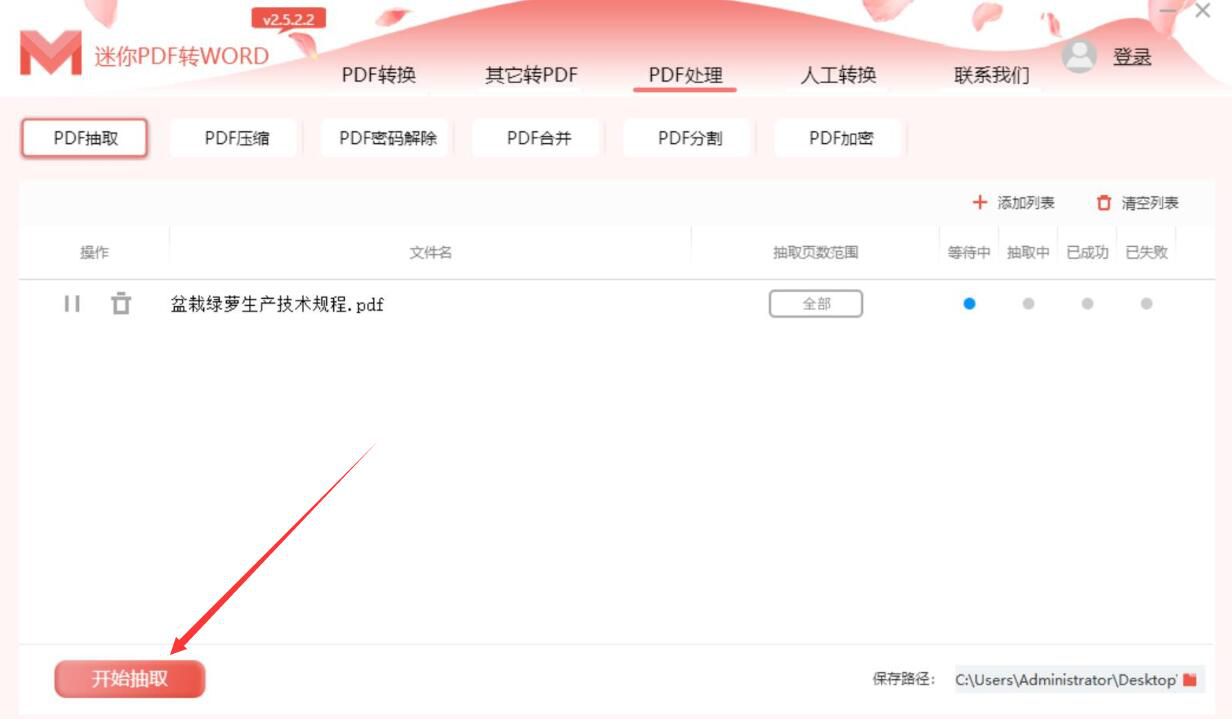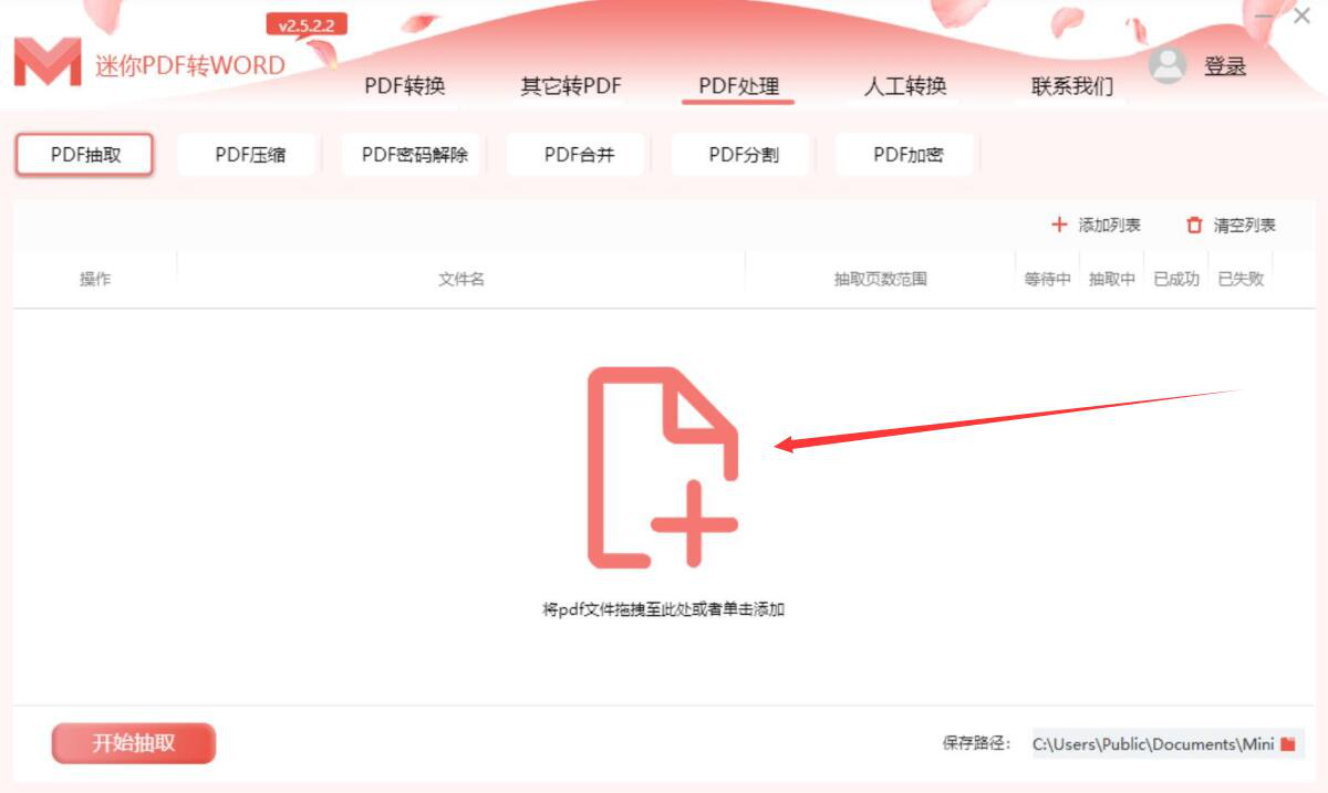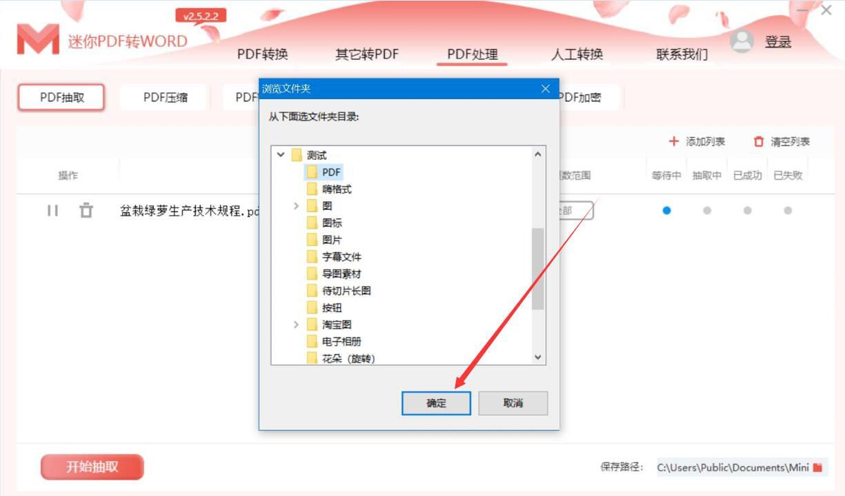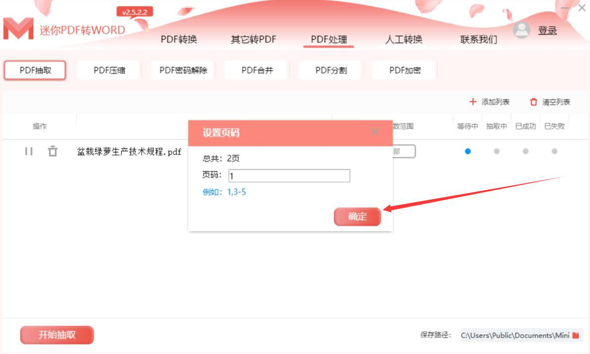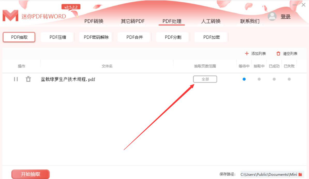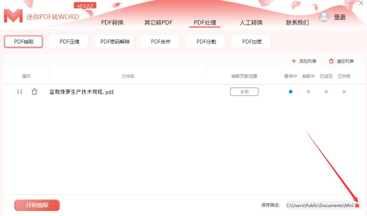 很多人在编辑文件前,都会先从网上下载相关的PDF文件资料,真正能为自己所用的可能就只有某一页,甚至几页,可自己又不懂怎么将它抽取出来。其实,我们可以用迷你PDF转Word软件抽取PDF文件页面。考虑到很多人没操作过,下面就为大家讲解迷你PDF转Word软件如何抽取PDF文件页面。  迷你PDF转Word软件如何抽取PDF文件页面? 1、首先,我们打开迷你PDF转Word软件,先切换至“PDF处理”菜单中的“PDF抽取”操作界面,并点击界面中部的“+”按钮。  2、在弹出的窗口中,选择需要抽取页面的PDF文件,点击“打开”按钮,将其导入迷你PDF转Word软件。  3、然后,我们回到迷你PDF转Word软件的PDF抽取界面,再点击界面中的“全部”按钮。  4、此时,迷你PDF转Word软件便会弹出设置页码的窗口。我们在页码中输入想要抽取的PDF页面,再点击“确定”按钮。  5、如果抽取了页面的PDF文件的保存路径需要更改,就点击迷你PDF转Word软件界面右下方的文件夹图标按钮。  6、接下来,在迷你PDF转Word软件弹出的窗口中,我们选择抽取了页面的PDF文件的保存路径,再点击“确定”按钮。  7、最后,我们点击界面左下方的“开始抽取”按钮,迷你PDF转Word软件便开始抽取PDF文件页面。  只想使用PDF文件中的某个页面或者某些页面,都可以用迷你PDF转Word软件来抽取页面。不过,如果抽取的不是单页、连续页面,而是多个不同页面的话,那要注意用逗号分隔开。 -