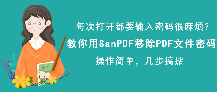 很多人为了PDF文件的安全性,都会给它设置密码。如果PDF文件使用频率高,每次阅读该PDF文件前都必须要正确输入密码才能访问,让很多人觉得很麻烦。那么,为了解决这问题,就可以用SanPDF移除PDF文件密码。考虑到很多人可能不懂操作,下面就为大家讲解如何使用SanPDF移除PDF文件密码。  如何使用SanPDF移除PDF文件密码? 1、首先,我们打开SanPDF,在其功能向导页面中,点击“PDF解密”选项。  2、此时,SanPDF便会弹出PDF解密的窗口,我们点击“选择”按钮。  3、然后,在弹出的打开文件窗口中,选择需要SanPDF移除密码的PDF文件,并点击“打开”按钮。  4、接下来,回到SanPDF的PDF解密窗口,我们在密码文本框中输入我们之前为该PDF文件设置的密码,再点击“解密&保存”按钮。  5、最后,我们在SanPDF弹出的“Save To”窗口中,设置SanPDF移除密码后的PDF文件的保存路径,为了方便区分文件,对其重命名后,点击“保存”按钮,SanPDF便开始移除该PDF文件的密码。  寸利必得拼音:cùn lì bì dé释义:寸利微小的利益。微小的利益也必须得到,不能放弃。形容斤斤计较个人的得失。出处:无示例:无为PDF文件加密,固然可以提高文件的安全性。可是每次想要访问,都要先输入正确的密码,让很多人觉得很麻烦。为此,可以用SanPDF移除PDF文件密码,成功移除密码,再次打开PDF文件,便不会再要求输入密码。 -