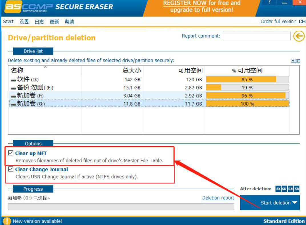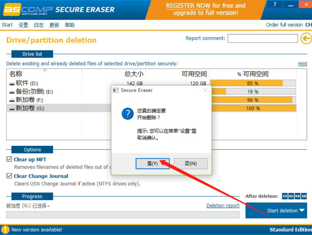 很多人买新电脑回来后都会先给磁盘分区,而且往往分区时没考虑,就分了好多个分区。可结果发现电脑用久了,读写速度也跟着变慢了。为了解决这问题,我们可以用Secure Eraser删除磁盘分区。可能很多人不懂该怎么操作,下面就为大家讲解如何用Secure Eraser删除磁盘分区。  如何使用Secure Eraser删除磁盘分区? 1、首先,我们打开Secure Eraser软件,在其功能向导页面中点击“Drive/partition deletion”驱动器/分区删除这个功能选项。  2、进入分区操作界面,我们单击选中需要Secure Eraser删除的磁盘分区,再点击界面中的“Options”选项按钮。  3、然后,我们将“Clear up MFT”和“Clear Change Journal”这两个选项勾选,这样一来,Secure Eraser删除磁盘分区时才会更彻底。  4、接下来,为了让Secure Eraser删除所选的磁盘分区,我们点击界面右下方的“Start deletion”按钮。  5、最后,弹出如下图的窗口提示,我们直接点击“是”按钮,Secure Eraser便开始删除所选的磁盘分区。  电脑分区时,分区太多?想要删除,就可以用Secure Eraser来删除多余的磁盘分区。而且,我们可以发现,用Secure Eraser删除磁盘分区后,电脑的读写速度会变得更快一些。 -