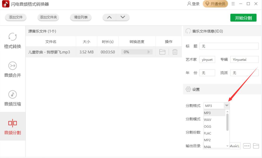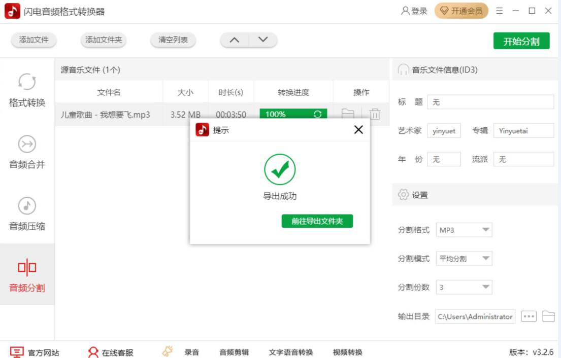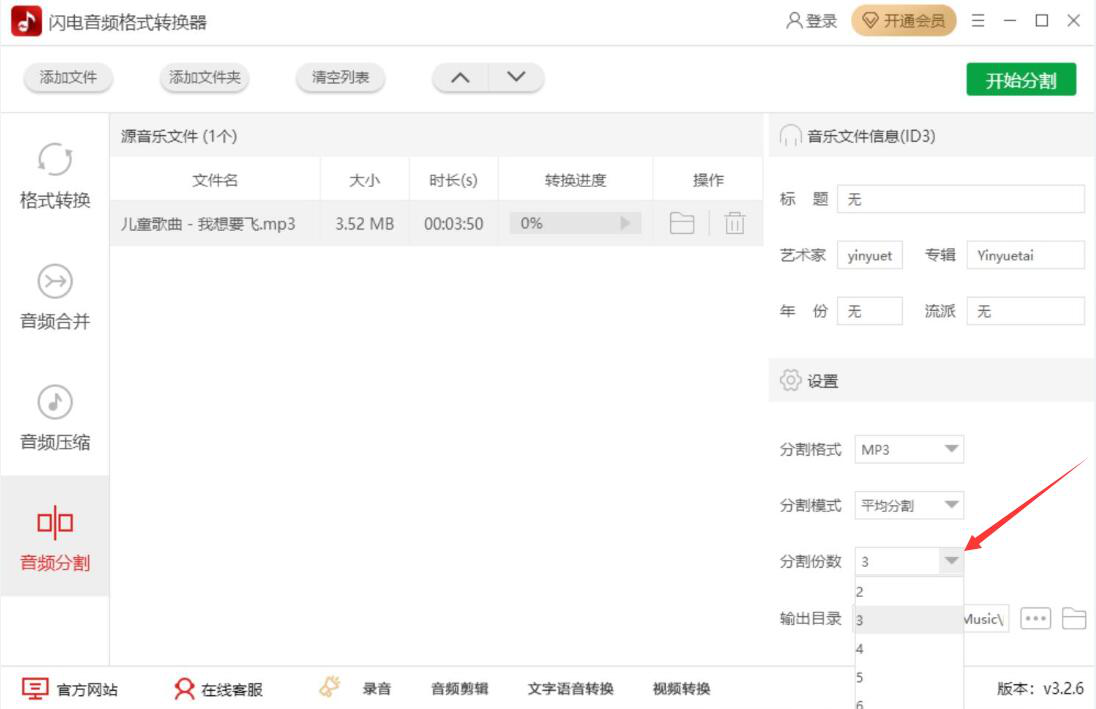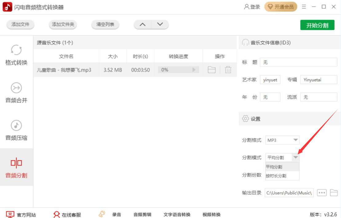 很多人都说手机自带的铃声比较难听,于是就从网上下载了喜欢的音频。而将音频作为铃声后,才发现铃声效果不是自己最想要的那部分。因为手机响铃最长是54秒,我们想要用音频片段作为铃声,就需要对音频分割,可以用闪电音频格式转换器来实现,将音频分割后,再应用为铃声。下面就来为大家讲解闪电音频格式转换器如何分割音频。  闪电音频格式转换器如何分割音频? 1、首先,我们打开闪电音频格式转换器,先在左侧功能栏中切换至“音频分割”操作界面,再点击界面中部的“+”按钮。  2、在弹出的窗口中,将需要分割的音频文件选中,并点击“打开”按钮,将其导入闪电音频格式转换器。  3、然后,回到闪电音频格式转换器。在右侧的设置中,先根据自己的需要选择音频分割后的格式,,这里我们选择MP3格式。  4、再从设置中,根据自己的需要设置音频分割模式。可以看到它有平均分割和按时长分割两种方式,这里选择的是“平均分割”的模式。  5、除了可以设置音频分割的格式、模式,在闪电音频格式转换器中,我们还可以根据自己的需要选择音频分割的份数。  6、接下来,如果音频分割后的文件输出目录需要更改,就点击如下村夫俗子拼音:cūn fū sú zǐ释义:指粗野鄙俗的人。出处:明·胡文焕《群音类先〈赛四节记·踏雪寻梅〉》今朝乐事古应稀,数瓯满饮,休负明时,村夫俗子,枉营营岂知滋味。”示例:无图的“…”按钮。  7、在弹出的窗口中,选择音频分割后的保存路径,再点击“选择文件夹”按钮。  8、音频分割的格式、模式、份数、路径都设置完成后,我们点击界面右上方的“开始分割”按钮,闪电音频格式转换器便开始分割音频。  9、最后,如果弹出如下图的窗口提示,就说明闪电音频格式转换器成功地分割了该音频,并将分割好的音频片段保存到指定的路径了。  音频文件太长了,不支持全部都作为手机铃声,就可以用闪电音频格式转换器来分割音频。这样一来,我们就选择从分割好的音频片段中选择自己喜欢的来作为手机铃声了。 -