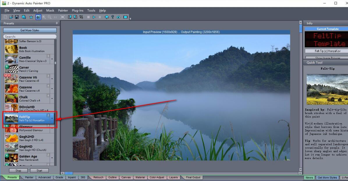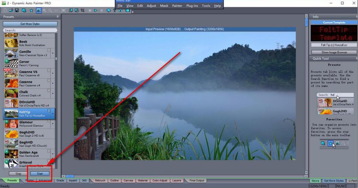 很多人为了画出一幅油画,会先根据油画的构思内容拍摄相关的照片。后续再对照着照片来一点点描绘变成油画。可是这样做,整个过程会耗费很多时间,而且还会经常需要反复修改、重画。为了解决这问题,我们可以用Dynamic Auto Painter Pro将照片变为油画。而考虑到很多人没操作过,下面为大家讲解如何用Dynamic Auto Painter Pro将照片变为油画。  Dynamic Auto Painter Pro如何将照片变为油画? 1、首先,我们打开Dynamic Auto Painter Pro,点击界面左上方的“OPEN”按钮。  2、在弹出的窗口中,选择需要变成油画的照片,并点击“打开”按钮,将其导入Dynamic Auto Painter Pro。  3、然后,我们在Dynamic Auto Painter Pro的界面左侧,可以看到很多油画模板,我们点击选择自己喜欢的模板。  4、接下来,我们点击界面左下方的“Start”按钮,Dynamic Auto Painter Pro便开始对照片应用所选的油画效果。  5、在Dynamic Auto Painter Pro界面右下方,我们可以实时了解到照片变成油画的进度,耐心等待渲染完成即可。  6、最后,我们可以看到Dynamic Auto Painter Pro将照片变成油画的效果,如下图。  想要将自己拍的照片变成油画,让照片更有艺术感,呈现出它的独特美,就可以用Dynamic Auto Painter Pro将照片变成油画。而且它将照片变油画的渲染速度是非常快的,往往就只需要几秒钟。 -