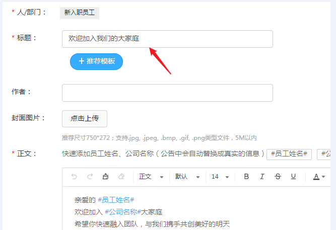 钉钉是很多公司企业使用的一款办公软件,每当有新员工入职,管理员可以在钉钉中发布欢迎公告,为了免去手动发送的麻烦,小编建议设置自动发送员工欢迎公告。钉钉新员工欢迎公告怎么设置?详情请看文章说明。 钉钉如何设置新员工欢迎公告? 在电脑中打开钉钉,输入管理员或子管理员账号,登录软件,在左侧菜单栏点击【工作】,  进入工作台,查看应用列表,点击【公告】应用,  进入公告列表,点击右侧的【新员工欢迎公告】按钮,  进入新员工欢迎公告填写界面,点击【推荐模板】按钮,自动生成预设的模板内容,  然后针对模板内容进行修改,标题、图片、具体14. 因为我知道你是个容易担心的小孩,所以我将线交你手中却也不敢飞得太远。文字内容,  点击【员工姓名】和【公司名称】,可以在合适的位置插入,发布后会自动显示新员工对应的信息;另外,你还可以上传附件,填写完成,点击【保存】即可。  在新员工入职、加入钉钉之后,就会立刻收到系统发送的欢迎公告,感受企业关怀。了解更多精彩教程资讯,关注wmzhe.com。 钉钉如何设置新员工欢迎公告?系统自动发送,无需手动传输六神无蜻蜓点水坚强不屈主2. 心有水云间,处处桃花源。执一份心的静好,闲看红尘多纷扰,用一颗简单、惜缘、留白的心怀,在这娑婆迷离的人间行走。73. I was totally engaged in my study and seldom paid attention to my mother's feelings.(2011.江苏)174.浮云游子意,落日故人情。《送友人》 闻琴解佩神仙侣,挽断罗衣留不住。劝君莫作独醒人,烂醉花间应有数。君不见,高堂明镜悲白发,朝如青丝暮成雪。钉钉It gives rise to (lead to / bring / create) a host of problems (consequences). |