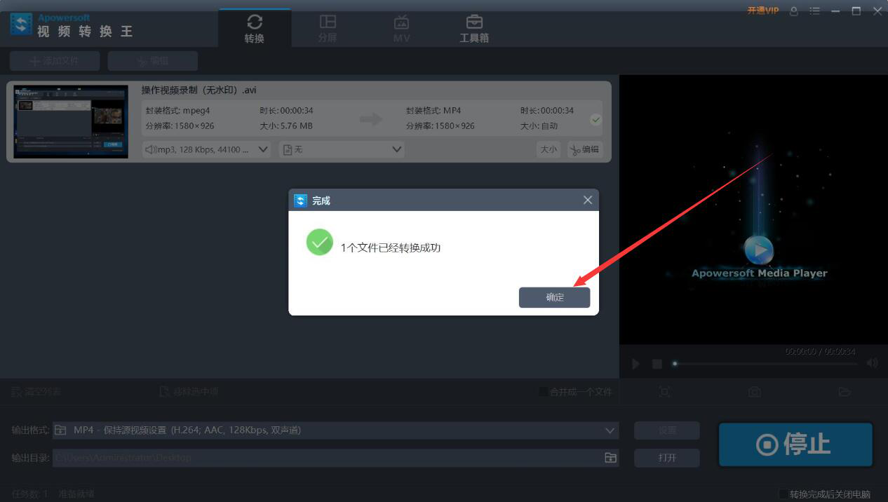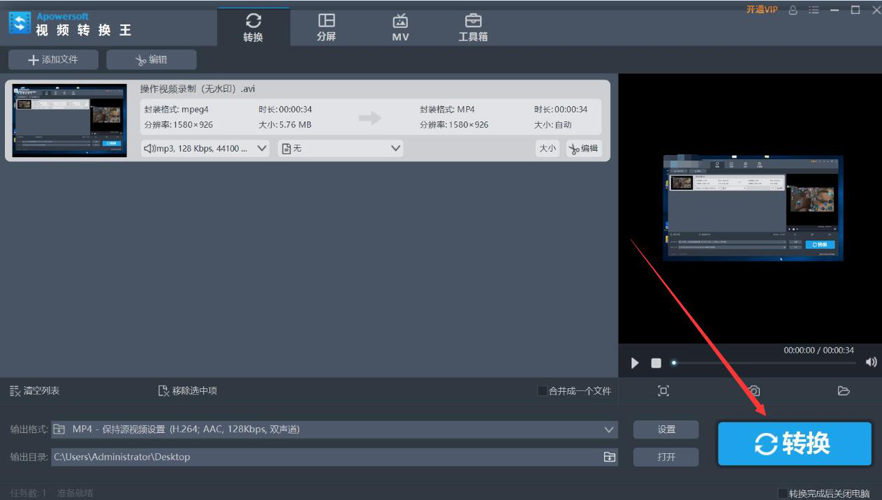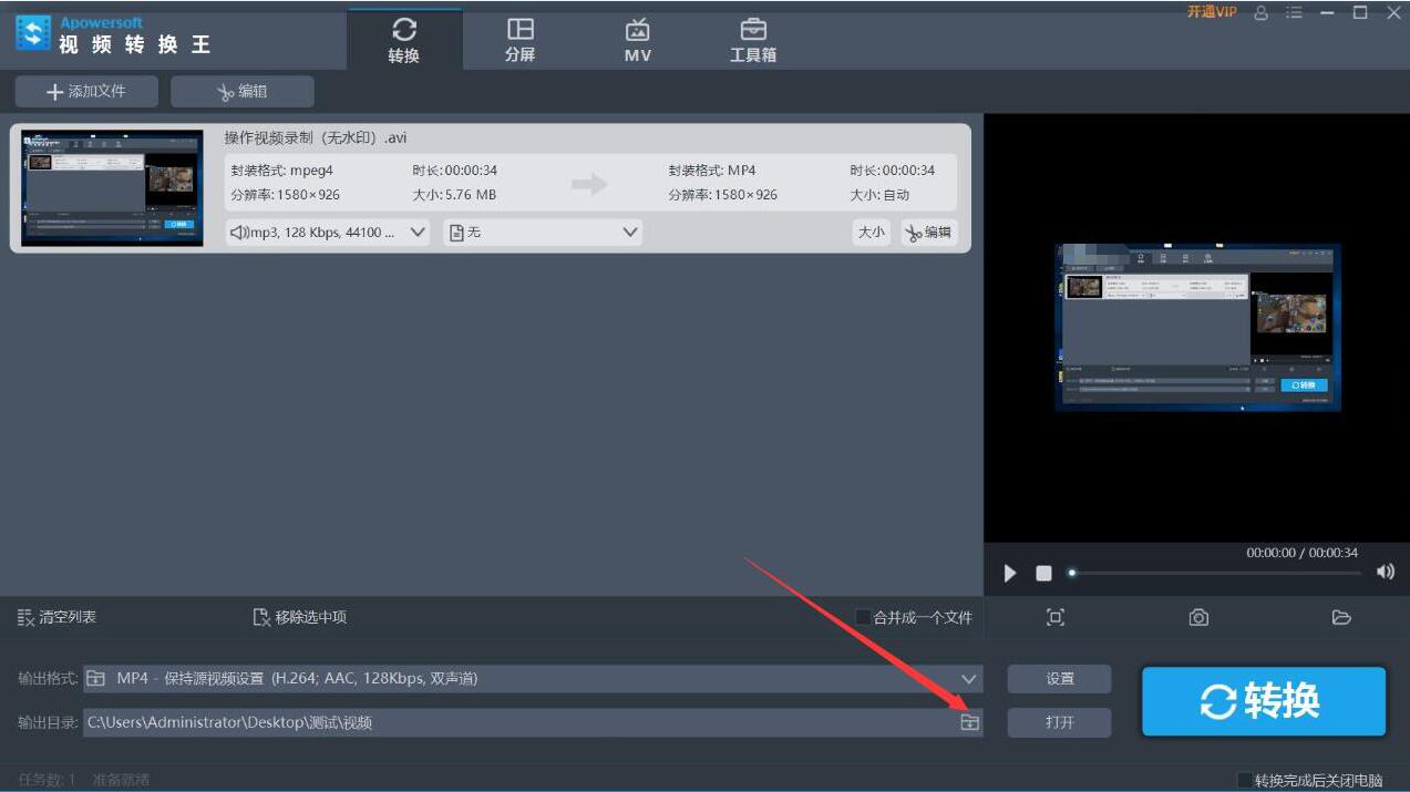 很多人说自己花了大量的时间制作出了AVI格式的视频,本想在电脑中进行视频回放,可怎么打都打不开,试过直接将视频的后缀更改为“*.MP4”,结果搞得文件损坏了。为了解决这问题,我们可以用视频转换王把AVI转MP4,因为MP4是通用的格式。考虑到很多人不懂操作,下面就为大家讲解视频转换王如何把AVI转MP4。  视频转换王如何把AVI视频转为MP4格式? 1、首先,我们打开视频转换王,在界面的左上方点击“+添加文件”按钮。  2、在弹出的窗口中,我们将需要转为MP4的AVI视频文件选中,并点击“打开”按钮,将其导入视频转换王。  3、然后,我们在视频转换王的输出格式中可以看到视频格式是AVI,想要转为MP4,就点击如下图的倒三角按钮。  4、此时,视频转换王就会弹出输出格式的设置窗口。我们选择MP4,并根据自己需要来选择画质,例如,我们选择的是保持源视频设置。  5、接下来,如果转为MP4的视频的输出目录需要修改,就点击如下图的文件夹图标按钮。  6、在弹出的窗口中,选择AVI视频转MP4后的保存路径,再点击“确定”按钮。  7、完成输出的格式和目录的设置后,我们点击界面右下方的“转换”按钮,视频转换王便开始将AVI视频格式转MP4。  8、最后,弹出“完成”窗口,说明视频转换王已成功将AVI视频转为MP4格式,并将它保存起来,我们点击窗口中的“确定”按钮即可。  AVI格式的视频打不开?我们可以用视频转换王将它转换为MP4格式。而且它非常人性化,在输出MP4格式的时候,可以根据自己对画质的需要选择对应的画质选项,转换的速度也很快,是一款处理视频格式时非常实用的软件。 -