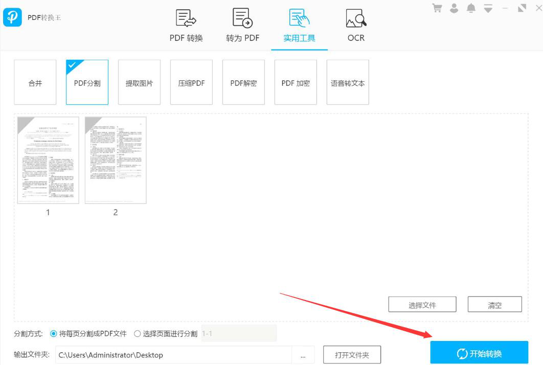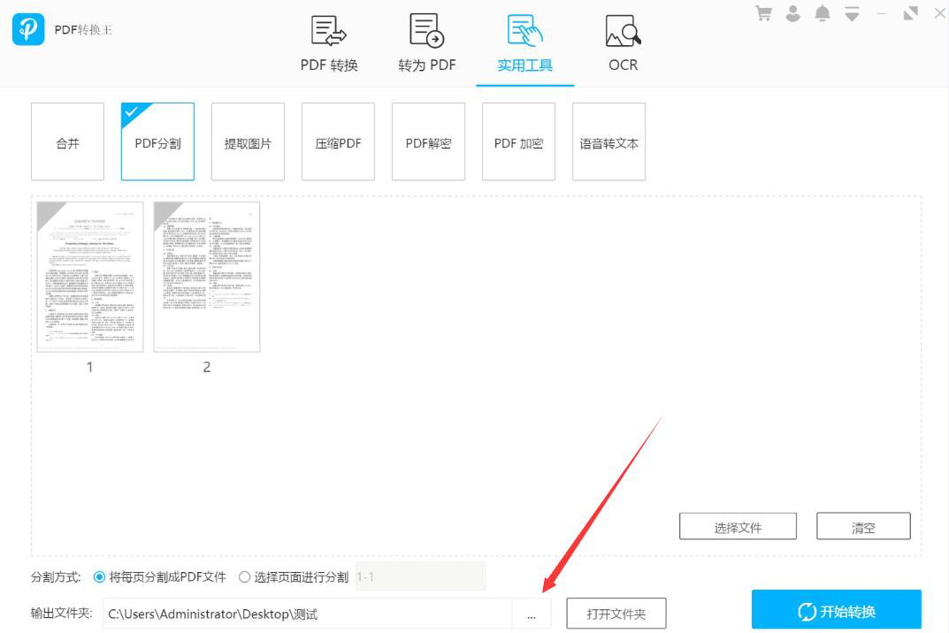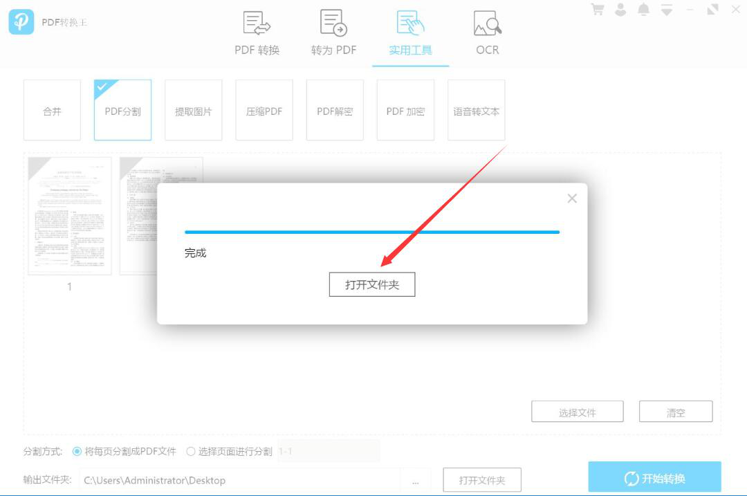 在工作中,我们经常会收到同事或者29. 人生难免要遭遇挫折与失败,与其用泪水洗刷悔恨,不如用微笑去迎接新的挑战。客户发来的PDF文件。特别是遇到那些页数很多的PDF文件,看着的时候,会觉得很有心理压力。为了解决这问题,我们可以用PDF转换王分割PDF文件,根据内容来分割,这样一来,看起来更方便了。只是很多人不懂操作,所以,下面为大家讲解PDF转换王如何分割PDF文件。  PDF转换王如何分割PDF文件? 1、首先,我们打开PDF转换王,切换至“实用工具”操作界面,选择“PDF分割”,并点击界面中部的“选择文件”按钮。  2、在弹出的窗口中,将需要分割的PDF文件选中,并点击“打开”按钮,将它导入PDF转换王。  3、然后,在PDF转换王的PDF分割界面中,根据自己的需要选择PDF的分割方式。  4、接下来,PDF的分割方式设置好后,如果PDF分割后的输出路径要修改的话,就点击如下图的“…”按钮。  5、此时,PDF转换王便会弹出浏览文件夹窗口,我们选择PDF文件分割后的保存路径,再点击“确定”按钮。  6、PDF文件分割的方式和输出路径设置好了后,点击界面右下方的“开始转换”按钮,PDF转换王便开始执行分割PDF文件的命令。  7、最后,当弹出如下图的窗口提示时,说明PDF转换王完成了PDF文件的分割和保存,点击“打开文件夹”按钮,即可快速打开分割后的PDF文件。  PDF文件页数太多,而且内容上并没有太多的关联,为了阅读的方便,我们可以用PDF转换王来分割PDF文件。不过,要注意的是,要根据自己的需求来选择PDF文件分割的方式,这样分割出来的PDF文件才方便阅读。 -