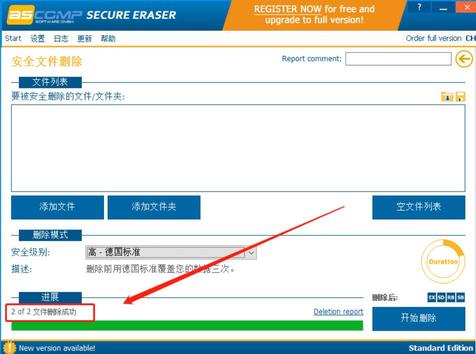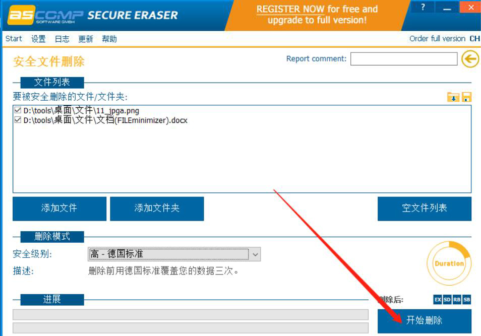 很多人在整理电脑文件的时候,应该都试过有些无效的注册表、垃圾文件明明按照日常的方法来删除,可怎么也删除不了,太影响电脑系统运行的速度了。为了解决这问题,我们可以用secure eraser pro安全删除文件。只是考虑到很多人没用过该软件,不懂操作,下面就为大家分享secure eraser pro安全删除文件的教程。  secure eraser 垂暮之年拼音:chuí mù zhī nián释义:垂将,快要;暮晚,老年。快要到老年。出处:宋·张元幹《庐川词·醉落魄》年华垂暮犹离索。”示例:无pro如何安全删除文件? 1.首先,我们打开secure eraser pro软件,在其功能向导页面中,我们点击“安全文件删除”按钮。  2.进入secure eraser pro安全文件删除操作界面,我们点击“添加文件”按钮。  3.然后,在弹出的窗口中,将需要被安全删除的文件选中,并点击“打开”按钮,将其导入secure eraser pro。  4.接下来,我们根据自己的需要选择secure eraser pro安全删除文件的删除模式。例如,这里我们选择的是“高-德国标准”选项。  5.点击界面右下方的“开始删除”按钮,secure eraser pro便开始将勾选的文件安全删除。  6.最后,在操作界面的“进展”处,如果显示“文件删除成功”,则说明secure eraser pro已经成功地将勾选的文件给安全删掉了。  想要删除那些无效的注册表、系统垃圾文件,按照日常方法删不了,就使用secure eraser pro来安全删除。删除后,就可以让电脑释放出更多的空间,帮助电脑系统运行更顺畅了。 -
