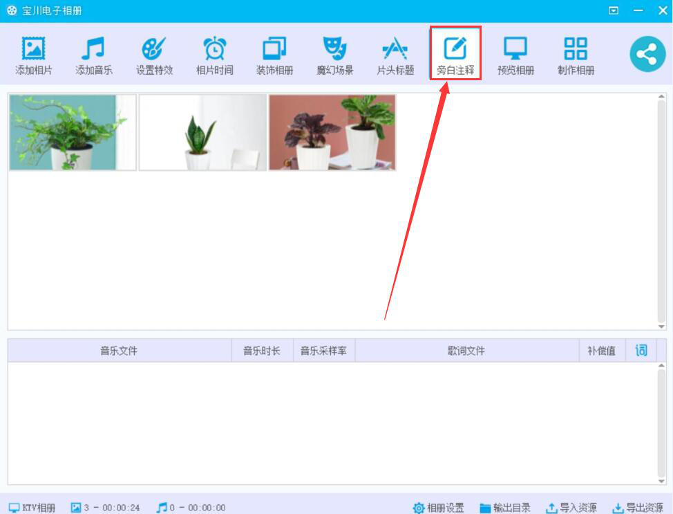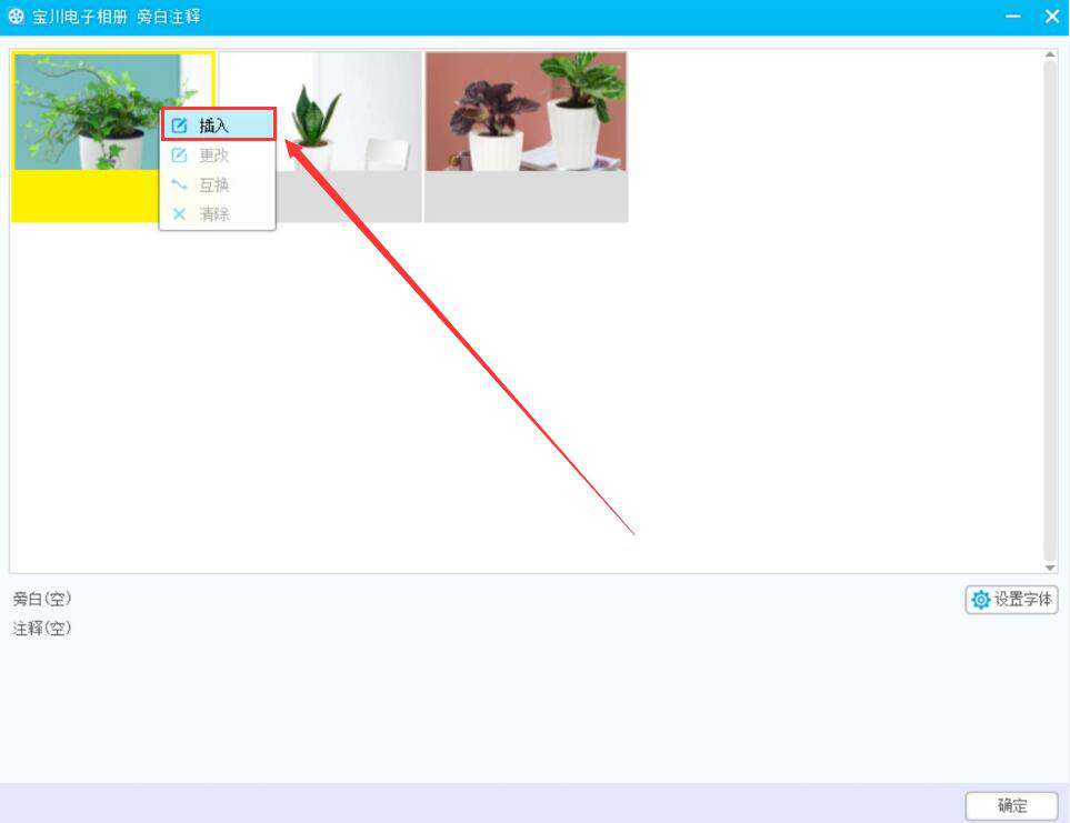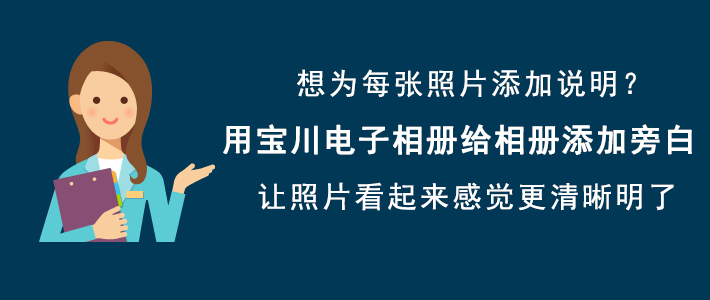 很多人在做电子相册的时候,就是简单地将照片做成视频的样子。可是当看回电子相册的时候,却发现照片给人传递的信息不够明朗。为了解决这一问题,我们可以用宝川电子相册给相册添加旁白,这样照片就更清晰易懂了。考虑到很多人没操作过该软件,所以,本文为大家讲解如何用宝川电子相册给相册添加旁白。  宝川电子相册如何给相册添加旁白? 1、首先,我们打开宝川电子相册,在其操作界面的左上方,点击“添加照片”。  2、在弹出的窗口中,将需要添加旁白的照片一并选中,点击“打开”按钮,将其导入宝川电子相册。  3、然后,在宝川电子相册的操作界面中,点击菜单栏中的“旁白注释”选项。  4、进入宝川电子相册的旁白注释设置窗口,我们右键单击第一张图片,并在弹出的右键菜单中点击&ld7. 梯子的梯阶从来不是用来搁脚的,它只是让人们的脚放上一段时间,以便让别一只脚能够再往上登。quo;插入”按钮。  5、此时,宝川电子相册便会弹出旁白注释编辑的窗口。我们输入旁白文本内容和注释文本,如下图,输入完成,点击“确定”按钮。  6、同样的办法,我们用宝川电子相册完成对所有导入的照片添加旁白,如果需要更改旁白字体的格式,就点击窗口右侧的“设置字体”按钮。  7、根据自己的需要,对旁白的字体加以设置,设置完成,点击窗口右下方的“确定”按钮。  8、宝川电子相册给相册添加了旁白,我们回到主操作界面,点击菜单栏中的“添加音乐”选项。  9、在弹出的窗口中,将自己喜欢的音乐文件选中,并点击“打开”按钮,将它导入宝川电子相册。  10、接下来,我们点击宝川电子相册菜单栏中的“制作相册”按钮。  11、在弹出的制作相册设置窗口中,设置添加了旁白的电子相册的保存参数,例如画面大小、画质、输出目录等等,设置好了,点击窗口右下方的“制作”按钮,宝川电子相册便开始制作添加了旁白的相册。  我们在做电子相册的时候,为了让每一张照片给人传递的信息完整、清晰、明了,都可以用宝川电子相册给相册添加旁白。不过要注意的是,每张照片所添加的旁白字数要尽量精简。 -
