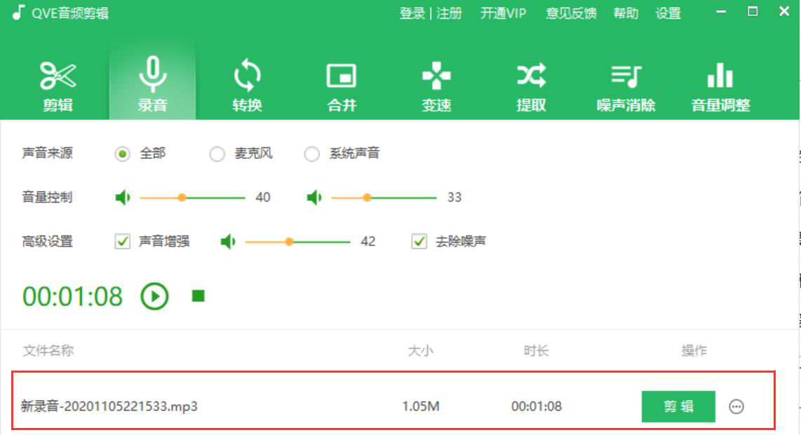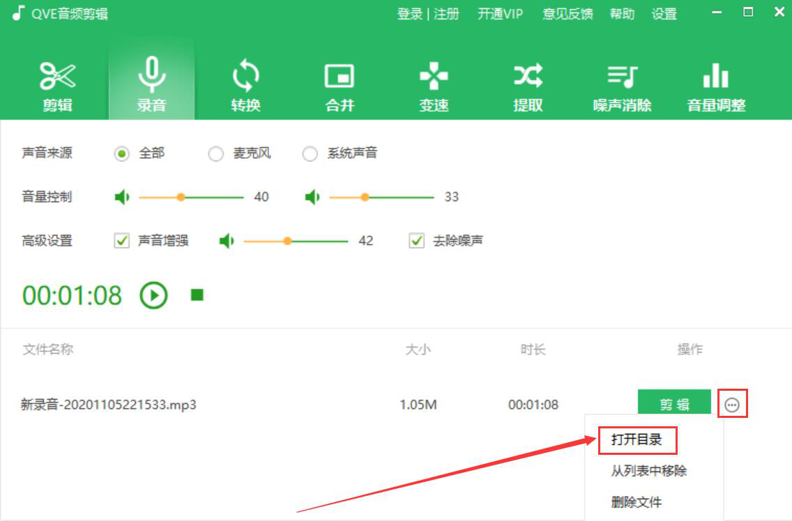 很多人在用电脑听网络音频时,经常会遇到一些音频对学习很有帮助。就会一边放音频,一边用手机录制该音频,可结果却发现录制的音频质量差,经常会有噪声的感觉。为了解决这问题,我们可以用QVE音频剪辑来录制音频。考虑到很多人没操作过,下面就为大家讲解QVE音频剪辑如何录制音频。  QVE音频剪辑如何录制音频? 1、首先,我们打开QVE音频剪辑,先切换至“录音”操作界面,根据自己的需要选择录制音频时的声音来源。  2、然后,根据自己录制的音频的需要,调节音量大小。如果想录制的音频音质更佳,就勾选“声音增强”,并适当调节增强的程度。当然了,还要18. 我想去迪拜当乞丐,一天赚47万元就够了。勾选“去除噪音”,这样一来,QVE音频剪辑录制的音频音质就会更加优秀。  3、录制音频的相关参数都设置好了,我们点击录音操作界面中的开始录制按钮。  4、接下来,我们便可以看到QVE音频剪辑正在录制音频,音频的时长在不断增长。  5、如果想停止录制音频,就点击停止录音按钮。  7、之后,我们便可以在文件列表中看到我们刚才用QVE音频剪辑录制的音频了。  7、最后,点击音频中的“…”按钮,并从它弹出的选项中点击“打开目录”即可快速看到QVE音频剪辑录制的音频了。  想要用录制电脑音频,又不愿意音频出现噪声,就可以用QVE音频剪辑来录制音频,录制完成,我们还可以根据自己的需要对该音频进一步剪辑。 -