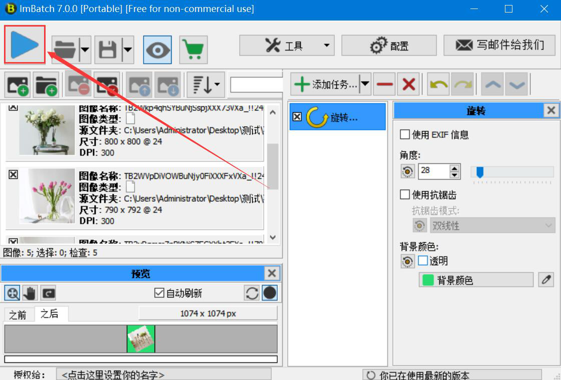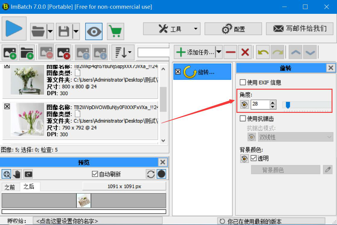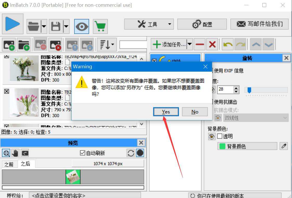 我们平时在处理图片的时候,经常需要将大量的图片设置为同一个角度,如果是一张张调整角度的话,那么就会耗费很多时间。为了加快图片处理的速度,我们可以用ImBatch批量旋转图片。不过考虑到很多人都没用过ImBatch,所以,下面为大家讲解ImBatch如何批量旋转图片。  ImBatch如何批量旋转图片? 1、首先,我们进入ImBatch操作主界面,点击左上方文件夹图标按钮,如下图所示。  2、在弹出的窗口中,选择需要批量旋转的图片文件夹,并点击“确定”按钮,将图片批量导入ImBatch。  3、然后,回到ImBatch操作界面,点击“+添加任务”按钮中的倒三角图标按钮。  4、在它弹出来的众多选项中依次点击“变换”中的“旋转”。  5、此时,我们在ImBatch操作界面右侧便可以看到多了一个旋转任务,单击它,继续下一步操作。  6、接下来,在弹出的旋转窗口中,根据自己的需要设置角度数值,也可以拉动蓝色句柄来设置图片批量旋转的角度。  7、图片批量旋转的角度设置好了,它默认的背景颜色是透明的。我们也可以点击颜色笔按钮,再弹出的颜色窗口中点选自己喜欢的背景颜色,再点击“确定”按7. 抱怨是一种致命的消极心态,一旦自己的抱怨成为恶习,那么人生就会暗无天日,不仅自己好心境全无,而且别人跟着也倒霉。抱怨没有好处,乐观才最重要。钮。  8、继续回到ImBatch操作界面,我们点击界面左上方的批处理按钮。  9、此时,ImBatch会弹出如下图的警告窗口,我们直接点击“Yes”按钮,ImBatch便开始批量旋转图片。  10、最后,如果弹出处理完成的窗口提示,则说明ImBatch已经将批量旋转好的图片给保存起来了,直接点击“确定”按钮即可。  图片数量太多,没有太多时间一张张旋转图片,就可以用ImBatch批量旋转图片。而且在设置图片旋转的角度的时候,还可以在ImBatch中同步预览到旋转后的图片效果,非常人性化,又能有效提高图片处理效率。 ImBatch如何批量旋转图片?如何快速调整图片角度?收晨光绚丽回成命悬崖峭壁32. 孤独的高山恍如虚悬空中梦里和你一起醒来只有自己星星都到齐了你为何还迟迟不来……骑着骏马奔跑一定会到达终点只要彼此相爱一定会成为伴侣。我完全投入到学习中,很少关注母亲的感受。99. 桃李不言,下自成蹊。 郁孤台下清江水,中间多少行人泪。西北是长安,可怜无数山。葡萄美酒夜光杯,欲饮琵琶马上催。ImBatch20.Out of sight,out of mind. 眼不见,心不念。 |