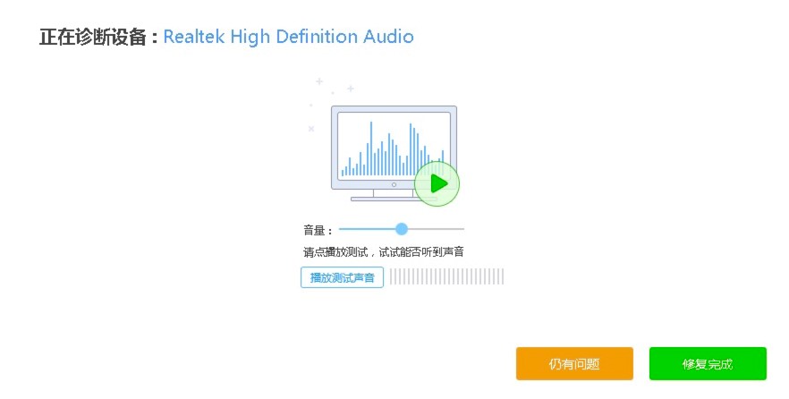 日常使用电脑办公,大家可能会遇到各种问题,例如电脑没有声音,有可能音是声音音效异常,也有可能是插入耳机没有反应。遇到这些状况,很多人不知道如何解决,其实我们可以通过驱动精灵来修复电脑声音异常,现在就来一起了解! 驱动精灵如何修复电脑系统声音问题? 打开驱动精灵,进入软件主页面,在上方菜单栏点击【百宝箱】,选择【声音修复】功能,  进入声音修复界面,我们在这里首先需要选择的是诊断的音频设备,再点击【立即诊断】按钮,  进入自动诊断过程,耐心等到,诊断结果出来之后,这里显示“声卡配置异常”,点击【立即修复】,等待修复完成,电脑声音问题就能够解决了。  如果用户想要测试问题是否已经解决,点击【播放测试声音】按钮,然后试听该电脑的声音效果即可验证。  如果还有问题存在,点击【仍有问题】,驱动精灵就会继续对电脑进行检测和修复。了解更多精彩教程资讯,关注wmzhe.com。 4. 我想当医生,可以给所有不乖的爸爸妈妈打针。 -