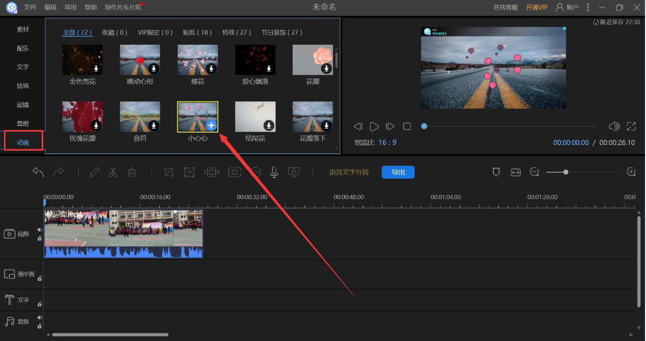 我们平时拍完视频后还会对视频进行一些后续的处理,比如说剪切视频、添加字幕等等。可是很多人都发现了,如果仅仅是视频的话,总感觉有点单调乏味。为了解决这问题,我们可以用视频编辑王给视频添加动画,这样一来,整个视频的观影体验一下子就提升了。考虑到很多人没操作过,所以,下面为大家讲解视频编辑王如何给视频添加动画。  视频编辑王如何给视频添加动画? 1、首先,我们打开视频编辑王,选择和自己的视频比例最为接近或者一样的比例,这里选择的是常用的宽屏16:9。  2、进入视频编辑王的操作界面,点击“导入”按钮,并在其选项中点击“导入文件”。  3、然后,在弹出的窗口中,将需要添加动画的视频文件选中,并点击“打开”按钮,将其导入视频编辑王。  4、回到视频编辑王的操作界面,我们单击刚才导入的视频素材,它便会出现一个“+”号,我们点击“+”号,将该视频加载到视频编辑轨道,如下图所示。  5、接下来,我们在视频编辑王的操作界面左侧,点击切换至“动画”选项,可以看到它有很多动画效果,点击自己喜欢的动画效果,即可自动下载并应用。例如这里,我们要给视频添加的是小心心的动画。  6、动画效果下载完成,我们单击它并按住鼠标左键将它拖放至视频编辑轨道的视频后面,如下图所示。  7、接着,我们可以点击视频预览窗口下方的播放按钮预览视频添加动画的效果,如果满意的话,就继续点击“导出”按钮。13. 分手快乐,放手是种解脱。香烟爱上火柴就注定被伤害,在爱的世界里没有谁对不起谁,只有谁不懂得珍惜谁。  8、视频编辑王弹出导出窗口。我们根据自己需要来输入名称、设置输出目录、选择视频格式和质量,再点击“导出”按钮。  9、此时,我们可以在视频编辑王弹出的视频加动画的窗口中实时了解到具体的导出进度。  10、最后,导出完成,我们点击“打开文件夹”按钮可以从保存路径中查看该视频文件。或者也可以点击“播放”按钮立即播放视频编辑王给视频添加动画后的效果。  现在越来越多人喜欢在视频的片尾添加动画效果,让整个视频变得更加高大上或者趣味无穷。而给视频添加动画,往往都会用到视频编辑王。因为它含有丰富的动画效果模板,点击可以下载并应用,轻轻松松就能帮我们做出高质量视频作品。 视频编辑王如何给视频添加动画?百花争白浪胸无点墨滔天艳17. 无论是什么样的感情,能够遇见,就是一种缘分,即使最后没有达成你心里想要的结果,也不要过于自责,因为在这个过程中,或多或少都曾有过快乐在你身边围绕,感情中没有太多的对错之分,能够彼此理解,彼此懂得就是莫大的幸运。come up with 提出;make (good) use of (充分) 利用陈子昂144.前不见古人,后不见来者。念天地之悠悠,独怆然而涕下。《登幽州台歌》 蝶恋花 赵令畤戍楼西望烟尘黑,汉兵屯在轮台北。视频编辑王,视频编辑,动画15.Look before you leap. 三思而后行。 |