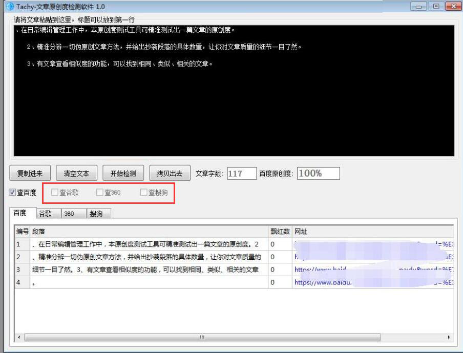 对于文案工作者来说,经常要和文章打交道。有些客户要求的原创度高,自己写完文章后,为了不落下抄袭的骂名,有些人是再三翻阅资料,生怕重复。其实,我们可以直接用Tachy检测文章原创度。只是很多人没操作过,不懂该怎么检测,所以,下面来为大家讲解如何用Tachy检测文章原创度。  蔽明塞聪拼音:bì míng sè cōng释义:蔽遮;聪听觉灵敏;明看得清楚。蒙住眼睛不看,堵塞耳朵不听。指对外界事物不闻不问。出处:宋·曾巩《洪范传》夫然,故蔽明塞聪,而天下之情可坐而尽也。”示例:无Tachy如何检测文章原创度? 1、首先,我们将需要检测原创度的文章复制,再打开Tachy软件。  2、然后,在Tachy的黑色窗口中,粘贴刚才复制的文章,如下图所示。  3、接下来,我们通过组合键“Ctrl+A”全选整篇文章,然后选择想要检测的浏览器,例如这里,我们要查的是百度,就勾选“查百度”,再点击“开始检测”按钮,Tachy便开始检测文章原创度。  4、此时,我们可以看到Tachy检测文章原创度的结果,还有这篇文章的整体字数、每个段落的飘红字数,如下图所示。  5、一般情况下,为了让Tachy全面检测文章的原创度,我们不仅会勾选“查百度”,还会同时勾选“查谷歌”、“查360”、“查搜狗”。  6、最后,我们点击“拷贝出去”按钮,便可以将刚才用Tachy检测的文章原创度的文章给拷贝到其他文档中。  每次写完文章,想要了解文章有没有和别人写的重复,就可以直接用Tachy检测文章原创度。它支持同时检测4个主流的浏览器,检测速度快,飘红的文字部分便是非原创的,方便我们更清晰了解文章原创度。 Tachy如何检测文章原创度?文章原创度查询方法洪水猛兽东倒西三番五次歪10. 当第一缕阳光照耀大地的时候,我们便和千千万万的中学生一样,开始了漫长的求学之路。走进教室,再也找不见小时候踏入这里的欣喜,取而代之的竟是无比的压抑。看着那一张张陌生的脸,心中又升起点点惆怅。昔日那熟悉的脸庞,如今早已不知去向。如果您能尽早回复,我们将不胜感激。38.言必信,行必果。 凤箫吟 韩缜古者世称大手笔,此事不系于职司。Tachy26.live not to eat,but eat to live. 活着不是为了吃饭,吃饭为了活着。 |
