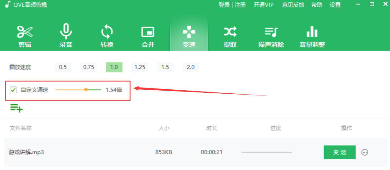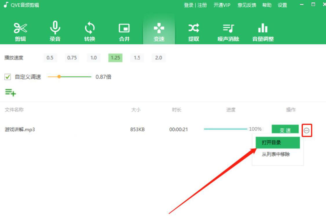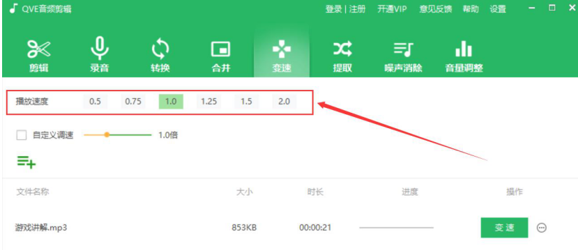 为了学习的需要,我们经常会在网上下载很多音频文件。可是当我们听的时候,却发现音频的播放速度要么太快了,要么就是太慢了,听起来不舒服。当遇到这样问题时,我们可以用QVE音频剪辑调整音频播放速度。考虑到很多人没操作过,所以,下面来为大家讲解QVE音频剪辑如何调整音频播放速度。  QVE音频剪辑如何调整音频播放速度? 1、首先,我们打开QVE音频剪辑软件,切换至“变速”功能选项操作界面,点击左上方的“+”按钮。  2、然后,在弹出的窗口中,将需要调整播放速度的音频文件选中,并点击“打开”按钮,将其导入QVE音频剪辑。  3、接下来,我们回到QVE音频剪辑,可以看到它默认的播放速度有6种,可以选择其中一种来调整音频播放速度。  4、当然了,也可以勾选“自定义调速”,自由调整它的倍数值来实现音频播放速度的调整。  5、音频播放速度设置好了后,我们点击“变速”按钮,QVE音频剪辑便开始调整音频播放速度。  6、最后,当进度显示100%的时候,说明成功调整了音频播放速度。我们点击变速旁边的按钮,并从它的菜单选项中点击“打开目录”即可快速查看调整了播放速度的音频。  下载的音频播放速度太快了,跟不上?太慢了,听得不耐烦?都可以用QVE音频剪辑来调整音频的播放速度,速度调整后,音质也不会受到影响。 -
