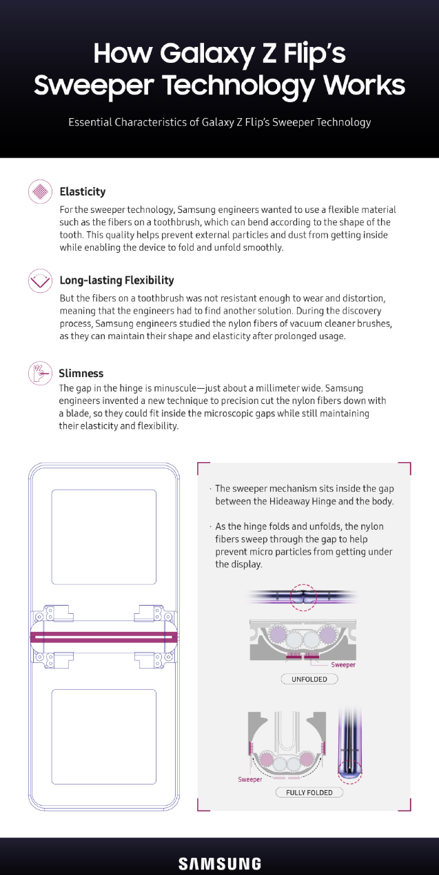 | 内容 | 不知道大家知不知道下半年首发高通骁龙865 Plus处理器的厂商是谁。联想还是华硕?都不是,正确答案是三星。 ![]() 当然,是不是首发对三星GalaxyZ Flip 5G来说并不重要,因为它最突出的卖点是它的屏幕。 从这份参数表就可以看到,三星GalaxyZ Flip 5G对比上半年的Galaxy Z Flip来说,除了机身配色以及材质更换为了AG磨砂玻璃以外,两者在总体的外观设计以及拍照的硬件上没有一丁点的差别。不过,把处理器从高通骁龙855+升级为骁龙865+填补了Galaxy Z Flip不支持5G网络的遗憾(对一些人来说感知不强)。 接下来进正题,聊聊这台折叠屏手机。 可以打电话的“粉饼” 三星有没有考虑过做外折叠屏我们不得而知,但是做竖向折叠这件事,三星已经花样暗示过我们了。 ![]() 在去年的三星开发者大会上,三星就已经预告了Galaxy Z Flip的存在。当时的三星借One UI为多种折叠形态进行适配为名公布了竖向折叠的效果图,只不过没有明说这会是之后的Galaxy Z Flip而已。 ![]() 初看三星Galaxy Z Flip 5G,脑海里浮现的第一个东西就是妹子化妆用的粉饼,因为从它的整体大小和竖向折叠设计来看确实非常相似。三星官方也曾经表示设计的灵感正是来自于粉饼,因此无论是外界还是三星在对它的宣传包装上,更多地向‘女性手机’这个标签上靠近。 ![]() 采用6.7英寸、2636*1080分辨率 动态AMOLED屏幕的三星Galaxy Flip 5G在折起来之后只比常见的粉饼盒大一点点,女生的手掌可以轻松掌握,加上183g的重量,即使放入口袋和裤袋也不会有累赘感。另外,Galaxy Flip 5G在双摄模组旁边还放了一个1.05英寸、112*300分辨率的Super AMOLED外屏。这么小的外屏有什么用处?下面会提到。 另外,改用中置Infinity-O设计之后,三星Galaxy Z Flip 5G在观感上比第一代Galaxy Fold顺眼多了。 ![]() 作为三星第二款折叠屏手机,三星Galaxy Flip 5G对铰链做了大改进,使得机身结构更稳定,铰链连接处严丝合缝,没有再出现某些地方松动的情况。 ![]() 类似的,三星Galaxy Flip 5G在铰链连接处沿用了去年Galaxy Fold改进版上的“T”型保护帽,防止保护膜被损坏以及减少外部异物进入的风险;同时也保留了和Galaxy Fold一样的屏幕垫脚,可以有效实现跌落减震和保护上边框的磨损。 ![]() 三星Galaxy Flip 5G的两半机身各塞进了一块电池,加起来总共3300mAh。虽然大电池对折叠屏手机来说确实有难度,但3300mAh也确实有点小了,尤其是在支持5G网络的情况下。 ![]() 可能是受限于屏幕结构,三星Galaxy Flip 5G仍然采用了侧边电容指纹的设计,不过胜在识别率高,使用上也很方便。 ![]() 同样受限于机身上半身的大小,三星Galaxy Flip 5G仅搭载了后置双摄,一颗1/2.55英寸的1200万像素主摄和1200万像素超广角镜头,两者的传感器尺寸显然更契合Flip 5G的上半身的机身大小。1.05英寸的外屏放置在双摄模组旁边,大小稍微比双摄模组长一点,毕竟对称性从来不是三星在设计上优先考虑的因素。 ![]() 机身底部是USB Type-C接口,降噪麦和扬声器,3.5mm耳机接口显然是不存在的。Galaxy Flip 5G的听筒并没有内置扬声器,因此它仅有底部一个单扬声器,这大概也是近年来为数不多的没有双扬声器的三星旗舰了。 铰链的一小步,折叠屏的一大步 说说折叠屏的重中之重,铰链。 ![]() 去年不少网友对三星Galaxy Fold的铰链设计不太感冒,纷纷表示友商的铰链设计更有技术含量。虽然改版的三星Galaxy Fold修复了这样那样的问题,但仍然没有打消众多网友和消费者的顾虑。 ![]() 很快,三星用Galaxy Z Flip来证明他们真正的研发实力。 三星Galaxy Z Flip采用了全新设计的铰链,官方称之为‘隐藏式铰链’,虽然名字听起来平平无奇,不过这可是拿到了专利的设计。 ![]() ‘隐藏式铰链’第一个特点是在铰链上增加了纤维屏蔽层,并且在连接处放置了特殊材料制成的细小毛刷,官方介绍说可以在一定程度上避免灰尘和污垢的侵害,尤其是阻止灰尘污垢进入手机内部。 ![]() 图源自iFixit拆解 在iFixit进行防尘测试以及之后的拆解中,我们可以看到在交联结构下面的“保护性”胶带部分,测试中洒入的紫色粉末在这里大量聚集,这样的设计使粉末远离了屏幕并将粉末全部固定在铰链中。如此看来,与其说这样的设计可以防尘,不如说是牺牲铰链的干净来实现即使灰尘和污垢进入手机内部也不会损坏屏幕。 ![]() 图源自iFixit拆解 从另外一张拆解图也可以看到,铰链处的小毛刷和纤维屏蔽层并没有吸纳很多紫色粉末,粉末大都落在了铰链本体上。但不管怎么说,这样的设计还是保住了屏幕,不会再发生初代Galaxy Fold那样的情况。 ‘隐藏式5. 人生如梦,梦如人生,唯有懂得珍惜,宽容,理解,谦让就能真正的拥有一份宁静,一份平淡,一份真情,就能容纳布满尘土与风霜的笑容。也就能让你美好的爱拥有永恒。铰链’的第二个特点就是采用了双CAM结构。简单来说,双CAM结构就是三星Galaxy Z Flip 5G可以实现可以在不同角度打开和固定的幕后功臣。脊形双CAM结构可以视作为调光器,一般的电灯只能打开或关闭开关,而调光器可以提供各种程度的控制;同样的,双CAM结构可提供逐渐折叠的体验,实现多角度悬停的操作。 ![]() 相信看到这里,大家都挺想看看三星Galaxy Z Flip 5G的铰链到底长什么样了。别急,马上来。 ![]() 图源自iFixit拆解 这就是‘隐藏式铰链’的本体。这个小小的又极其精密的小部件的背后,是无数攻城狮付出的巨大心血,不仅让我们亲眼见证了科技的